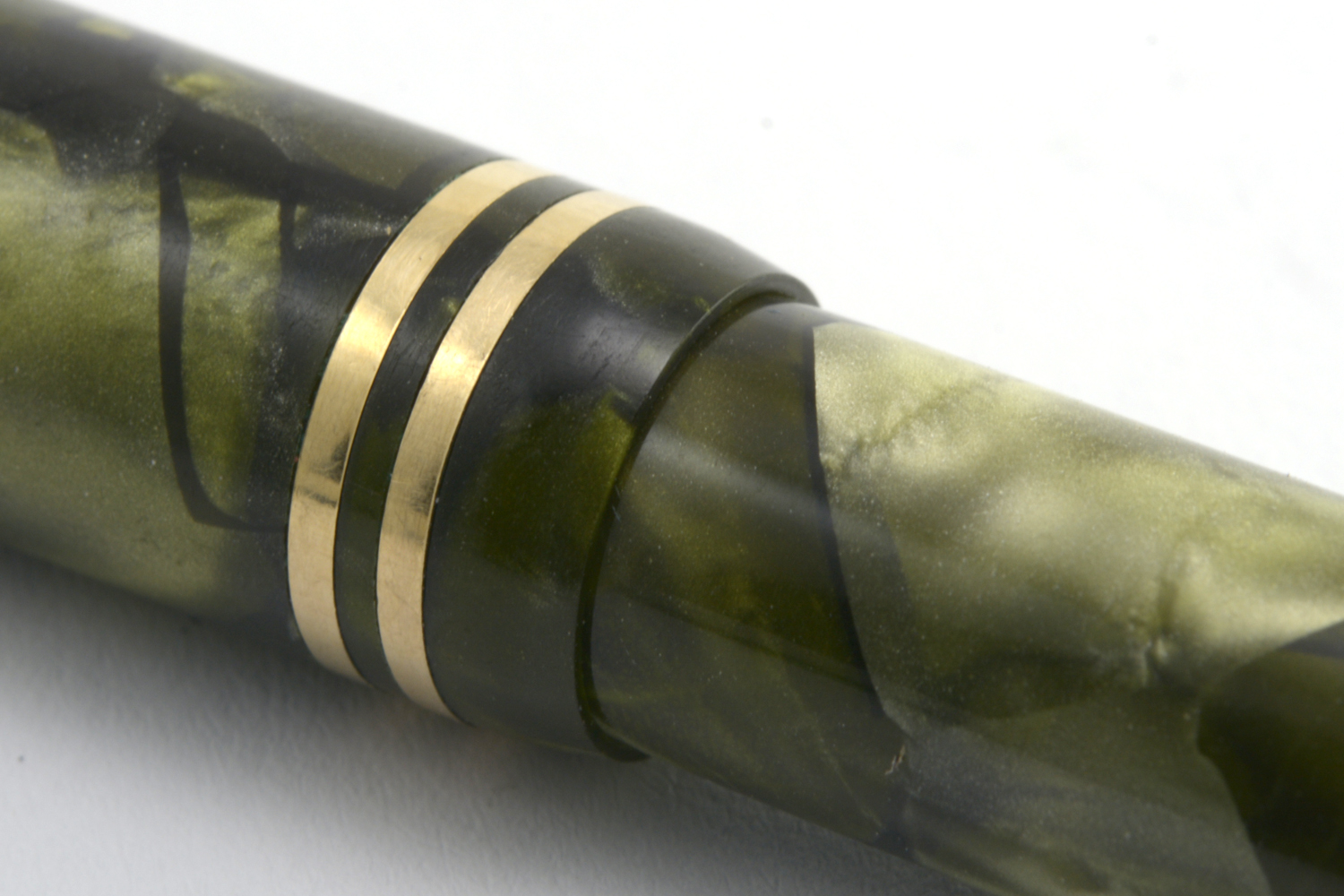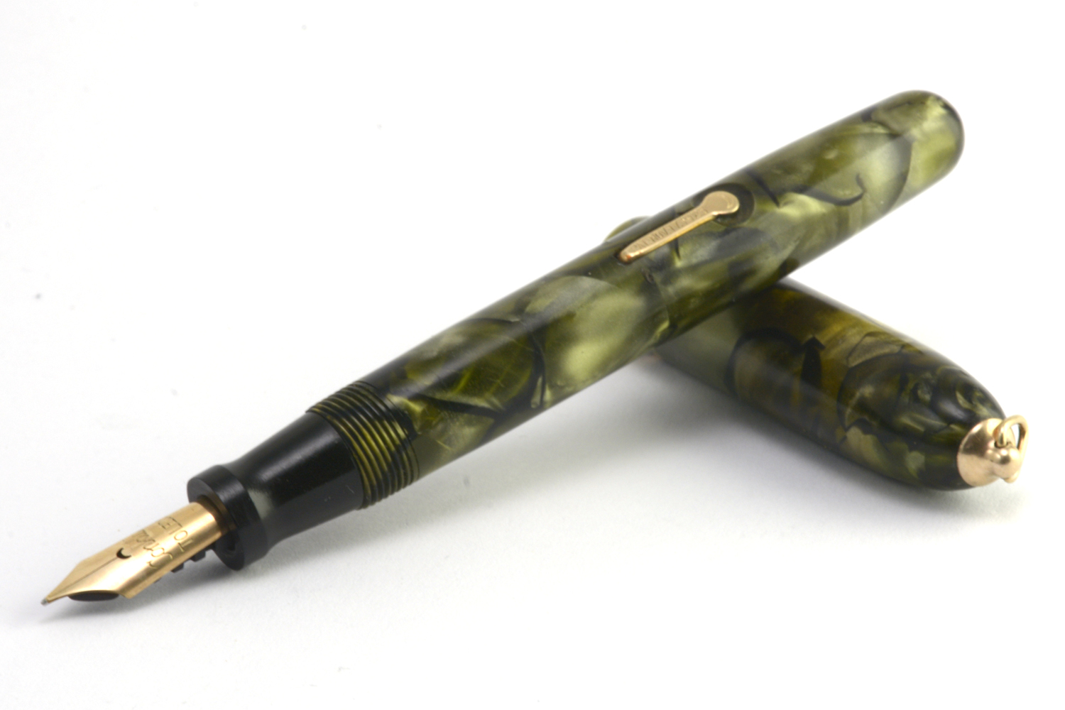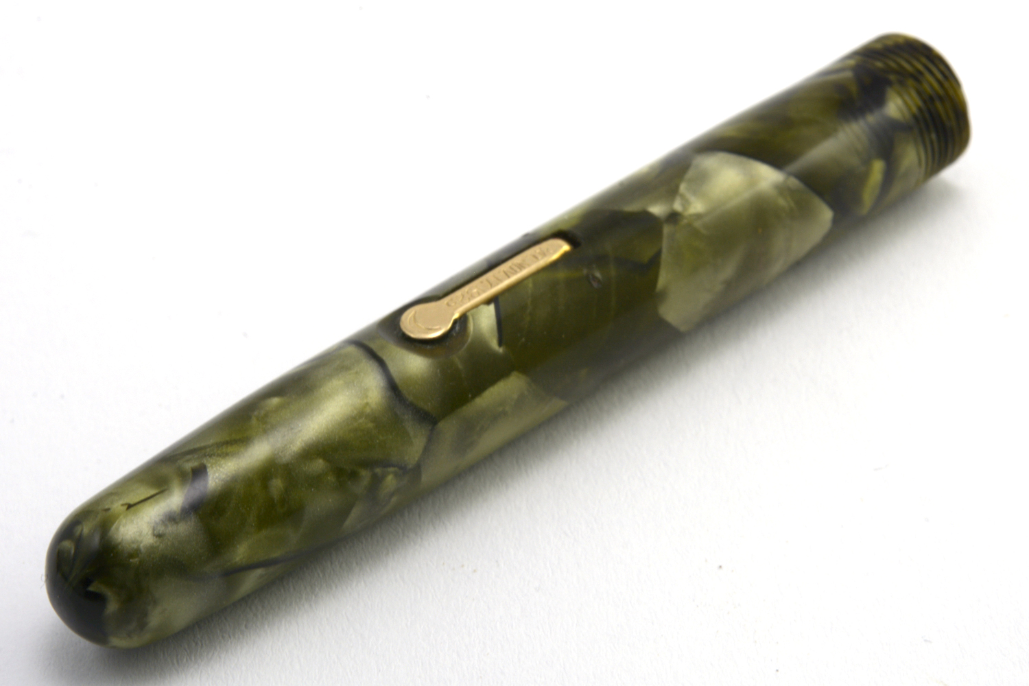 Med tanke på pennans ålder är skicket på denna penna riktigt bra, med riktigt bra förgyllning och skön lyster i färgen. Huven har en svag missfärgning och stiftet har en färgskiftning, troligen till följd av det bläck en tidigare ägare använt. Det framgår inte av stiftet om det är ett förgyllt stålstift eller ett guldstift, men missfärgningen gör att jag misstänker att det är ett förgyllt stift. Pennan har demonterats och fått en rejäl rengöring, fått ny bläcksäck insatt och de skarpa kanterna på det rejält slitna stiftet har slipats till.