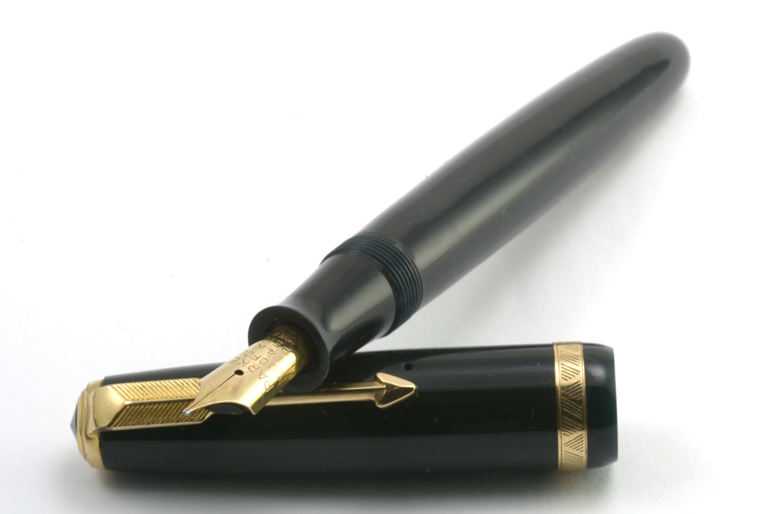 Denna penna – som är i ett fint skick med riktigt fin förgyllning – har jag renoverat åt en samlare i mellan-Sverige och när den dök upp hos mig reagerade jag på dess färg som inte passar in i »mallen». Det är en omisskännlig NS, men dess gröna nyans tycker jag inte kan kallas »äppelgrön» utan pennan verkar snarare ha »ärvt» den mörkt gröna färg (»olive green») som den tidigare NS-modellen fanns att få i.
