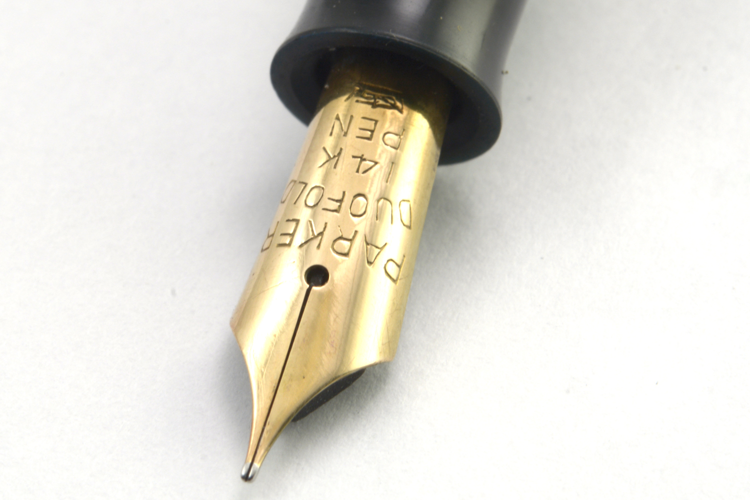 Inskriptionen på stiftet är PARKER | DUOFOLD | 14K | PEN | [NGI-logotyp].