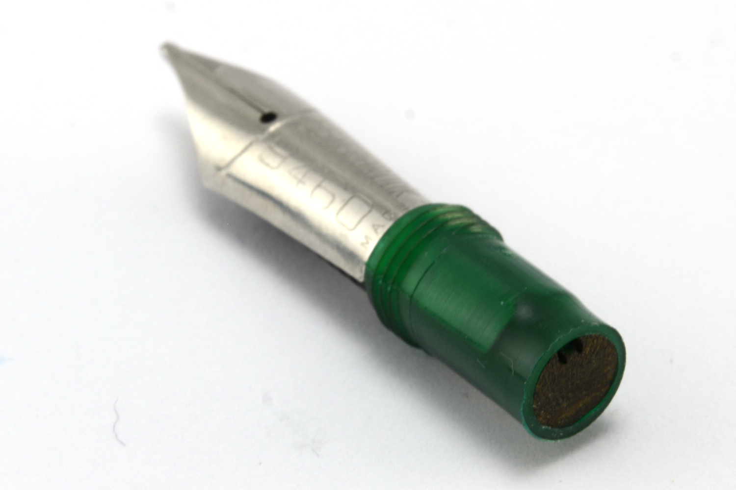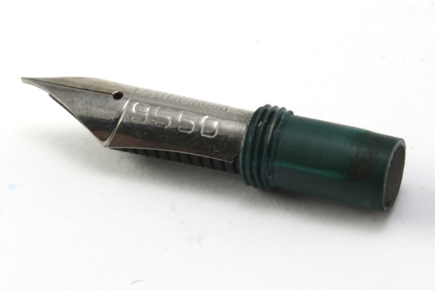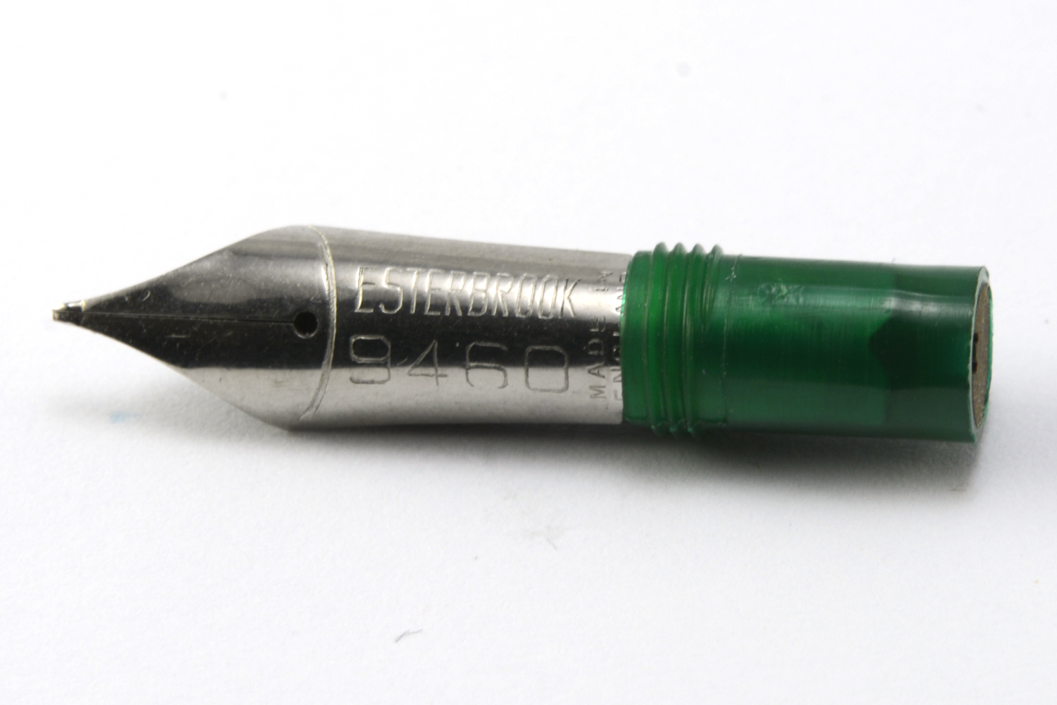 Kommentar: pennan kom med ett Esterbrook 9550 (EF-bredd) som byttes ut mot ett 9460 när sönderplockade pennan fotograferades och mättes, för att sedan få ett bättre vardagsstift till dess bilderna på den sammansatta pennan togs.