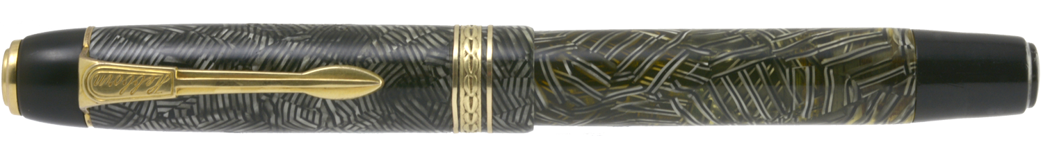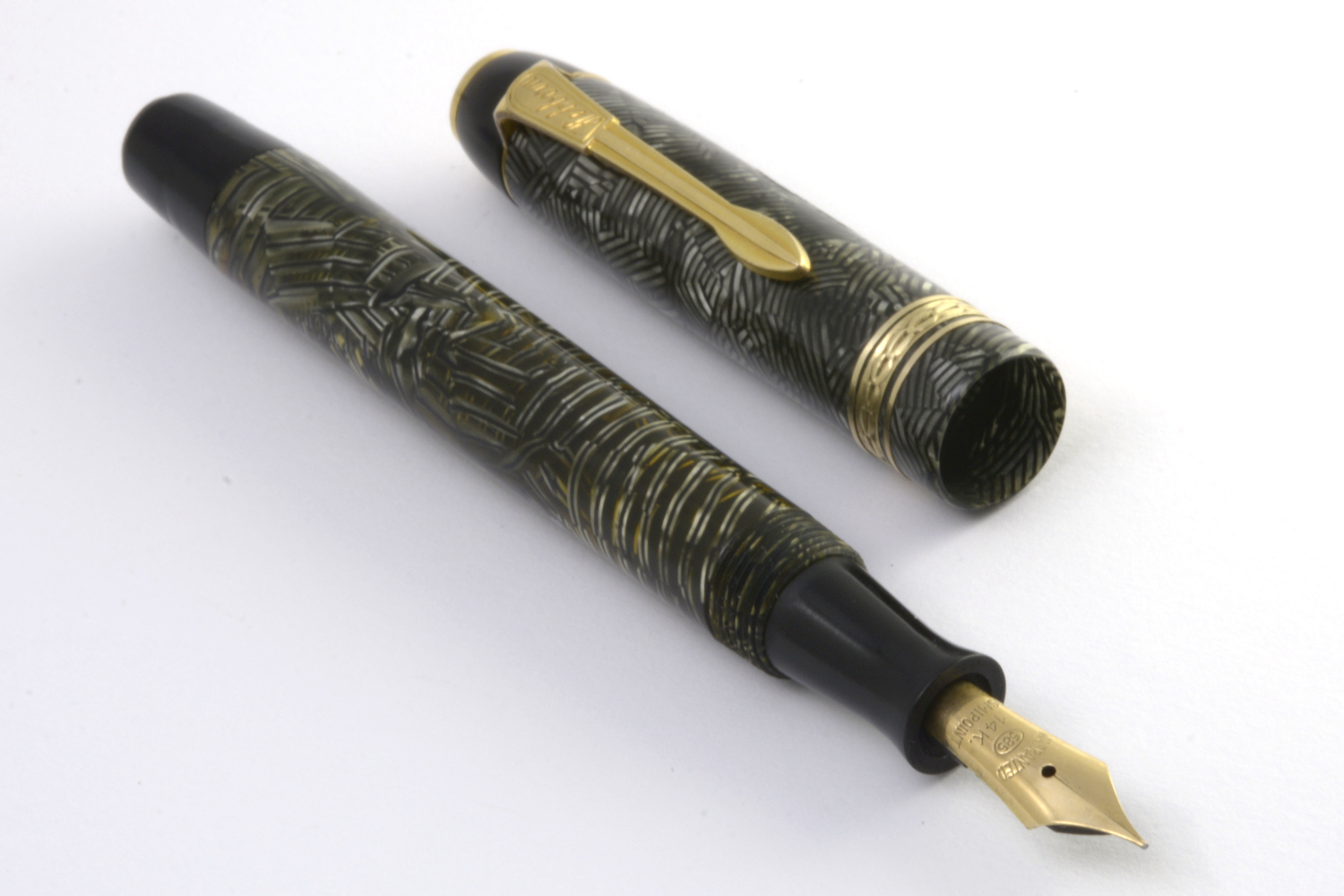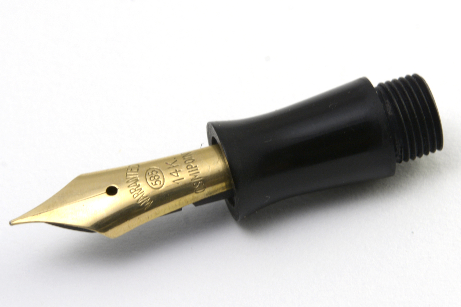 Pennans guldstift är inte märkt Luxor utan Osmipoint, vilket antyder någon koppling till Osmia. Om pennan ska dateras till första hälften av 1940-talet – vilket jag gissar – är stiftet troligen ett ersättningsstift eller ett stift som legat i lager i Sverige och som sattes på pennan i samband med försäljningen. På pennan anges att det ska vara ett F-stift, men jag uppskattar det snarare som ett EF-stift. Det är ett förhållandevis styvt stift, kanske tänkt för att synas genom flera lager med karbonpapper, och i dagsläget inte speciellt mjukt och smidigt att skriva med.
