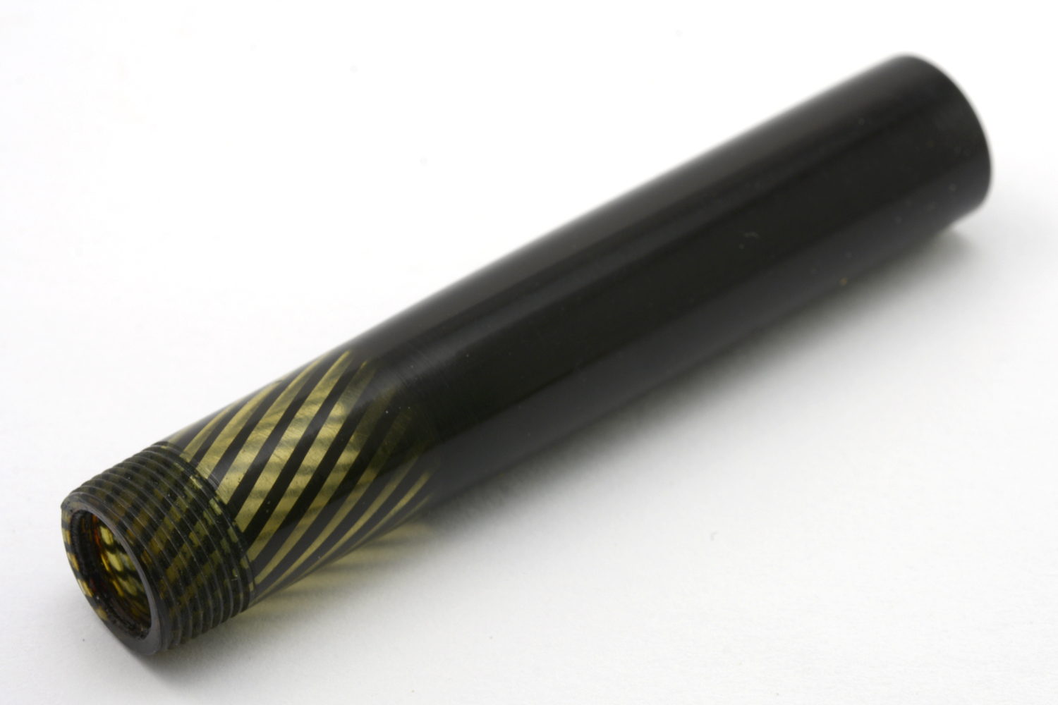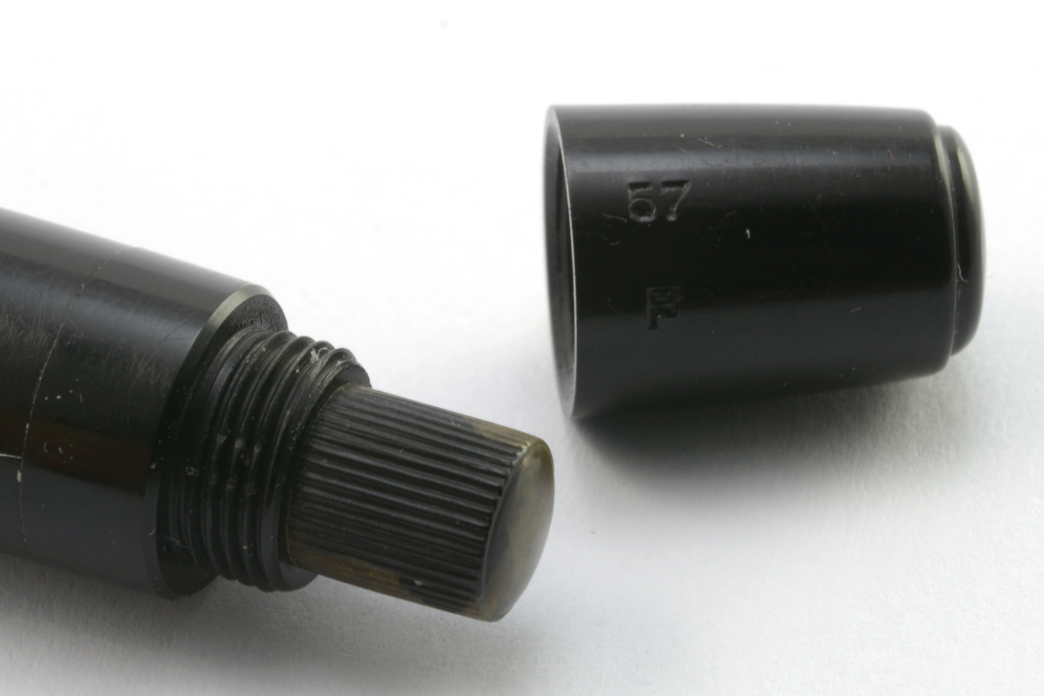 Toppskruven är nästan platt med en liten »hatt» på toppen. Den är gjord i celluloid, 7,3 mm hög och 12,1 mm på bredaste stället.