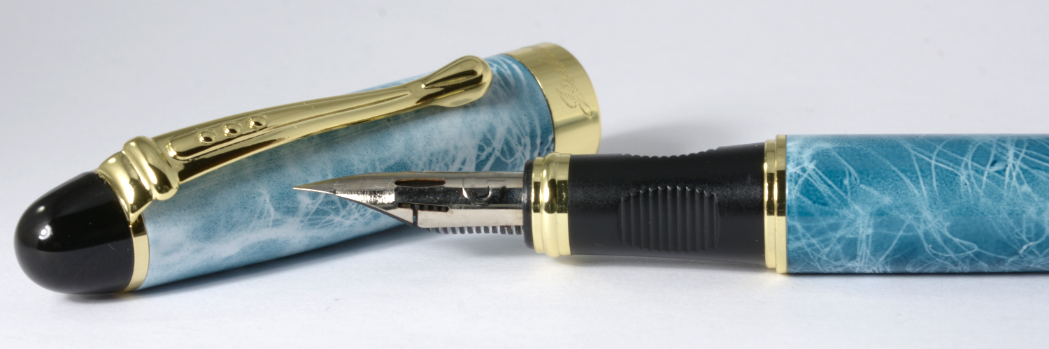 Jinhao X450 är en ganska stor och tung budgetpenna tillverkad i Kina som har ett stort stålstift med förhållandevis god flex från F till BB. Recensionerna på Amazon höjer pennan till skyarna eftersom det är mycket penna för pengarna, men personligen tycker jag det är en ganska opersonlig penna.