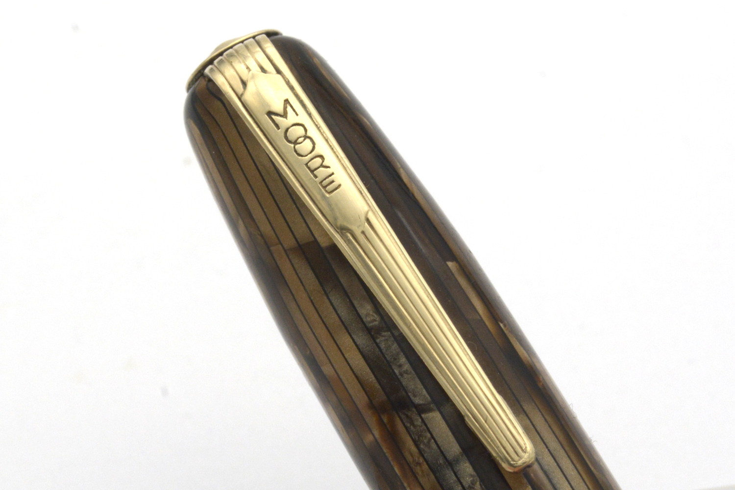 Moore är ingen vanlig penna på svenska pennmarknaden, och denna Moore 94A ropade jag in för lite mer pengar än jag avsett. Men i gengäld är det exemplar som kom i min ägo i riktigt fint skick. Behållarens och huvens celluloid har bra lyster utan externa skador, dess förgyllning är utmärkt och dess originalstift skriver fortfarande utmärkt. Enligt en del sidor på webben verkar denna modell lida av ett återkommande fel, nämligen att huven fäster dåligt på behållaren, men detta är inget som märks på denna penna.