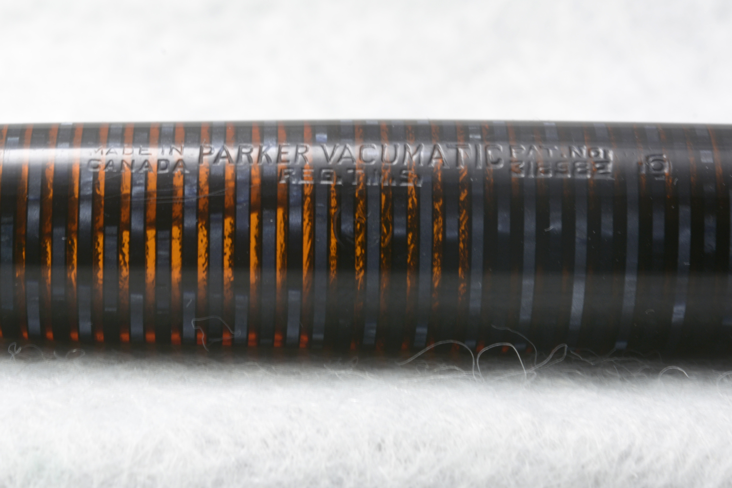 Prägling på behållaren: MADE IN CANADA [mellanrum] PARKER VACUMATIC | REG.T.M.S. | [Christian Olsens ankarloggo] [mellanrum] PAT. NO. | 318982 [mellanrum] 6 med punkt till vänster och under