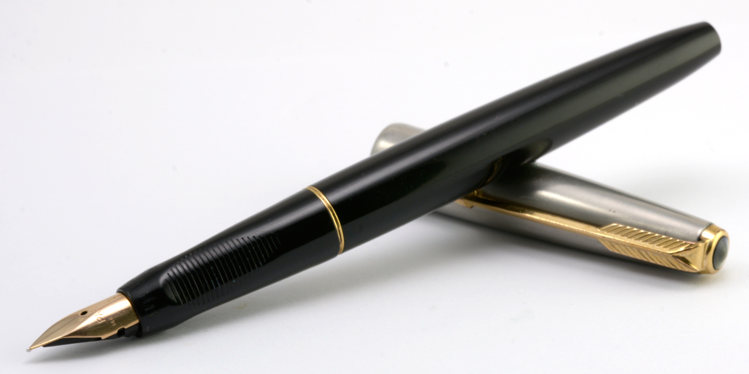 Text på fyllaren: TO FILL | REMOVE THIS | PARKER | CLEAN FILLER | GRIP HERE | PULL OUT → | DIP NECK IN INK | PRESS RIBBED BAR | FOUR TIMES | PARKER | MADE IN U.S.A.