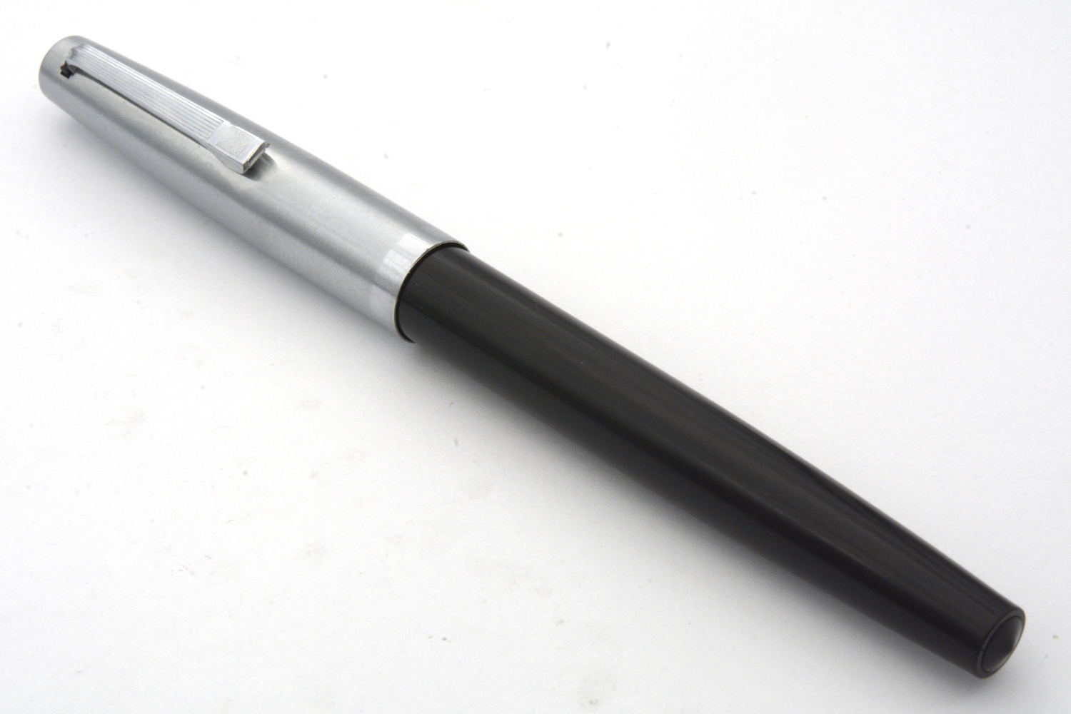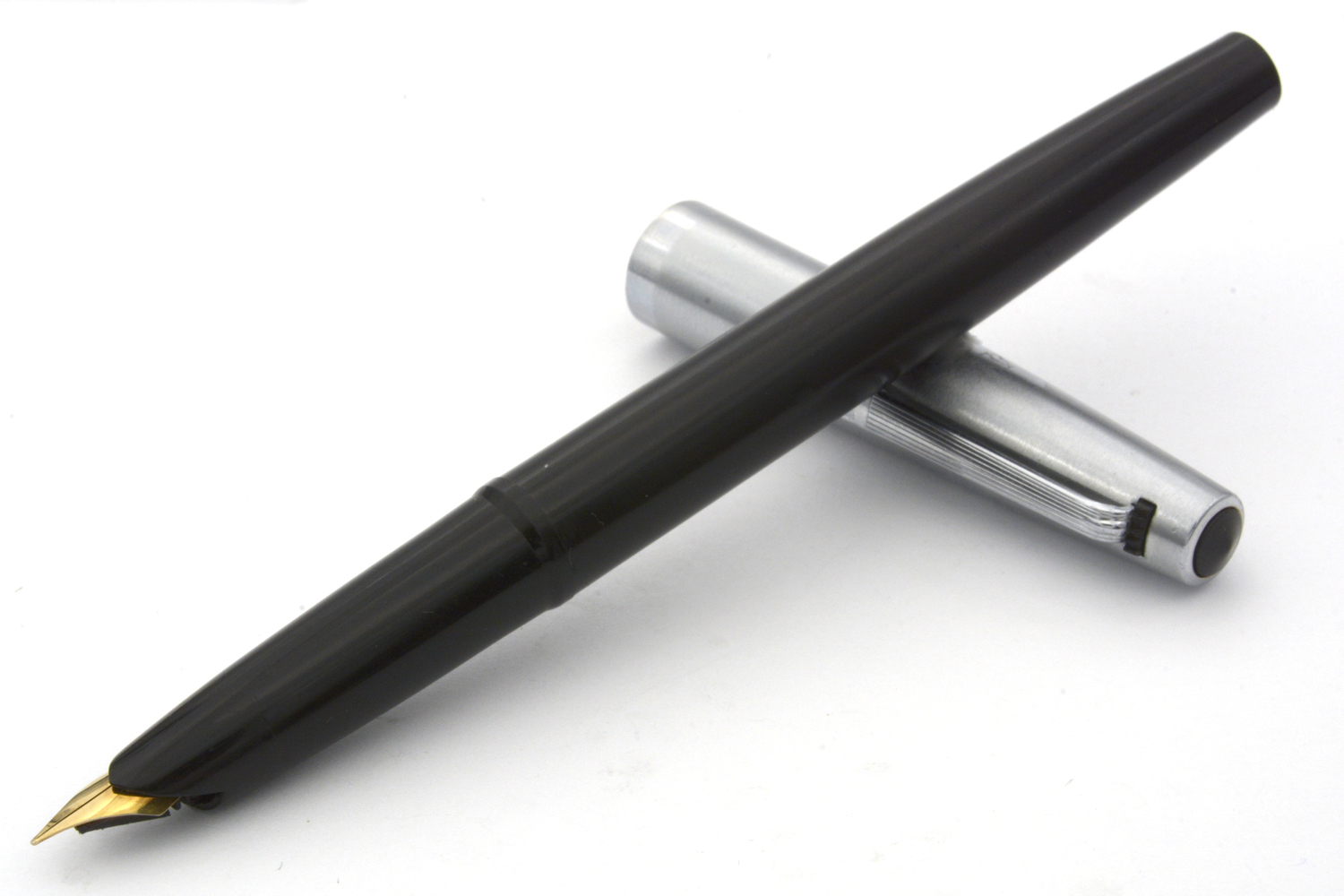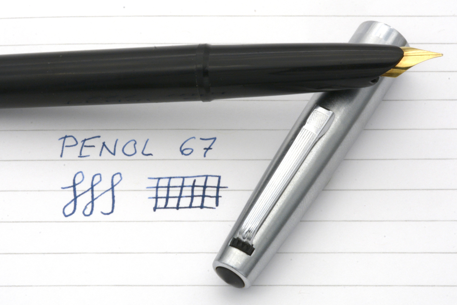Denna fullt fungerande, svarta Penol 67 med huv i metall, tillverkad i Danmark omkring 1965, är en - enligt dåtidens reklam pålitlig och okrossbar - skolpenna avsedd för konverter eller (Parker Quink)bläckpatron. Pennan har ett smalt, gulfärgat stålstift som vid lätt spetstryck skriver med EF-bredd. Pennans längd: 138 mm. Vikt: 15 gram. Vid köp medföljer en bläckpatron.