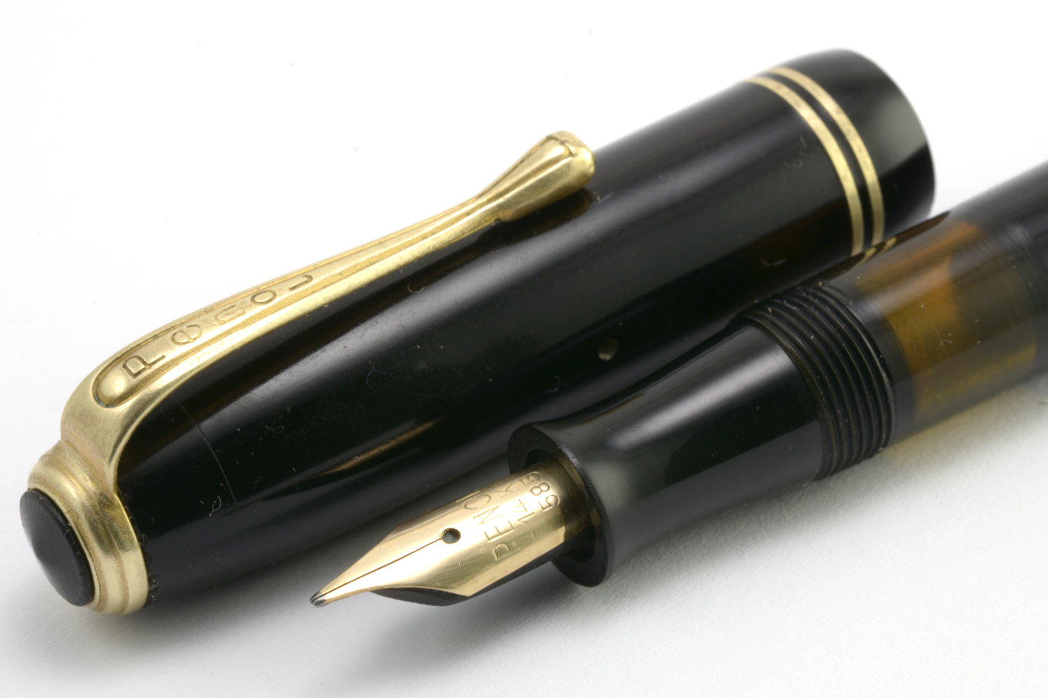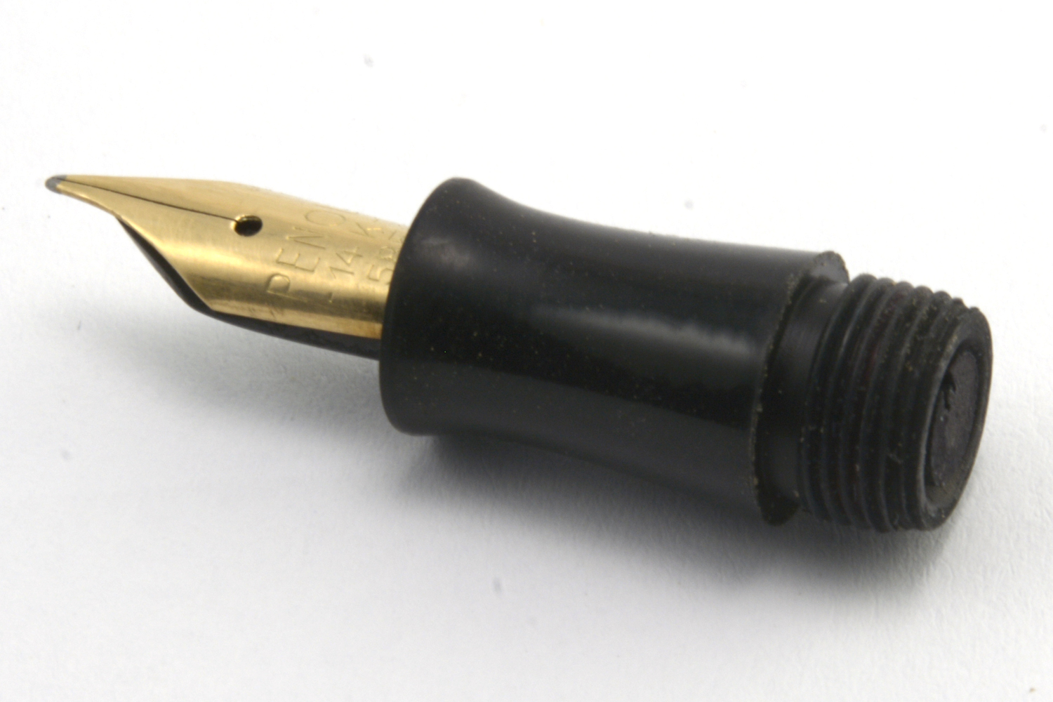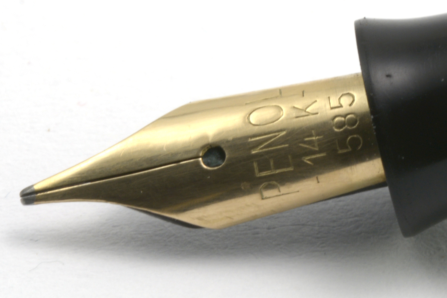 Den här pennan, tillverkad mitt under brinnande krig i juni 1943, är försedd med ett engagerande stift med god flex från F/M-bredd till BB. Vid start kan bläckflödet vara lite trögt men om man inleder skrivandet med en halv sekunds stilla tryck på pappret kommer bläckflödet igång och fungerar därefter klanderfritt, även under relativt snabba penndrag, och kräver inte speciellt stort spetstryck. Vid skrivande finns en viss feedback och spetsen har en svaga misslinjering från en tidigare ägares användande, men detta är inte något som stört när jag använt pennan.
