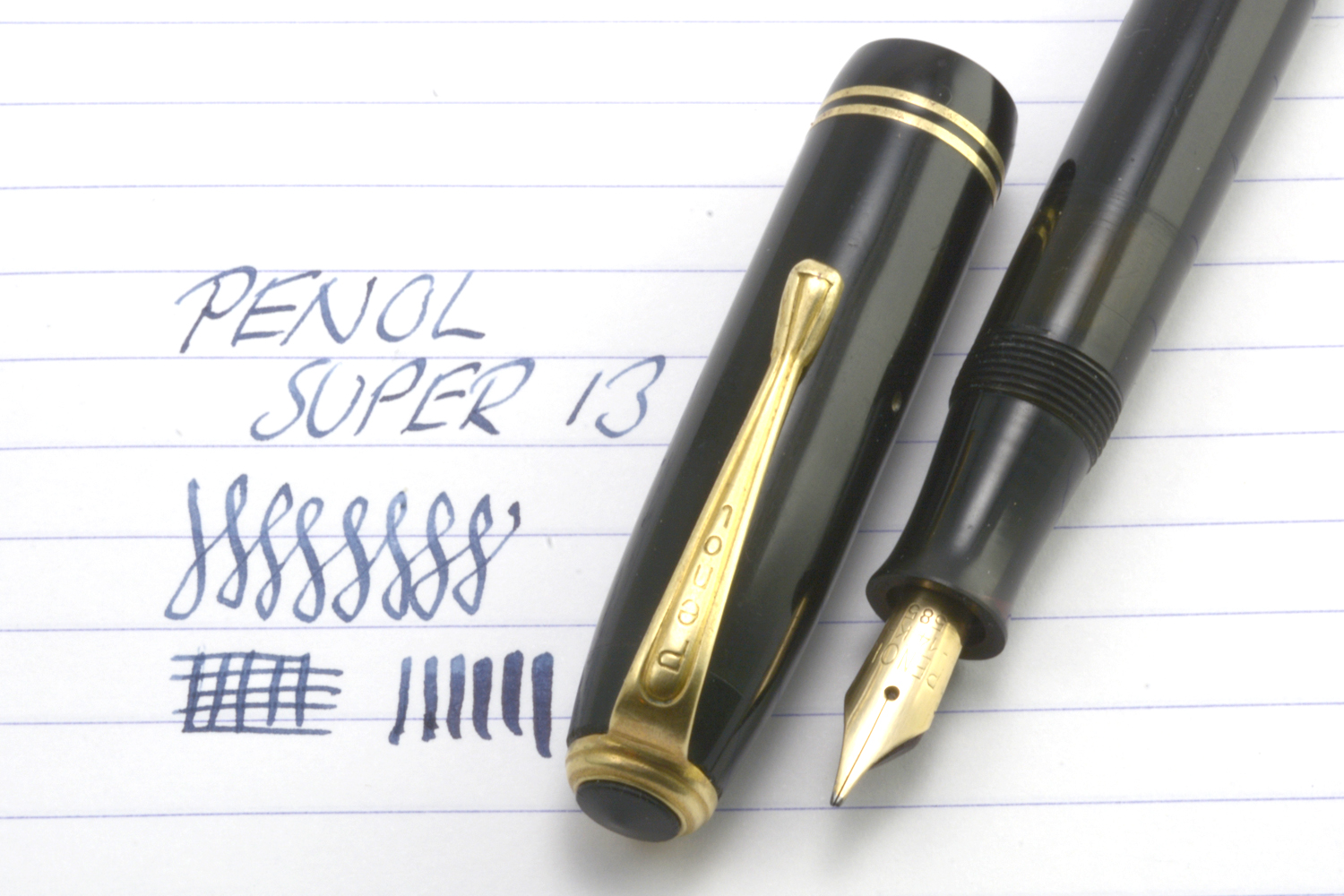 Penol Super 13 tillverkades mellan 1941–44 och är en halvlång, lite knubbig penna som i min hand blir lite för kort när den används utan huv under en längre tid, men fungerar alldeles utmärkt vid kortare anteckningar etcetera. Med huven postad upplever jag att pennan blir lite bättre balanserad, men framför allt ligger den då utmärkt i handen under längre skrivperioder.