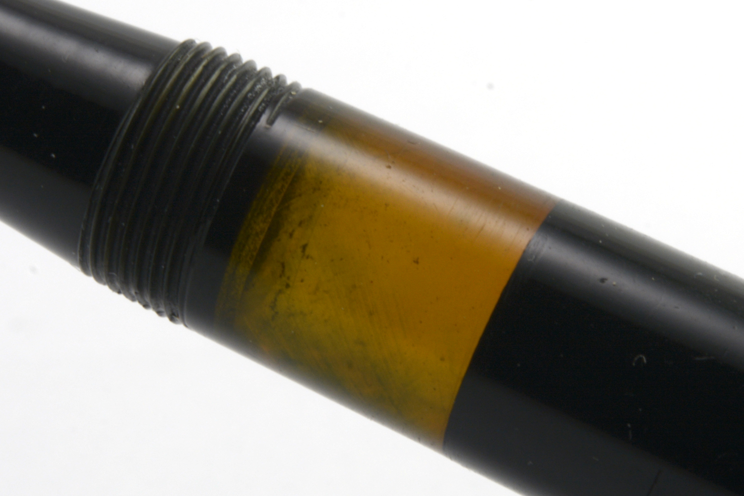 Pennan är i ett bra bruksskick med såväl stift som förgyllningen på clips och huvringar i bra skick. Kolvmekanismens är demonterad och försågs med ny kork under hösten 2020, och har pennan någon svag detalj så är det eventuellt den plast (eller är det ebonit?) som används i kolvmekanismen, en plast som verkar bli lite skör med åren.