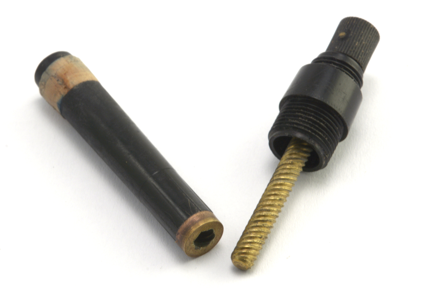 Kolvmekanismens delar verkar vara tillverkade i ebonit (övre skruvmekanismen), mässing (skrúvdetaljer) och någon plast (den »hylsa» som håller korken), korken är 6 mm bred och av kork.