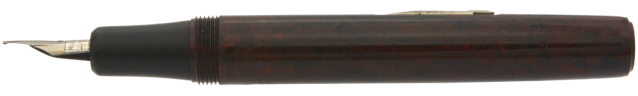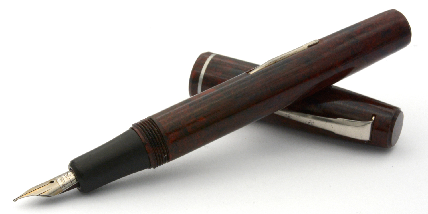 Under sensommaren 2021 plockades denna penna fram ur lådan den hamnat i och renoverades. Pennans förstycke var i dåligt exteriört skick och tryckmekanismen saknades, det senare lite märkligt med tanke på att någon vid en tidigare renovering (?) monterat in en ny bläcksäck. Uppenbarligen föredrog (?) vederbörande att skruva av och på behållaren varje gång bläck skulle fyllas på! Efter någon timmes arbete - och nu med ny tryckmekanism installerad - var detta återigen en habil brukspenna och, visade det sig, en riktigt skön skrivare. Jag använder helst pennan utan huv, med huven postad upplever jag pennan som lite för lång och obalanserad. Varför stiftet har två extra slitsar är fortfarande lite oklart. Möjligtvis handlar det om att ge dess tvåfärgade stålstift lite flex eller göra det mjukare, men det är inget jag tänkte på vid mitt skrivande. Det är ett ganska styvt stift som bara kräver ett lättare spetstryck för att skriva riktigt mjukt och skönt med F-bredd.
