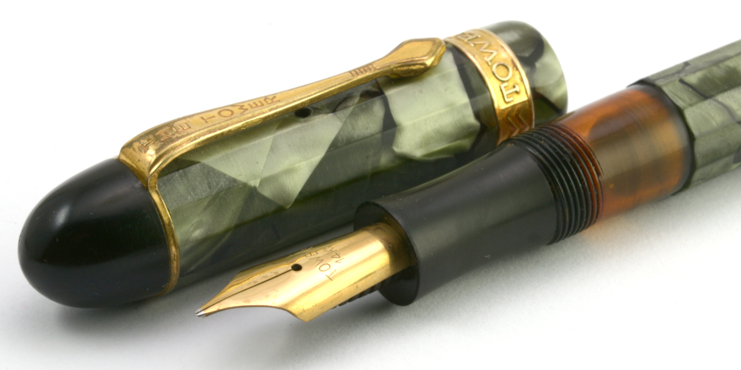 Den här Tower-pennan passerade mig på väg till en samlare i USA, och jag har inte gjort något med den mer än att fotografera och mäta den. Pennan är i behov av renovering. Dess kolvmekanism sitter fast, men framför allt behöver stiftet justeras så att huven kan skruvas hela vägen in, för jag misstänker att det är stiftet som är anledningen till att några millimeter av bläckfönstret syns när huven är inskruvad. Bläckledaren på detta exemplar förefaller vara en storlek mindre än stiftet, och min misstanke är att det inte är original.