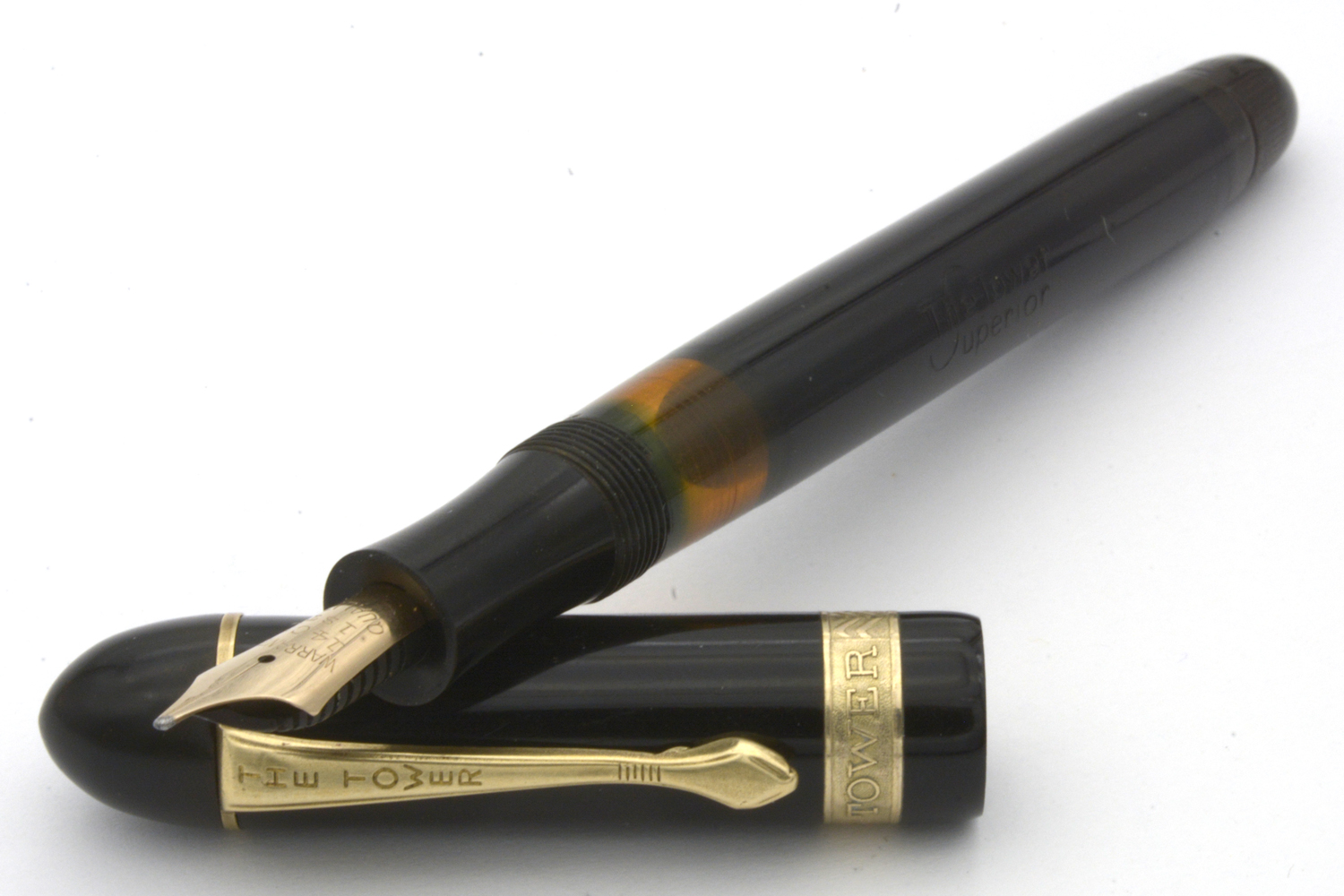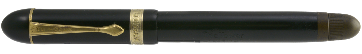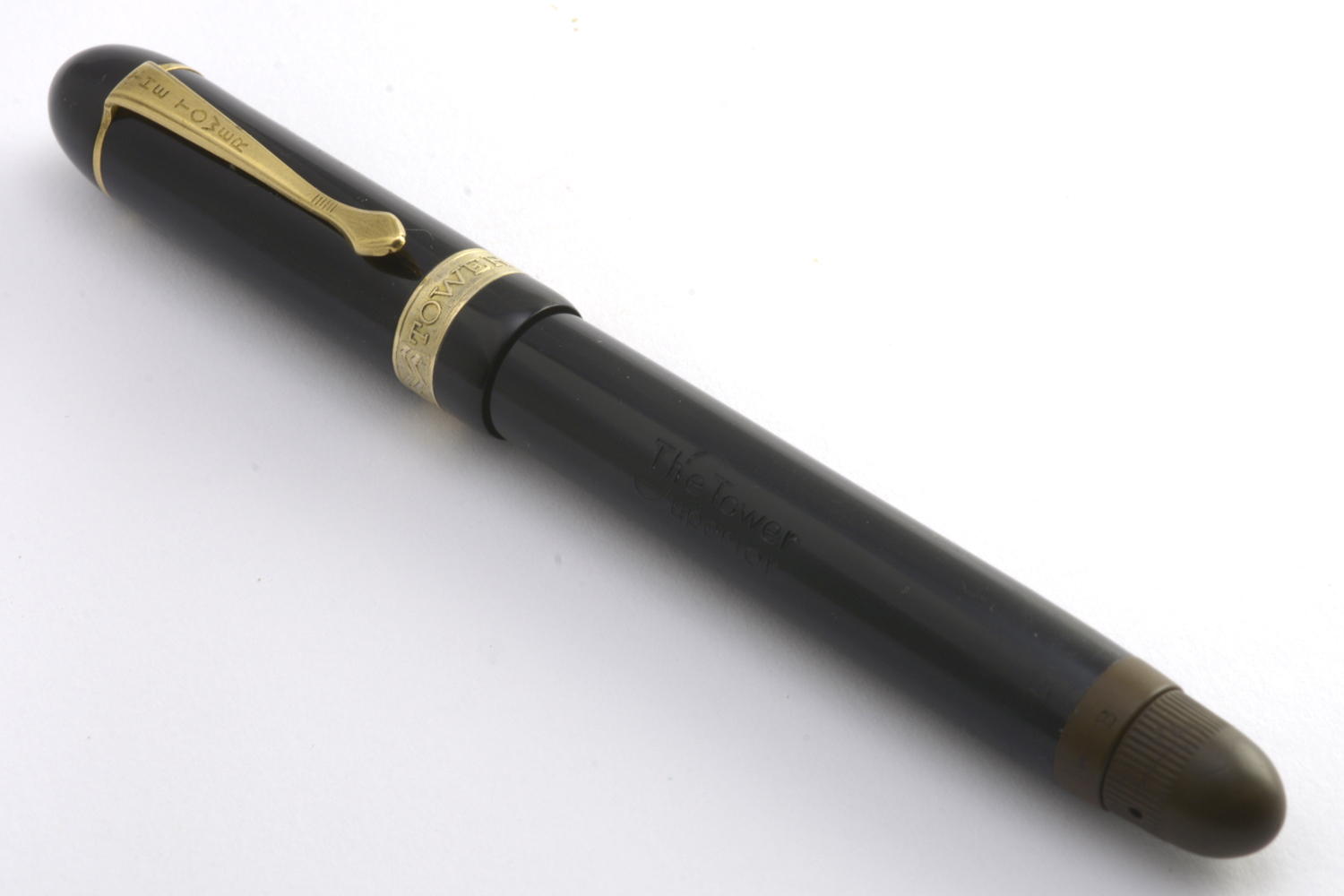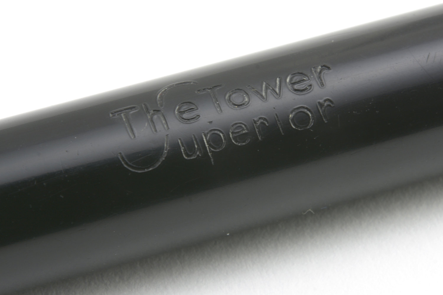 Denna renoverade och fullt fungerande The Tower Superior är tillverkad i Tyskland för den svenska marknaden i slutet av 1930-talet. Det är en skönt balanserad penna, både med och utan huven postad, med god förgyllning på de förgyllda delarna och med ett guldstift med mediumflex. Vid lätt spetstryck skriver pennan med M/B-bredd för att med högre tryck skriva med BB/BBB-bredd. Pennan har några tydliga ålderstecken – bläckfönstret är partiellt missfärgat, celluloiden är lite bräcklig vid pistongmekanismen och skruvar man ut pistongmekanismen i sin fulla längd kan den eventuellt fastna (något som kan åtgärdas på egen hand men kan upplevas irriterande) – något som tagits hänsyn till vid prissättningen. Pennans längd: 131,5 mm. Vikt: 20 gram.