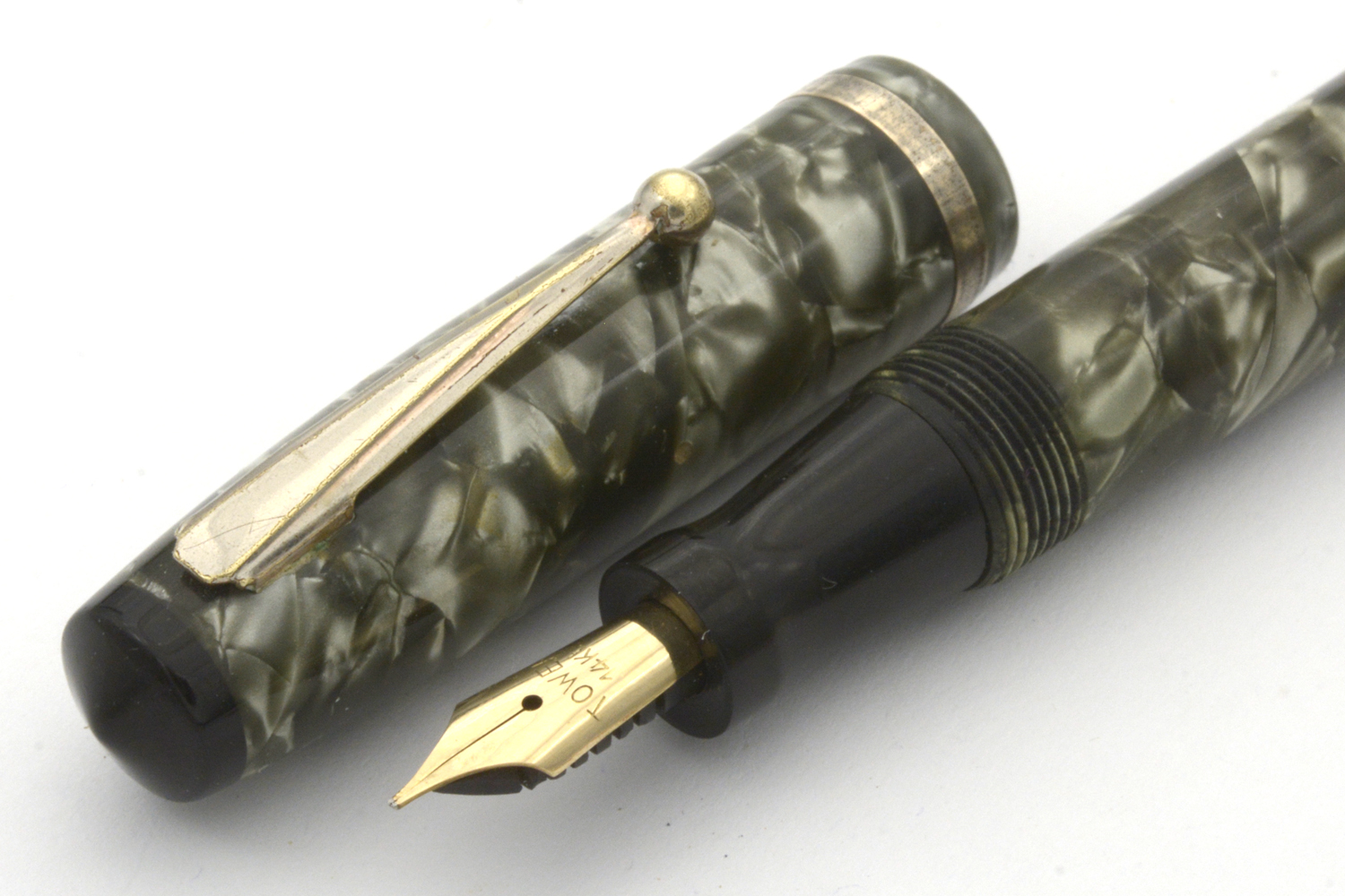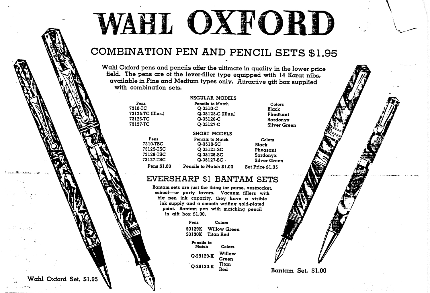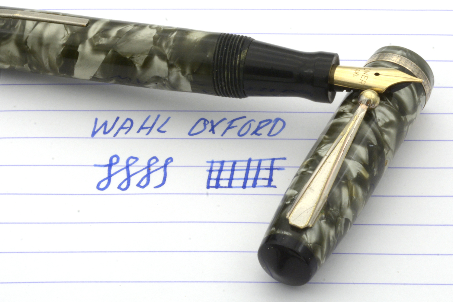 Wahl Oxford var Wahl Eversharps budget-penna, en celluloidpenna med ett attraktivt melerat mönster som enligt företagets marknadsföring erbjöd hög kvalitet och guldstift – i bredderna F eller M – till lågt pris, och även om clips och huvring inte längre har mycket kvar av sin ursprungliga (tunna) förgyllning så syns dessa kvalitetsanspråk fortfarande. Detta exemplar saknade dock stift när den kom i min ägo, något jag åtgärdat genom att förse den med ett stift från en Tower Minor som inte gick att renovera.
