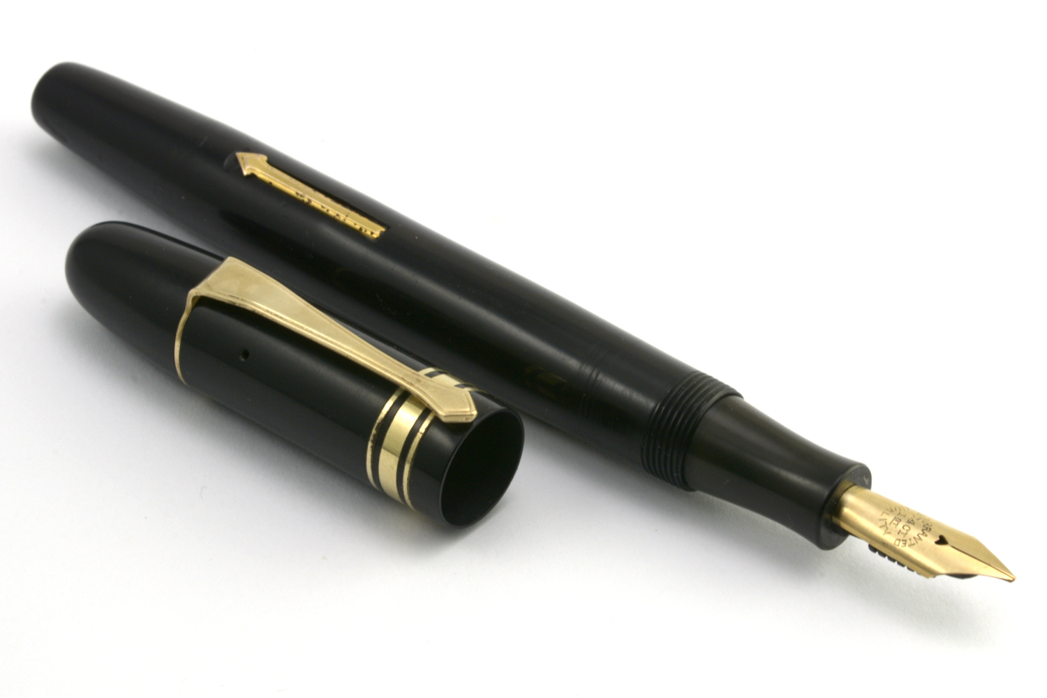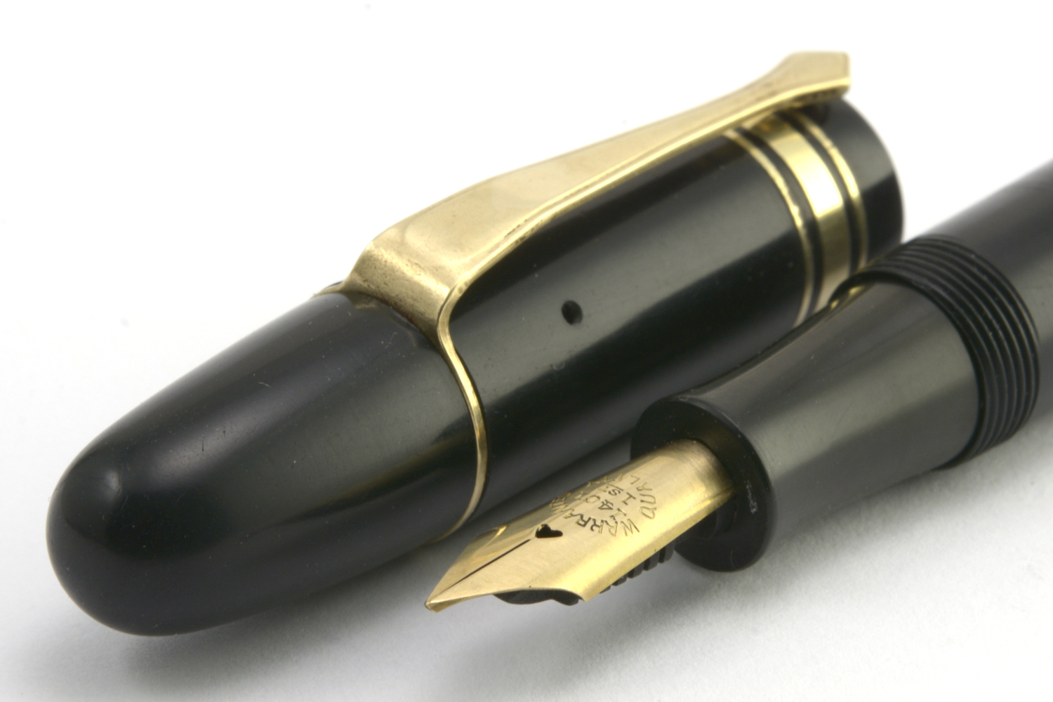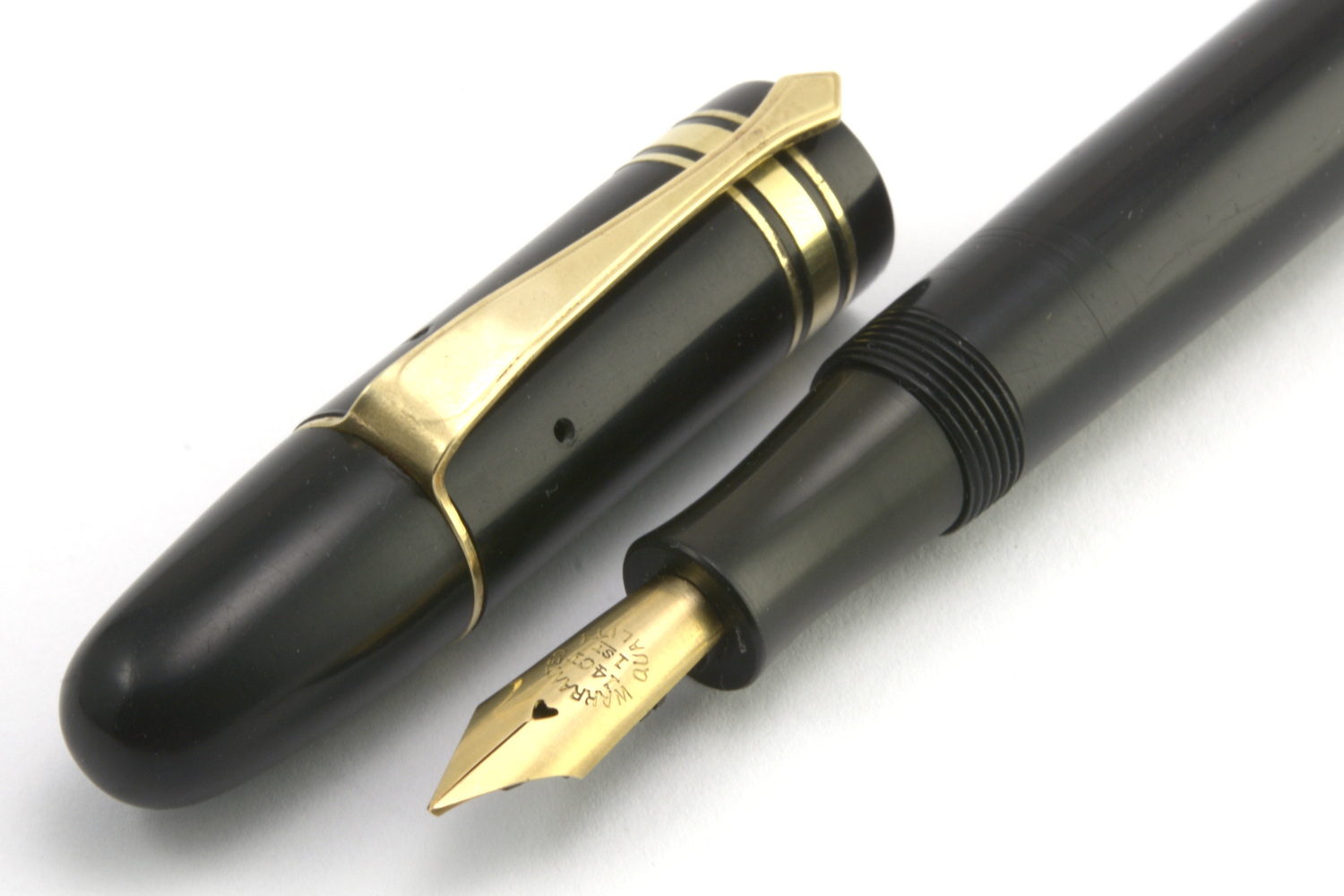 Pennan är lång och ligger riktigt skönt i handen utan huv. Dess guldstift är brett, jag uppskattar det till B-bredd, och skriver med bra bläckflöde utan att kräva något egentligt spetstryck, men fungerar ganska dåligt tillsammans med min förhållandevis lilla handstil.