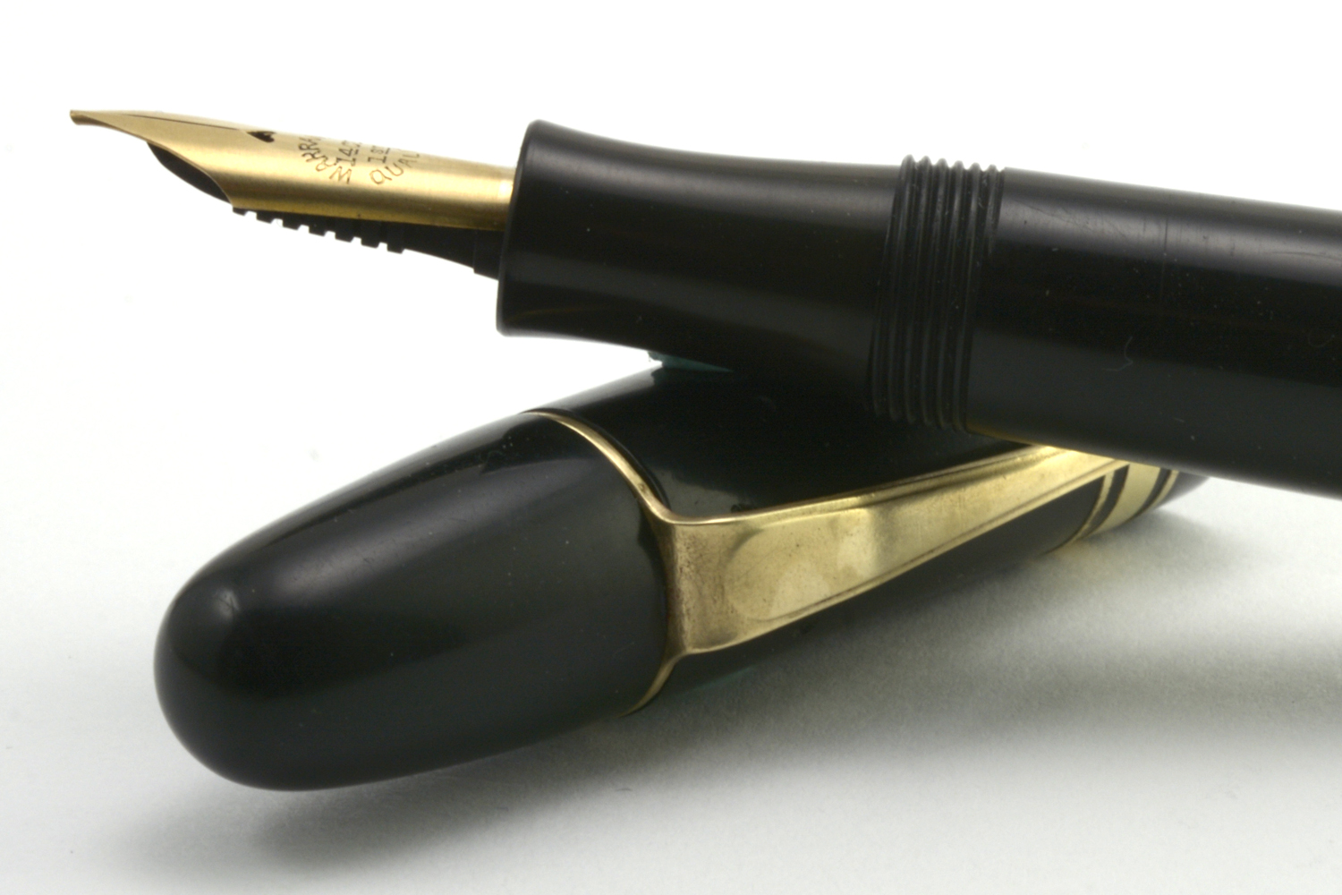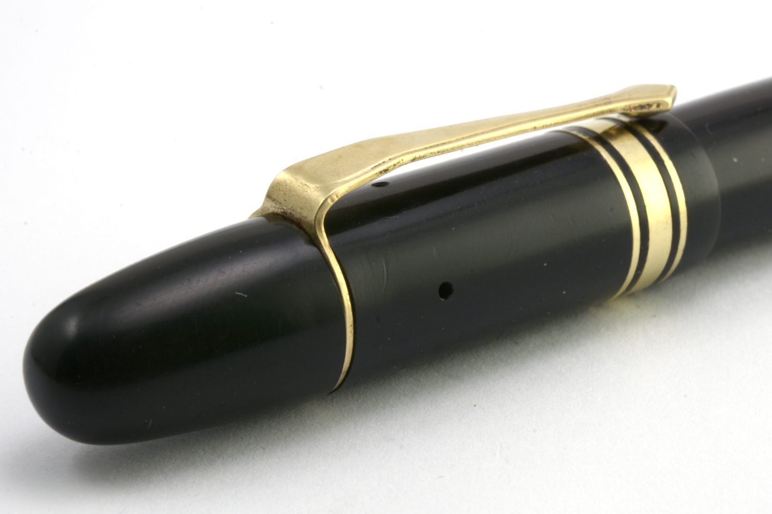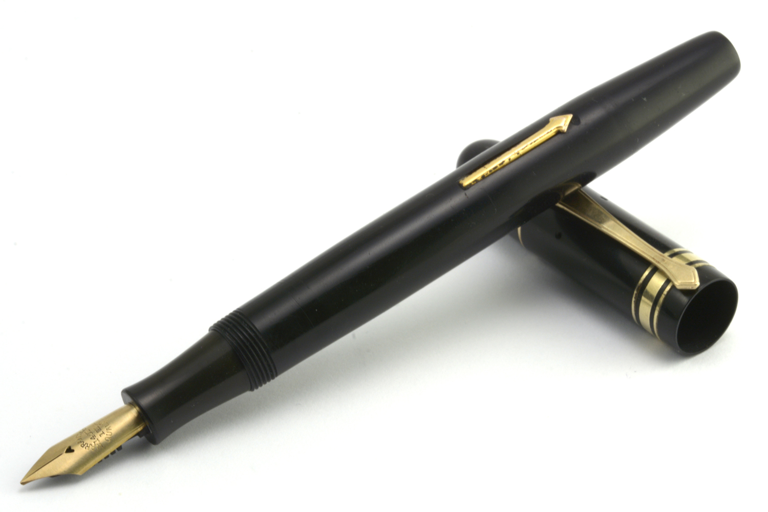 Pennan är lång och ligger riktigt skönt i handen utan huv. Dess guldstift är brett, jag uppskattar det till B-bredd, och skriver med bra bläckflöde utan att kräva något egentligt spetstryck, men fungerar ganska dåligt tillsammans med min förhållandevis lilla handstil.