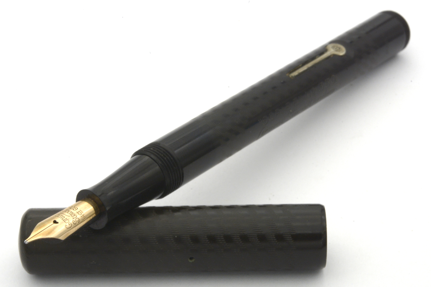 Detta är en penna i riktigt fint skick med snygg ciselering på behållare och huv och tydlig prägling av modellnamnet. Den har dessutom en personifiering på behållaren, men detta är inget man egentligen tänker på. Som skrivare är det en relativt lång och smal penna som utan huv ligger skönt balanserad i handen. Med huven postad – något som sker genom att huven skruvas fast på behållarens änddel – blir pennan i längsta laget och känns till följd av det lite obalanserad. Pennans originalguldstift har mediumflex och är en riktigt trevlig bekantskap. Vid lätt spetstryck skriver pennan med F-bredd för att vid högre spetstryck dra linjer upp till B-bredd, hela tiden med bra bläckflöde.