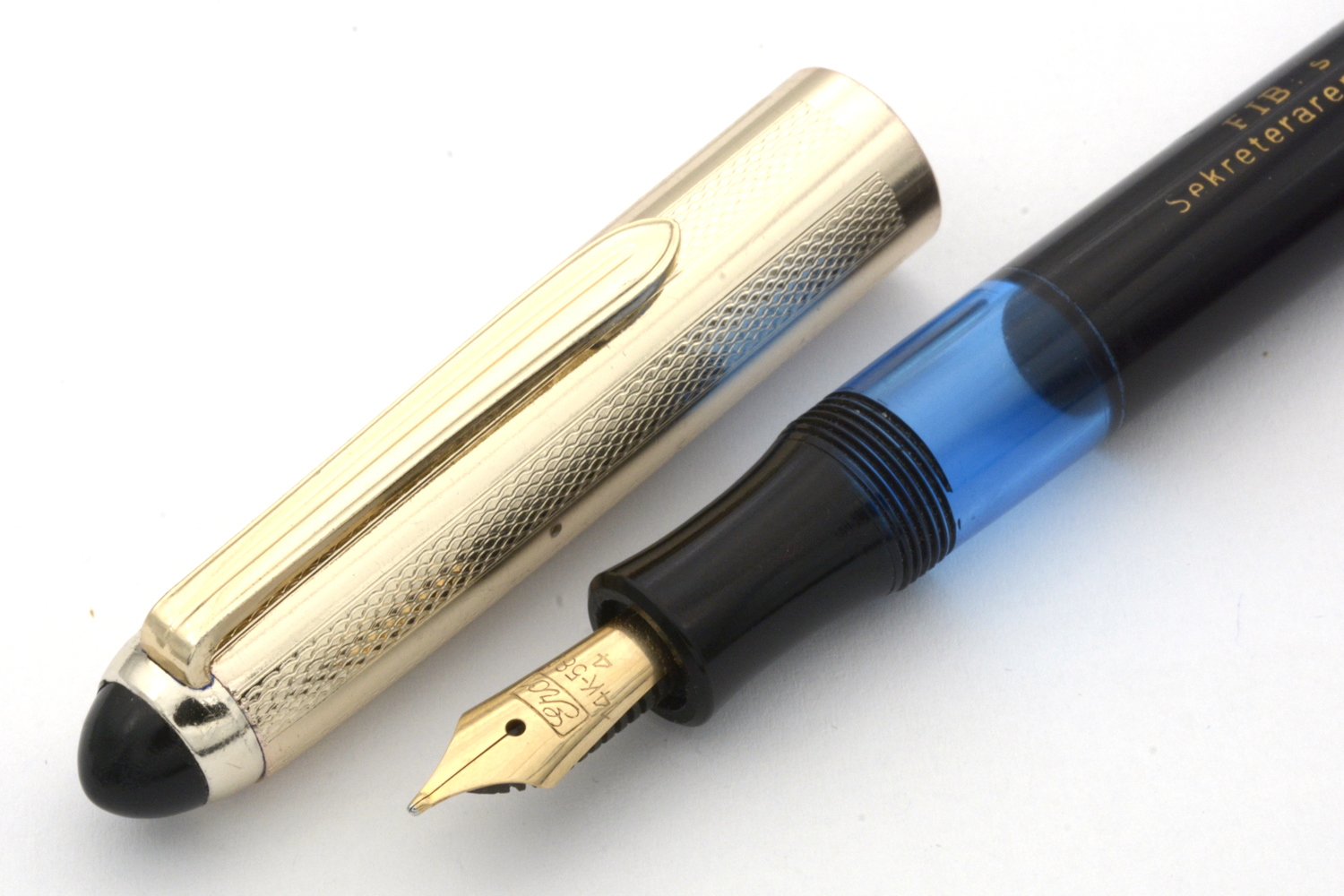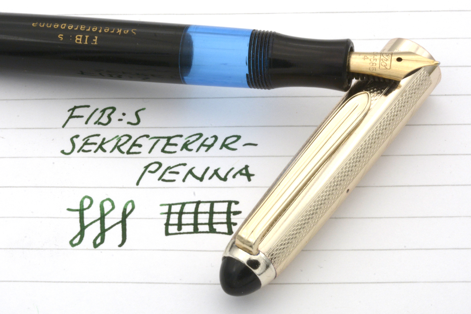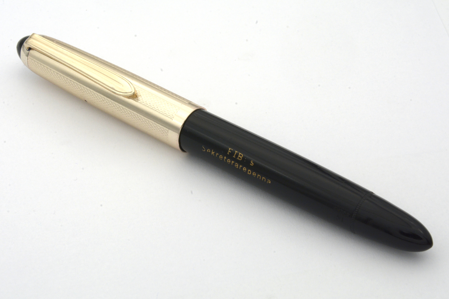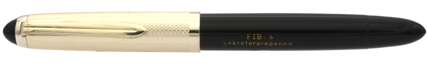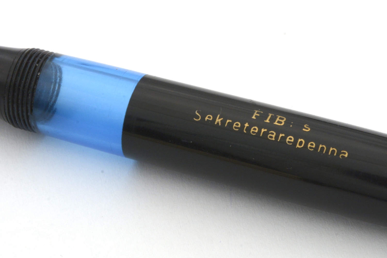 Denna fullt fungerande, svarta FIB:s Sekreterarepenna med förgylld huv är en kolvfyllare tillverkad under 1950-talets senare hälft i Tyskland, avsedd för den svenska marknaden som en premie till goda försäljare av Folket i Bilds tidningar och böcker. Pennan har en skön vikt och bra balans, speciellt med huven postad, och är en utmärkt brukspenna med ett urskruvbart 14 karats guldstift, tillverkat av Ero, som skriver mjukt och följsamt med M-bredd vid lätt spetstryck. Pennans längd: 132 mm. Vikt: 15,5 gram.