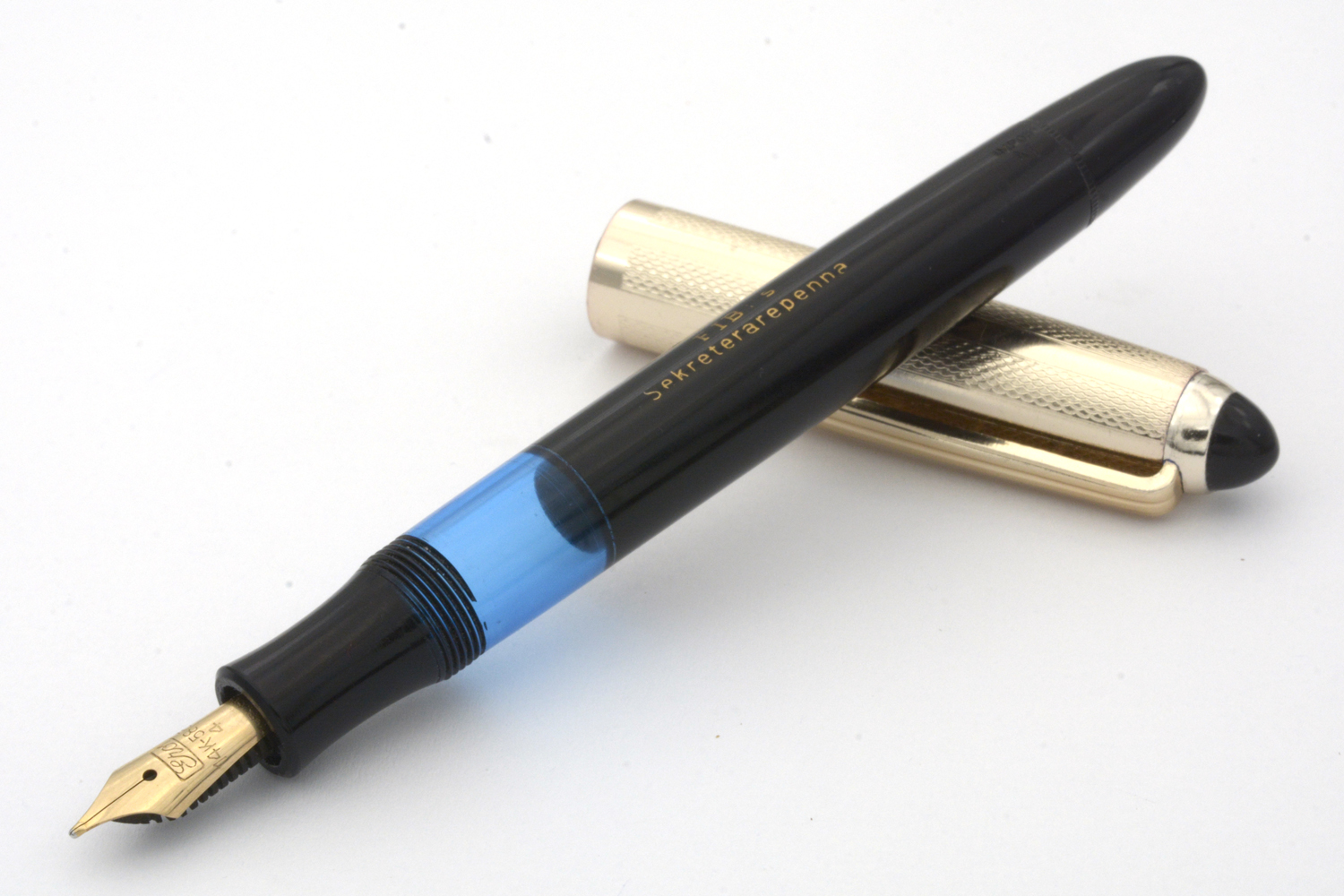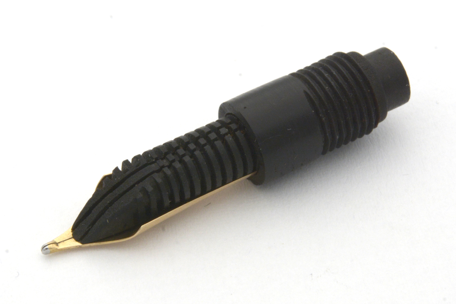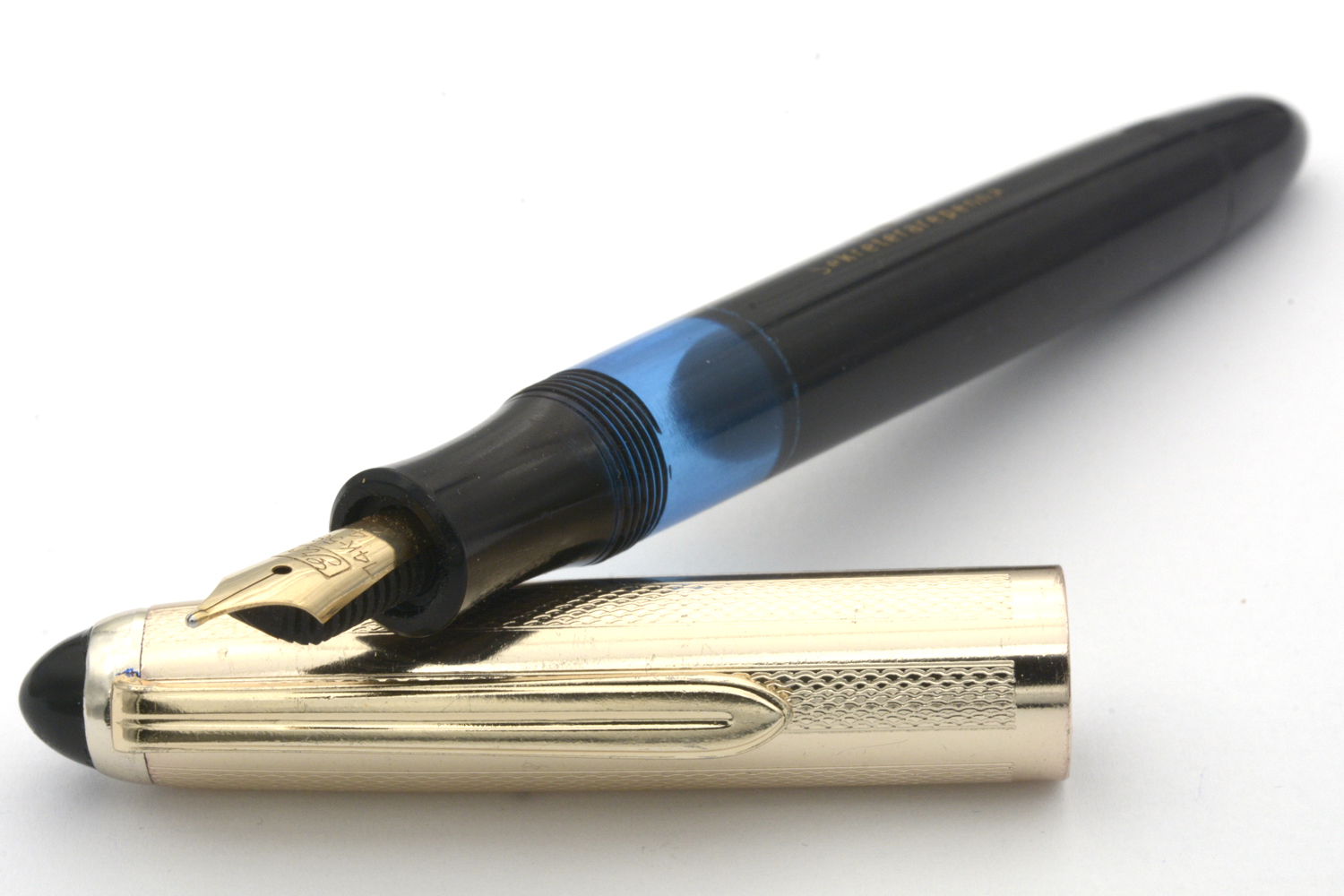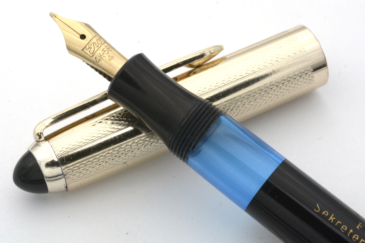 Denna fullt fungerande, svarta FIB:s Sekreterarepenna med förgylld huv är en kolvfyllare tillverkad under 1950-talets senare hälft i Tyskland, avsedd för den svenska marknaden som en premie till goda försäljare av Folket i Bilds tidningar och böcker. Pennan har en skön vikt och bra balans, speciellt med huven postad, och är en utmärkt brukspenna med ett urskruvbart 14 karats guldstift, tillverkat av Ero, som skriver mjukt och följsamt med M-bredd vid lätt spetstryck. Pennans längd: 132 mm. Vikt: 15,5 gram.