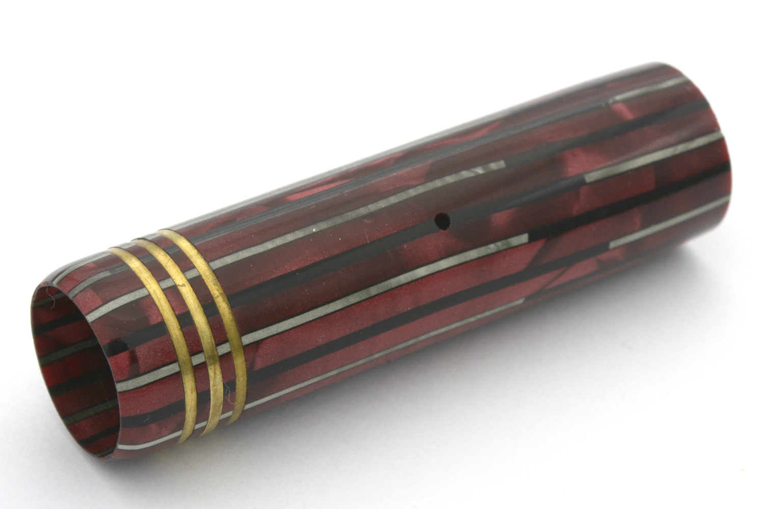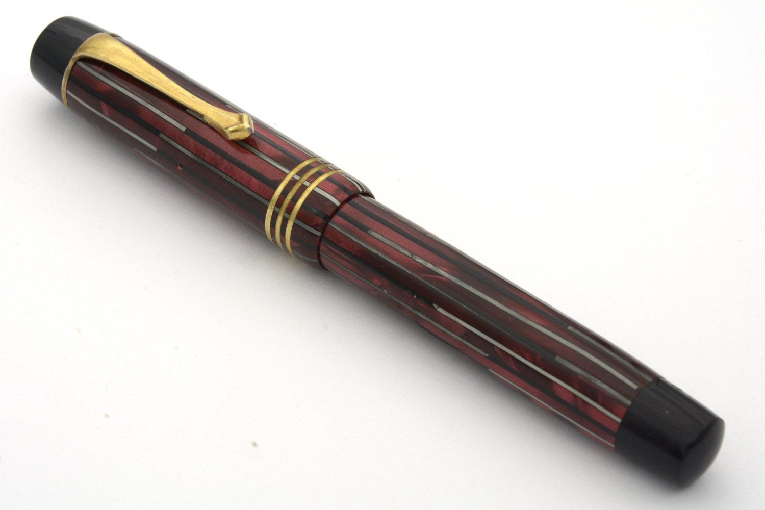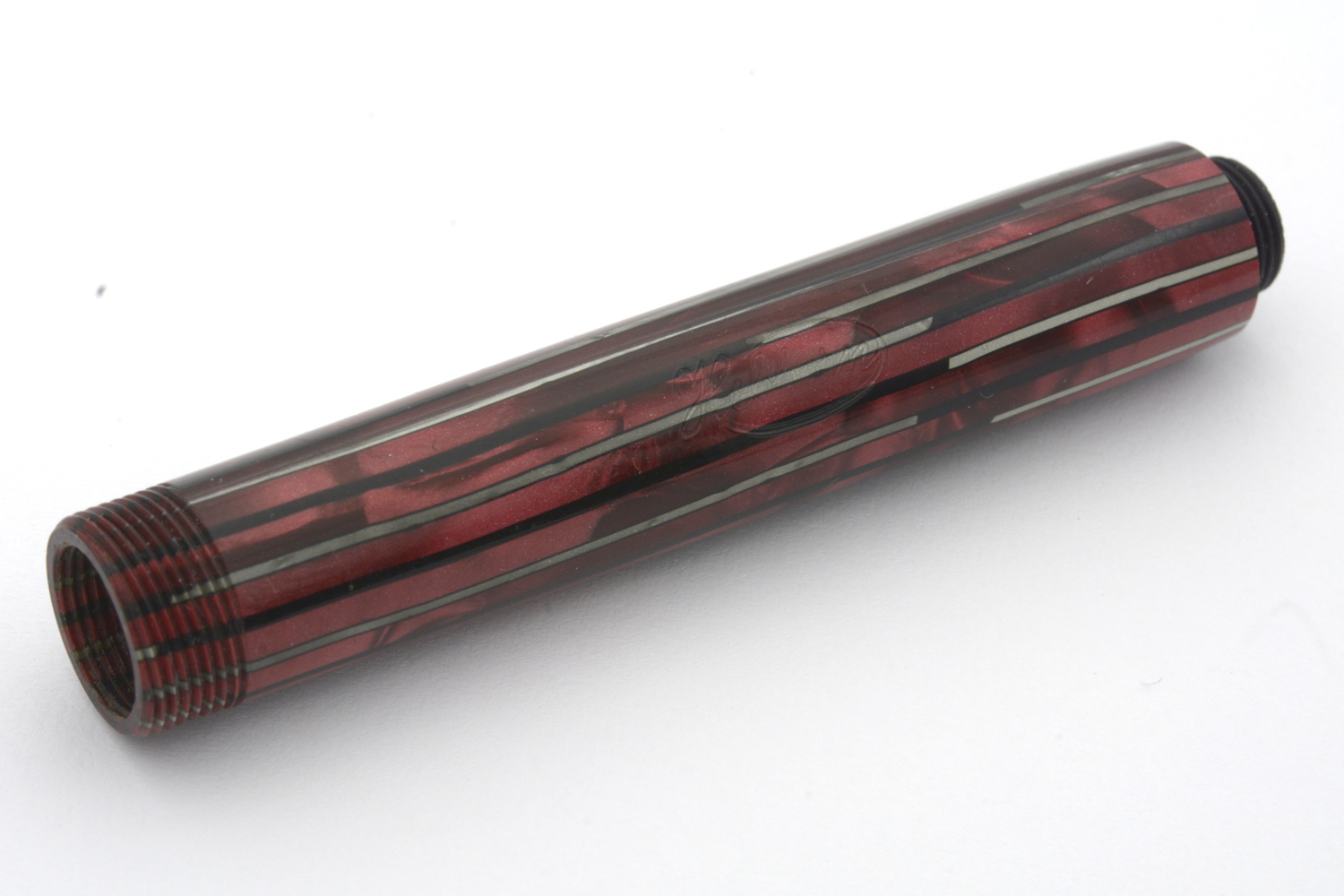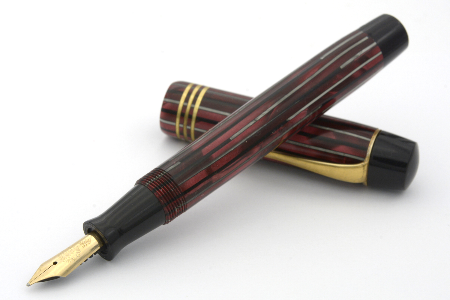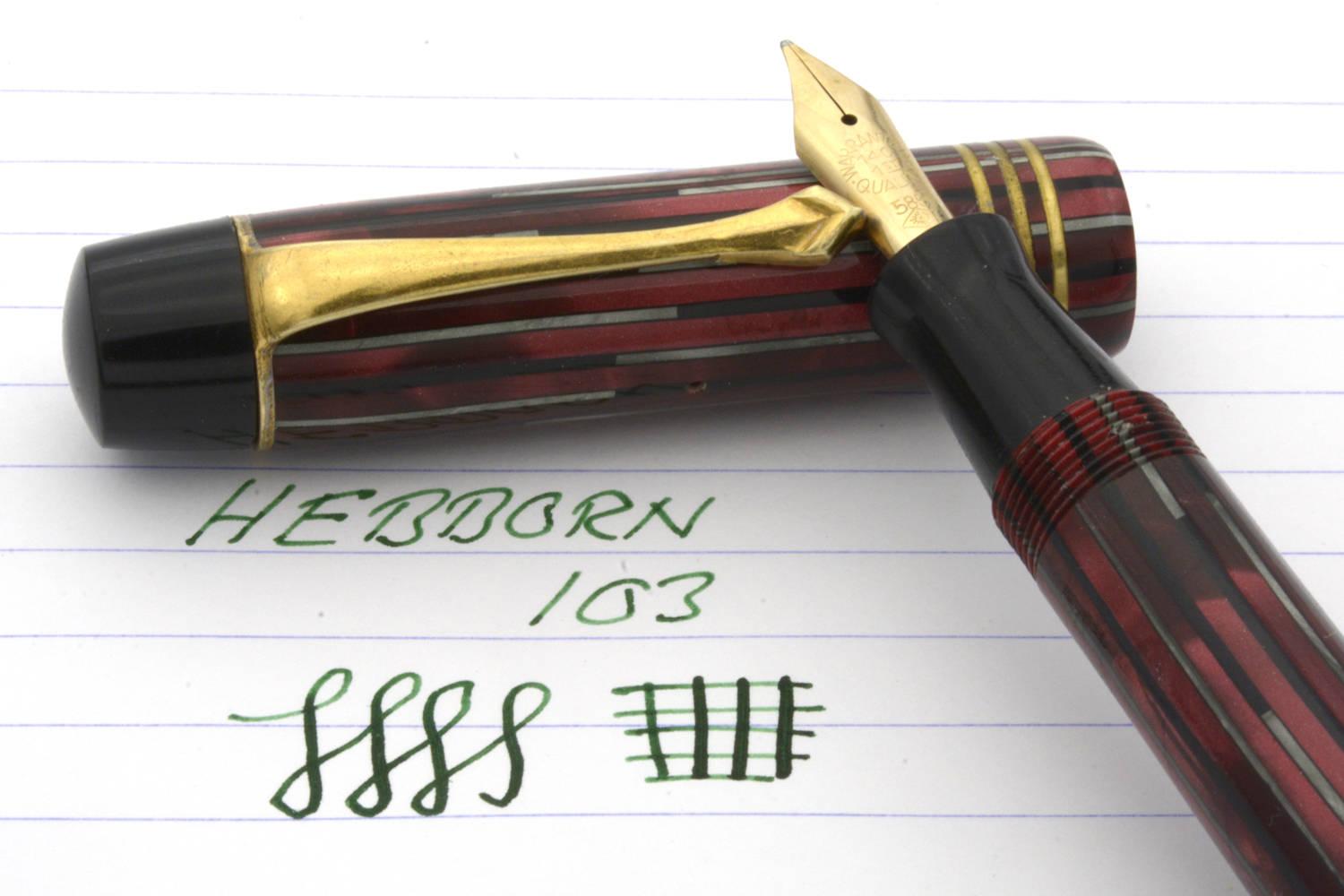 Denna rödmarmorerade Hebborn 103 är en läcker celluloid-penna, med härlig lyster i färgen och en för åldern bra förgyllning på clips och huvringar, som kom i min ägo tillsammans med bruksanvisning och ask. På bruksanvisningen finns några siffror angivna – 11. 9. 42 – som jag tolkar som ett datum som kan hjälpa till att datera pennan. Pennan är försedd med ett Degussa-stift som både kan vara original och ett ersättningsstift. Vad som styrker det första är att datumet på indikerar att pennan troligen är tillverkad under kriget; det som styrker det senare är att pennans bläckledare är »avhuggen», eventuellt efter ett fall då originalstiftet gick sönder. Det som ytterligare styrker det senare är intrycket att pennan med stor sannolikhet varit demonterad minst en gång tidigare, och att pennan i det sammanhanget försågs med en ny bläcksäck. När jag demonterade pennan var bläcksäcken lite uttorkad men hel, dessutom så slarvigt monterad att bläcksäcken vridits runt sin egen axel att den inte gick att fylla ordentligt med bläck. En gissning, baserat på detta, är att bläckledaren på denna penna gick sönder någon gång på 1940/50-talet men att renoveringen gjordes så slarvigt att ägaren inte egentligen kunde använda pennan därefter.