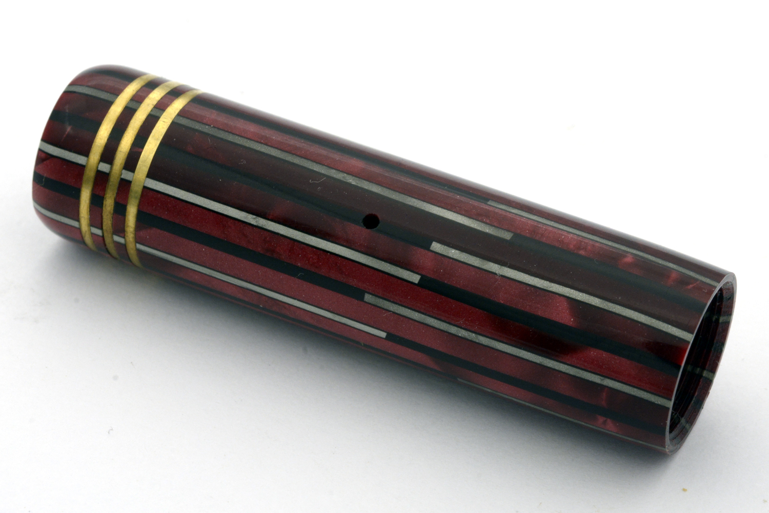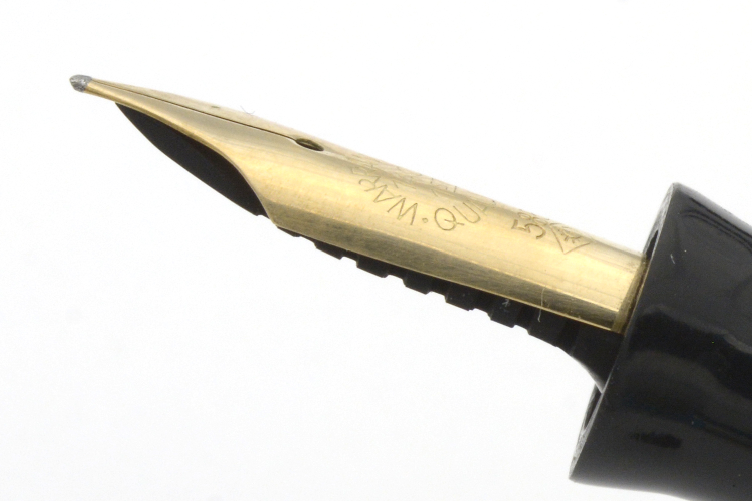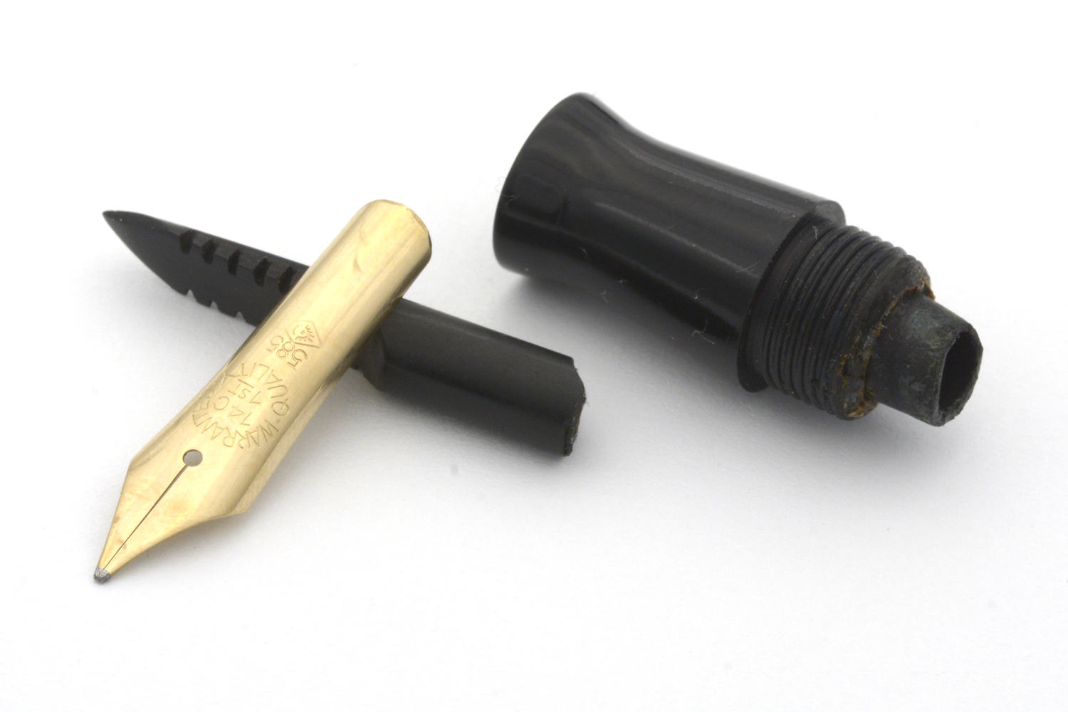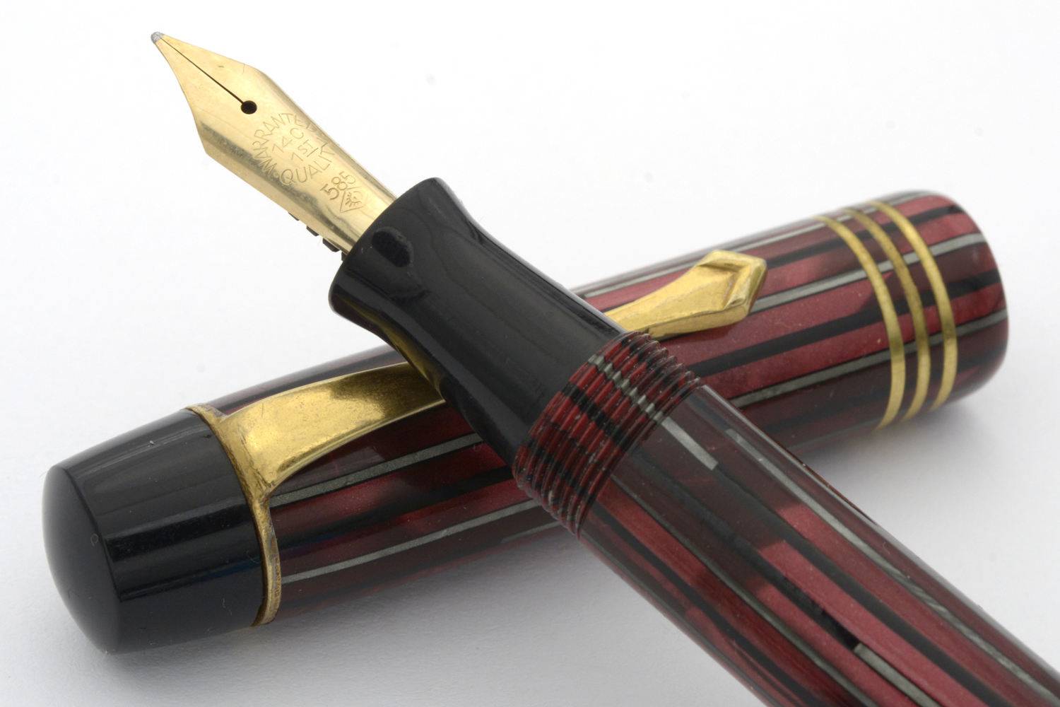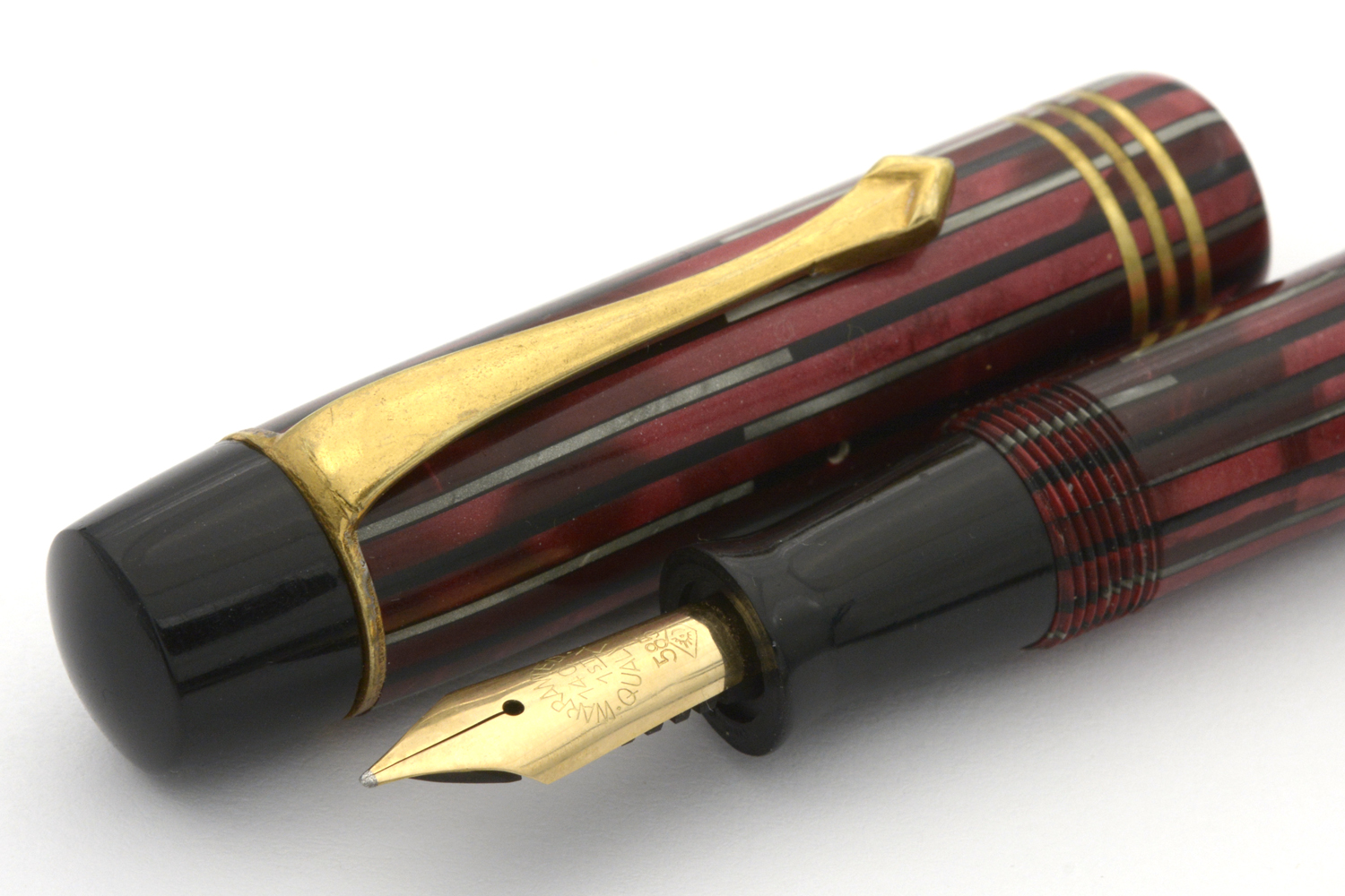 Denna rödmarmorerade Hebborn 103 är en läcker celluloid-penna, med härlig lyster i färgen och en för åldern bra förgyllning på clips och huvringar, som kom i min ägo tillsammans med bruksanvisning och ask. På bruksanvisningen finns några siffror angivna – 11. 9. 42 – som jag tolkar som ett datum som kan hjälpa till att datera pennan. Pennan är försedd med ett Degussa-stift som både kan vara original och ett ersättningsstift. Vad som styrker det första är att datumet på indikerar att pennan troligen är tillverkad under kriget; det som styrker det senare är att pennans bläckledare är »avhuggen», eventuellt efter ett fall då originalstiftet gick sönder. Det som ytterligare styrker det senare är intrycket att pennan med stor sannolikhet varit demonterad minst en gång tidigare, och att pennan i det sammanhanget försågs med en ny bläcksäck. När jag demonterade pennan var bläcksäcken lite uttorkad men hel, dessutom så slarvigt monterad att bläcksäcken vridits runt sin egen axel att den inte gick att fylla ordentligt med bläck. En gissning, baserat på detta, är att bläckledaren på denna penna gick sönder någon gång på 1940/50-talet men att renoveringen gjordes så slarvigt att ägaren inte egentligen kunde använda pennan därefter.