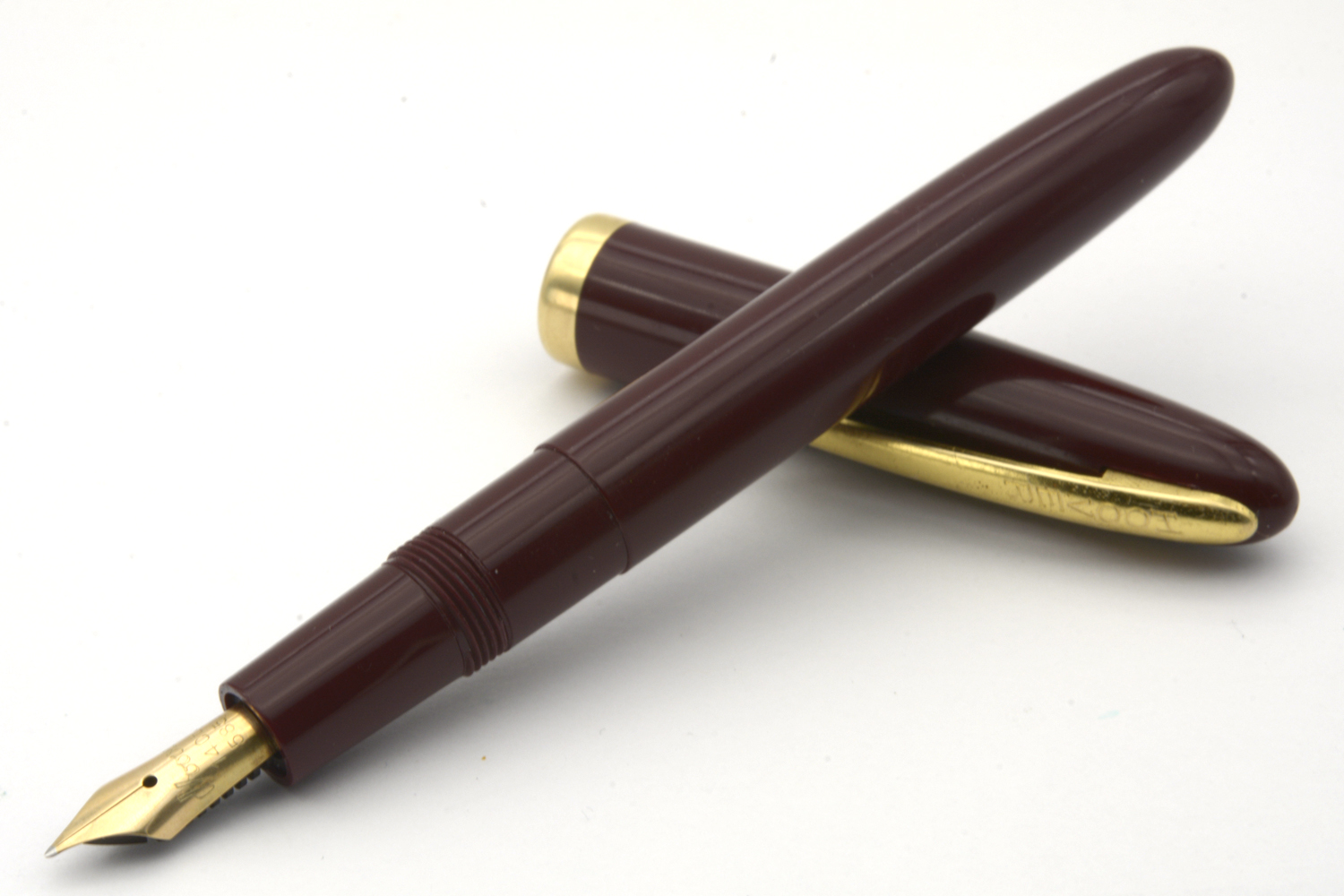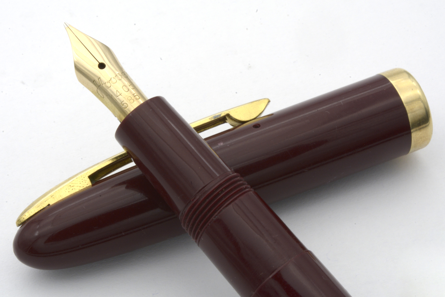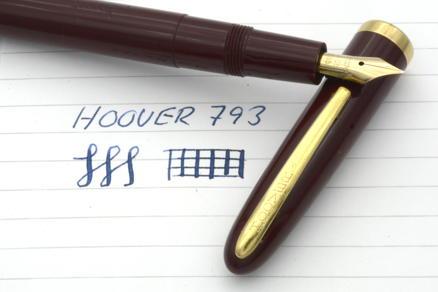 Denna fullt fungerande, vinröda Hoover - tillverkad på 1950-talet för den danska marknaden - är en aerofiller i fint skick som ligger skönt balanserad i handen, både med och utan huven postad. Pennan har ett urskruvbart stift med mediumflex som vid lätt spetstryck skriver mjukt och följsamt med F-bredd för att med högre tryck dra linjer upp till B-bredd. Pennans längd: 132 mm. Vikt: 15,5 gram.