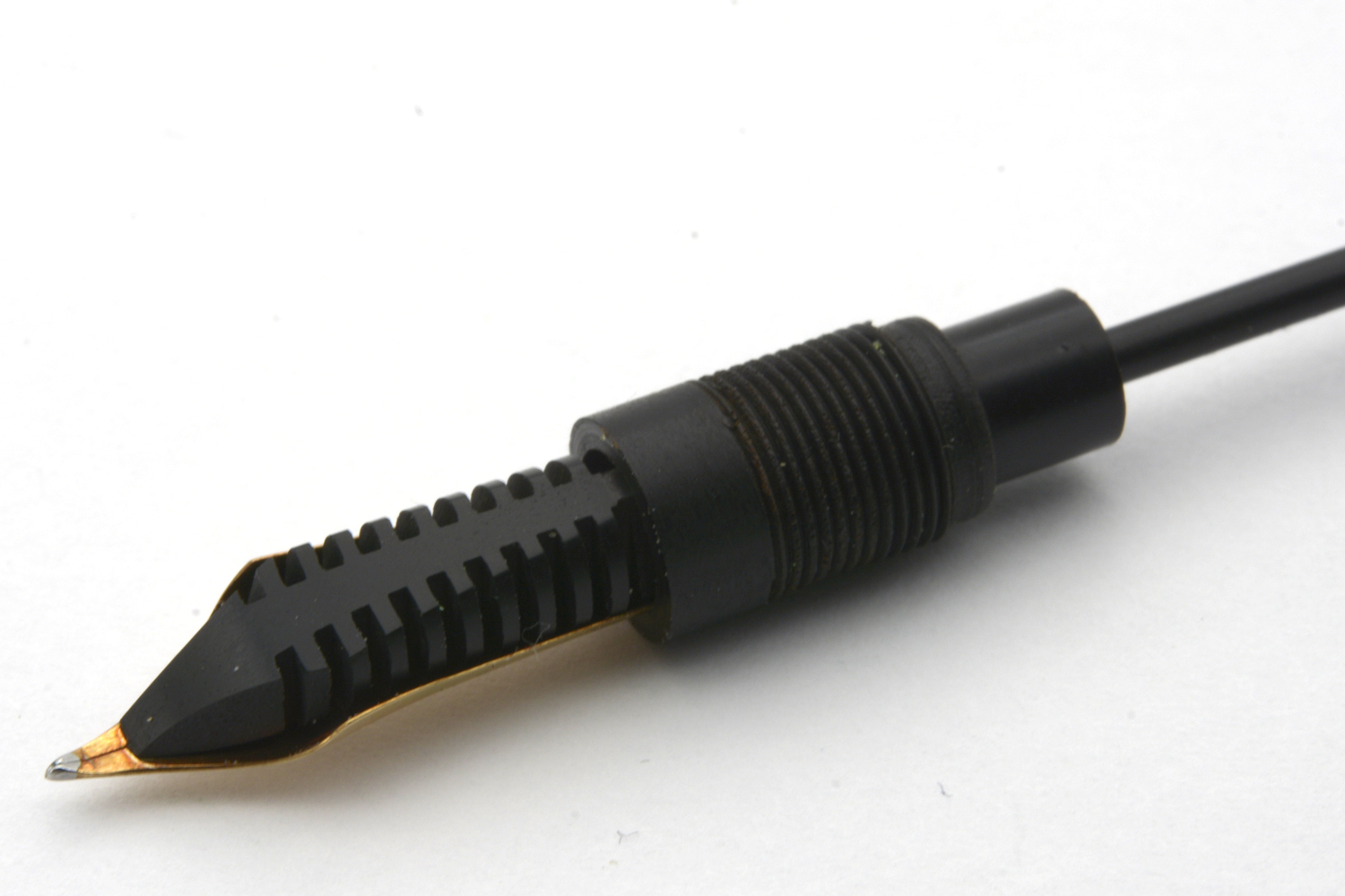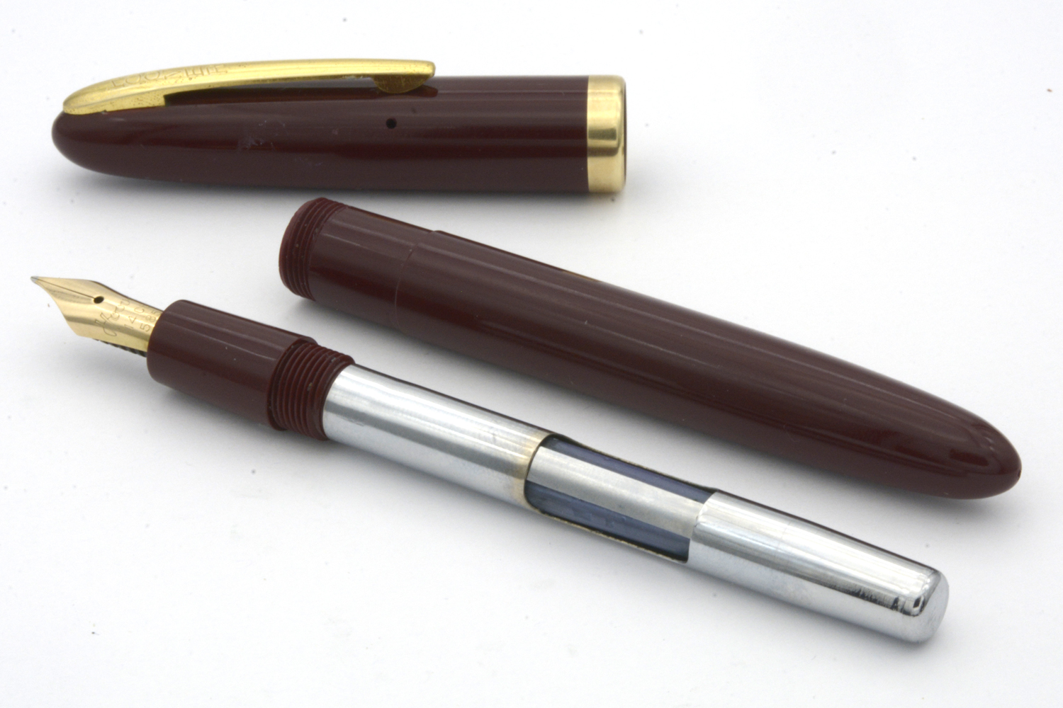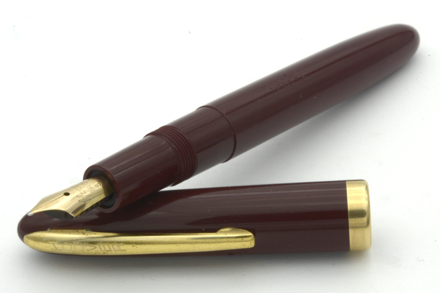 Denna fullt fungerande, vinröda Hoover - tillverkad på 1950-talet för den danska marknaden - är en aerofiller i fint skick som ligger skönt balanserad i handen, både med och utan huven postad. Pennan har ett urskruvbart stift med mediumflex som vid lätt spetstryck skriver mjukt och följsamt med F-bredd för att med högre tryck dra linjer upp till B-bredd. Pennans längd: 132 mm. Vikt: 15,5 gram.