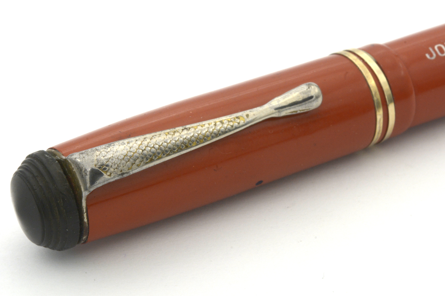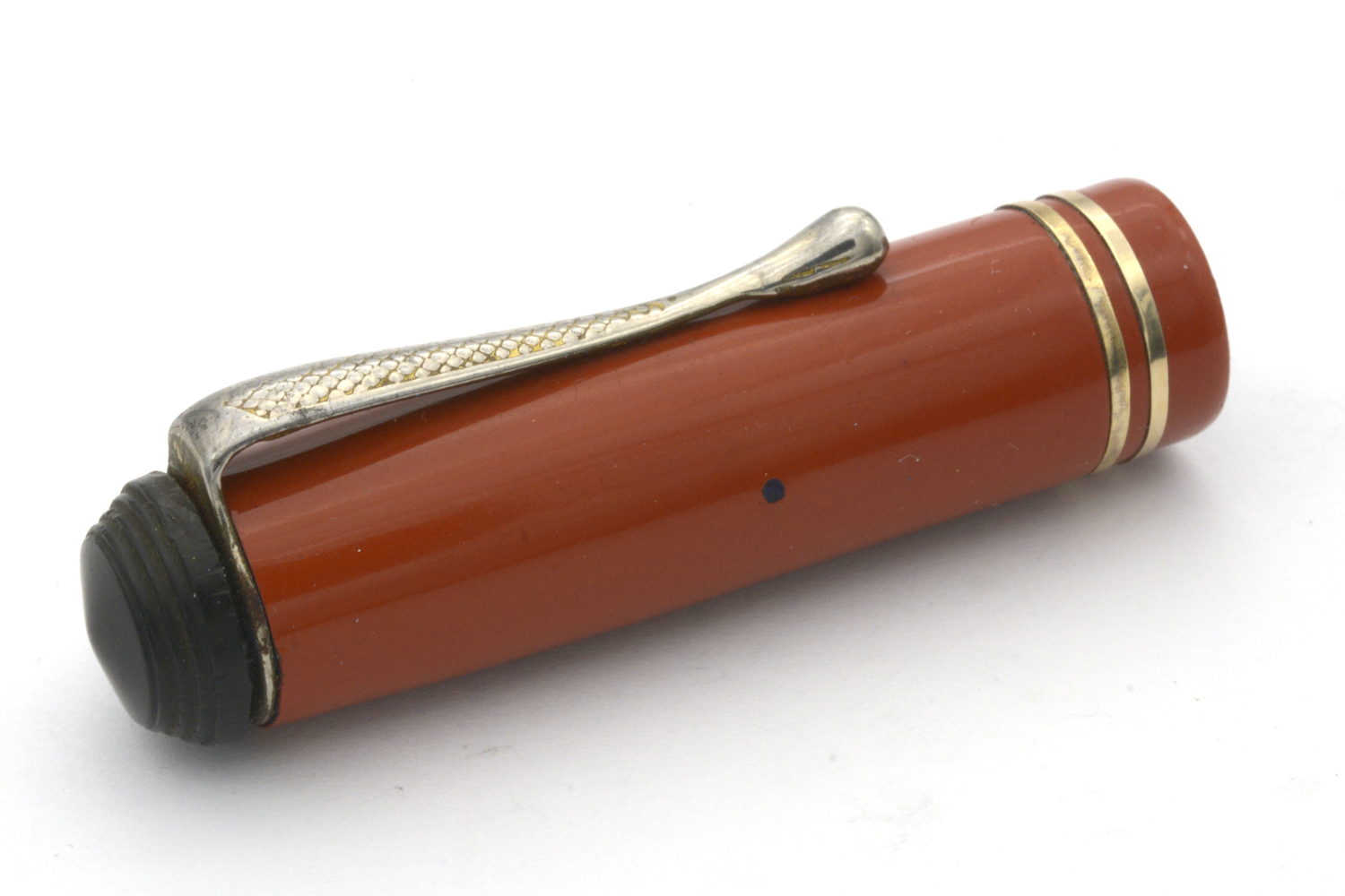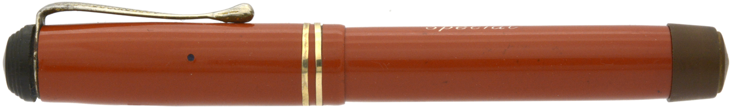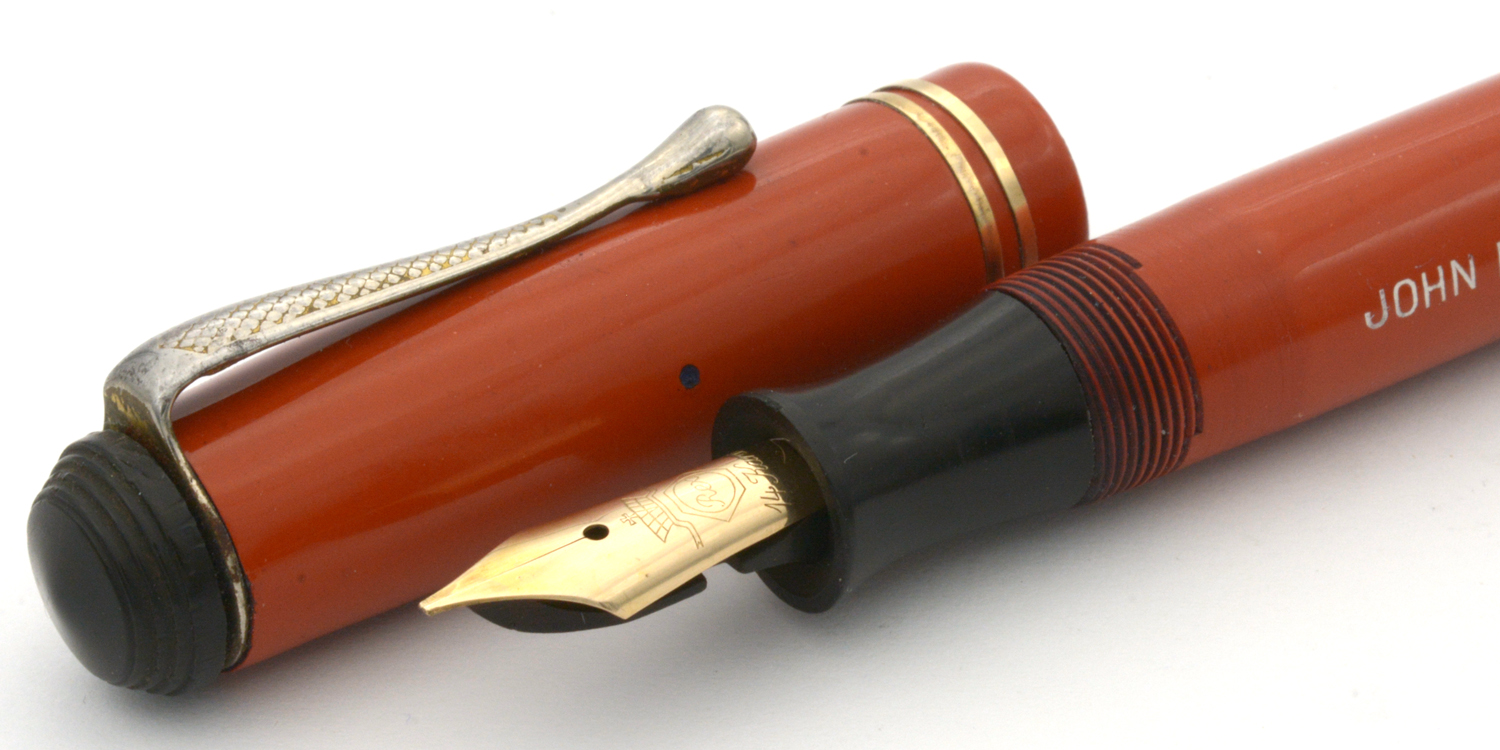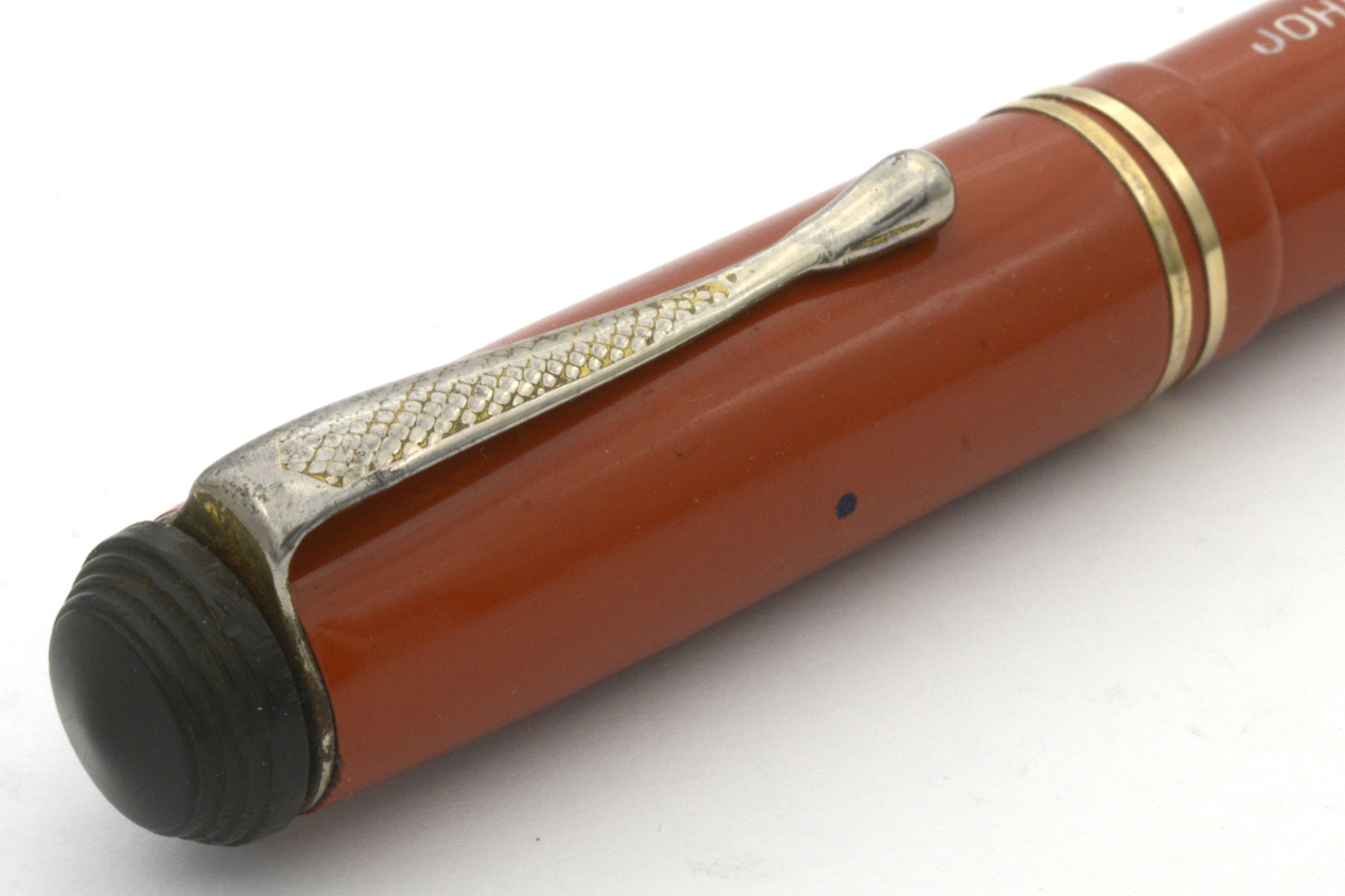 Designen på huv och behållare på denna penna signalerar 1920/30-tal, men jag är tveksam om toppskruven och – framför allt – blindhättan är original. Blindhättan är bredare än behållaren och förhindrar effektivt varje försök att använda pennan med huven postad. Dessutom är blindhättan lägre än den borde vara, vilket innebär att när den är inskruvad så trycker den in pumpknappen något.