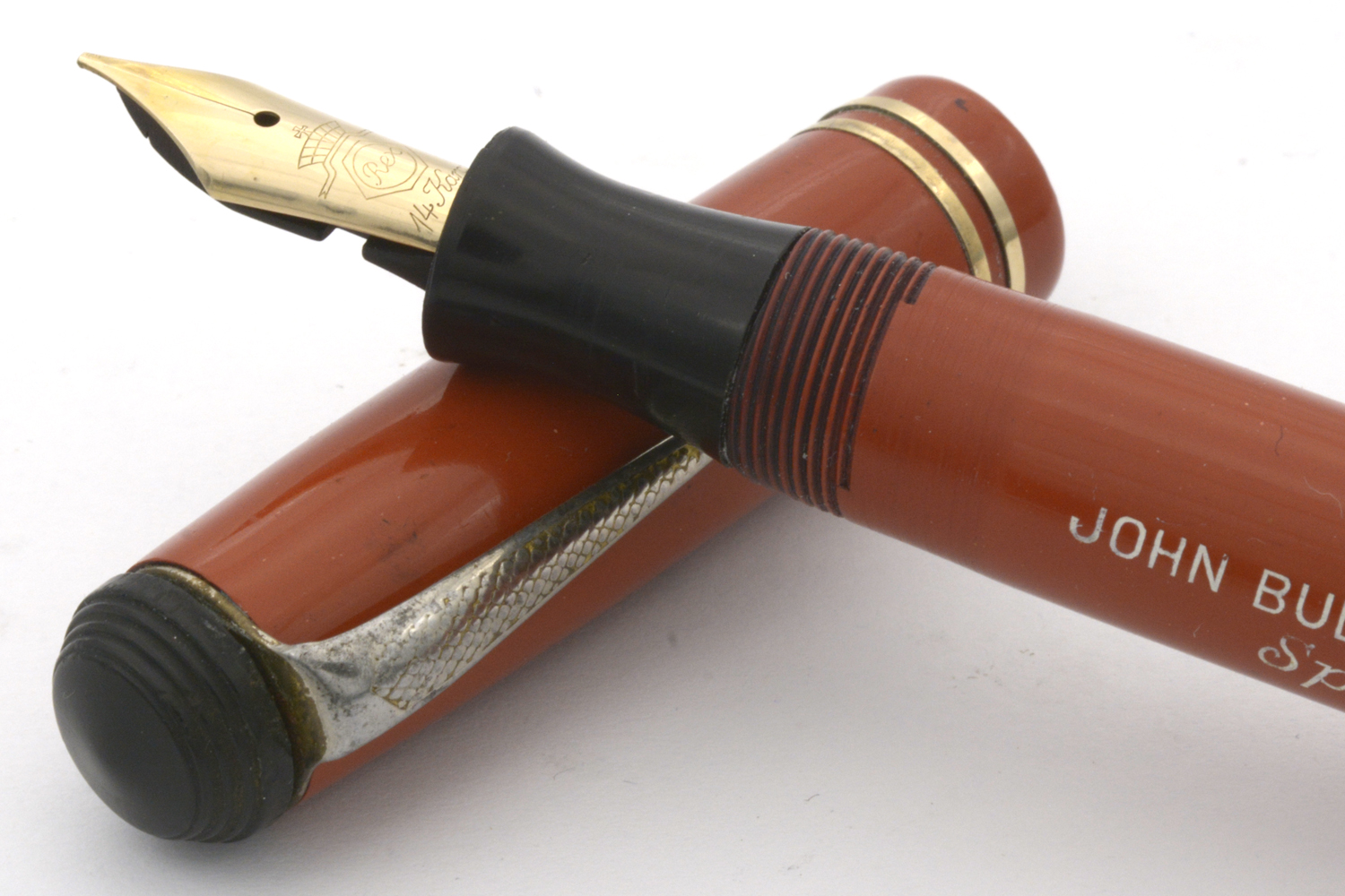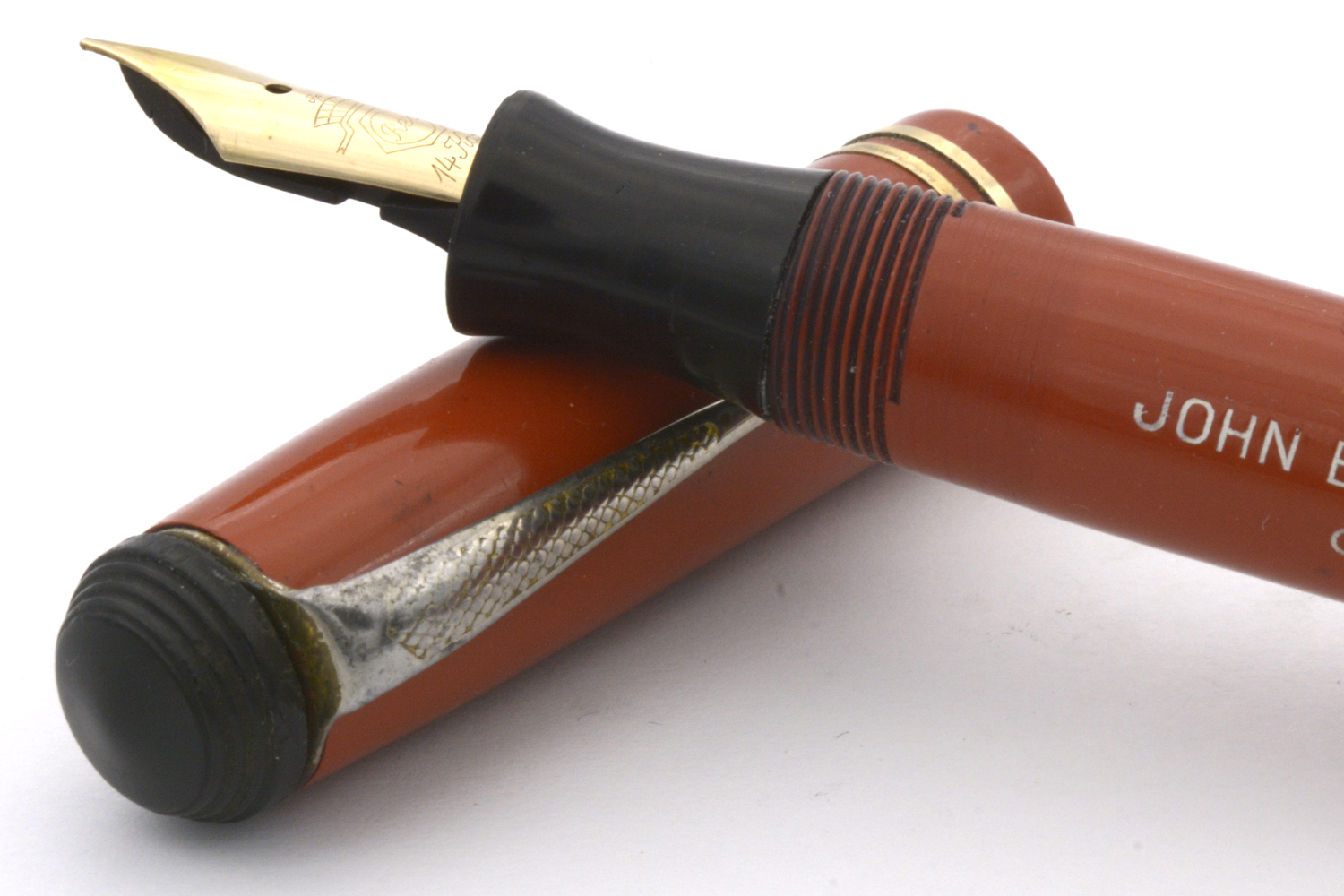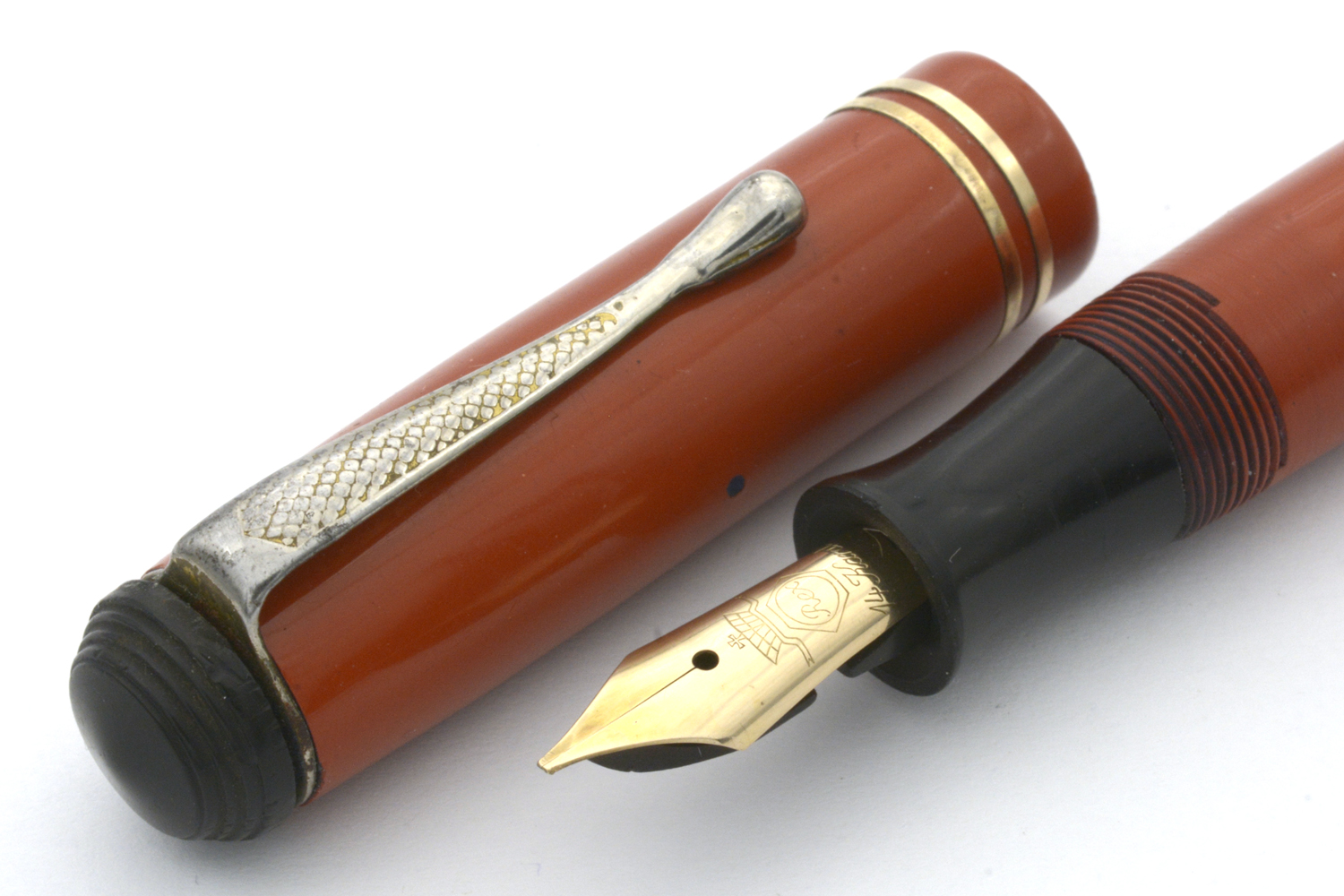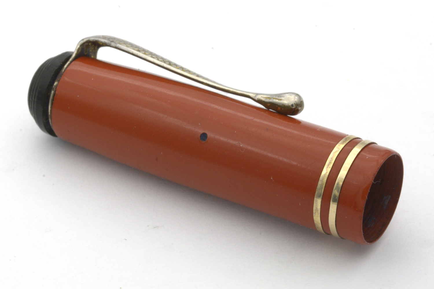 Designen på huv och behållare på denna penna signalerar 1920/30-tal, men jag är tveksam om toppskruven och – framför allt – blindhättan är original. Blindhättan är bredare än behållaren och förhindrar effektivt varje försök att använda pennan med huven postad. Dessutom är blindhättan lägre än den borde vara, vilket innebär att när den är inskruvad så trycker den in pumpknappen något.