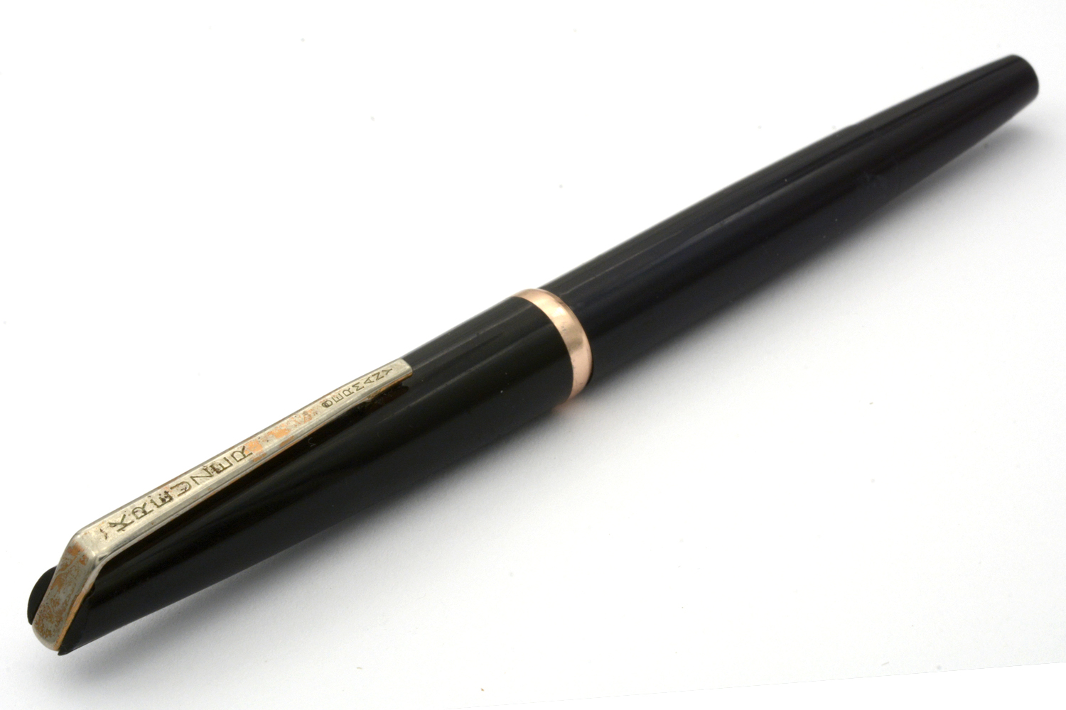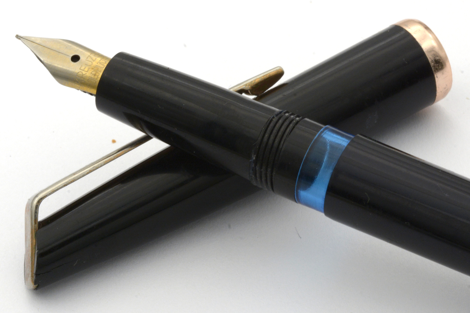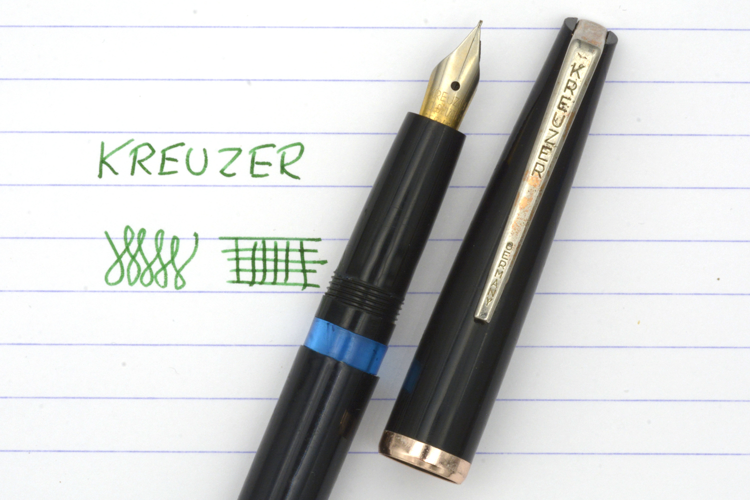 Denna Kreuzer är en enklare tysk brukspenna, gissningsvis från 1960-talet, med en väl fungerande pistongmekanism och ett stålstift som skriver löpande lätt med EF/F-bredd utan att kräva något spetstryck. Stiftets guldplätering är lite sliten och clipset har knappt någon gul färg kvar, men som vardagspenna är detta en nätt och riktigt trevlig skrivare. Längd: 134 mm. Vikt: 10 gram.