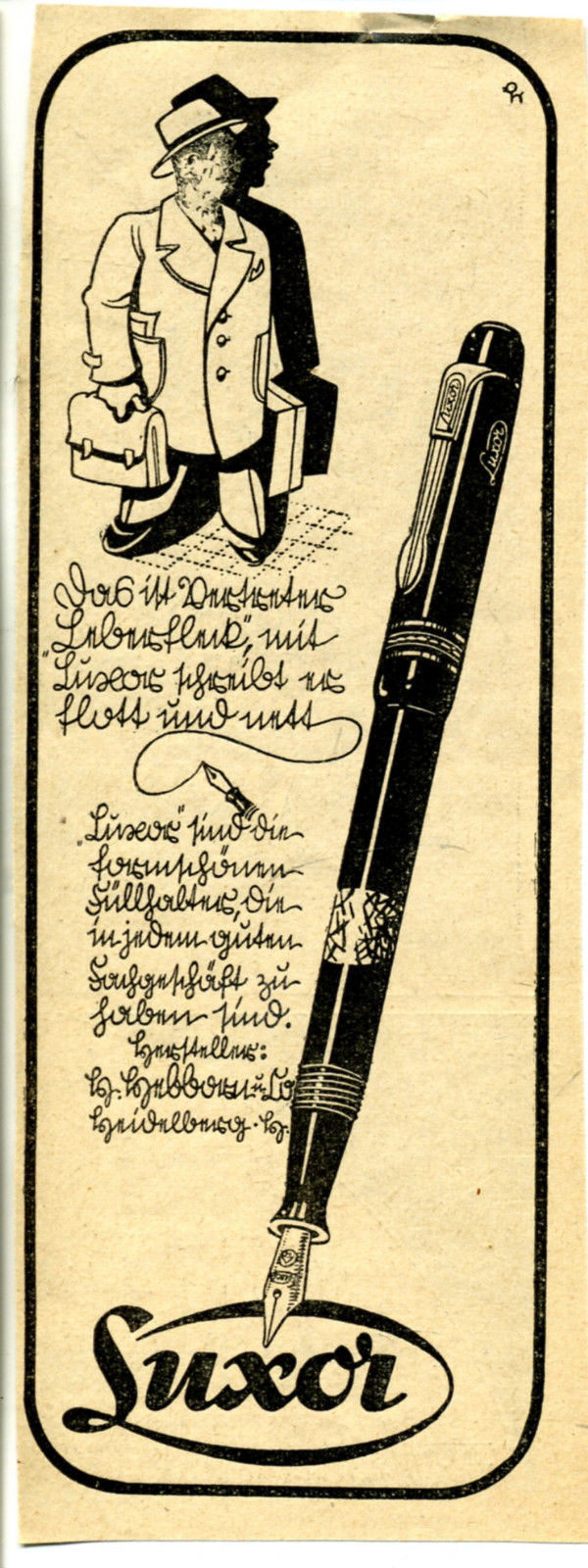 Annons publicerad före 3 januari 1941 då Hitler förklarade Sütterlin-skriften som ickearisk: »Detta är representanten Leberfleck. Med Luxor skriver han snyggt och trevligt. Luxor är de välformade reservoarpennor som man hittar i varje fackhandel.»