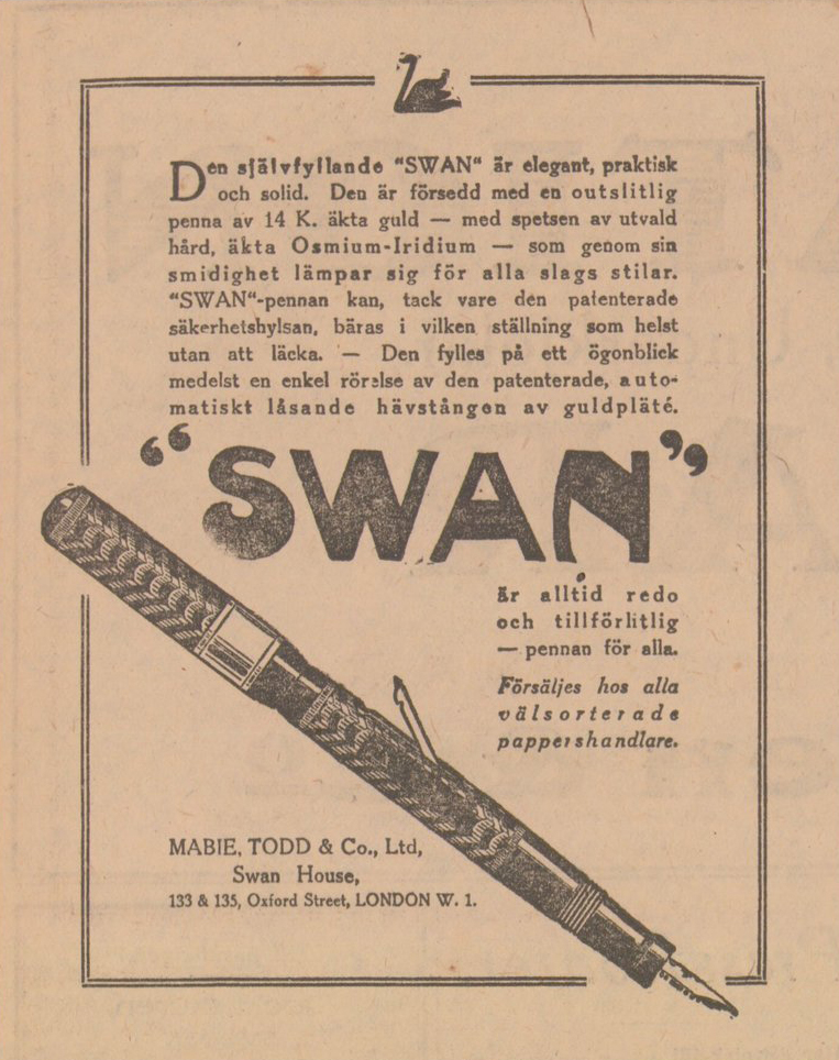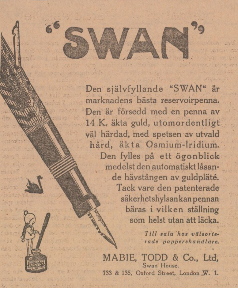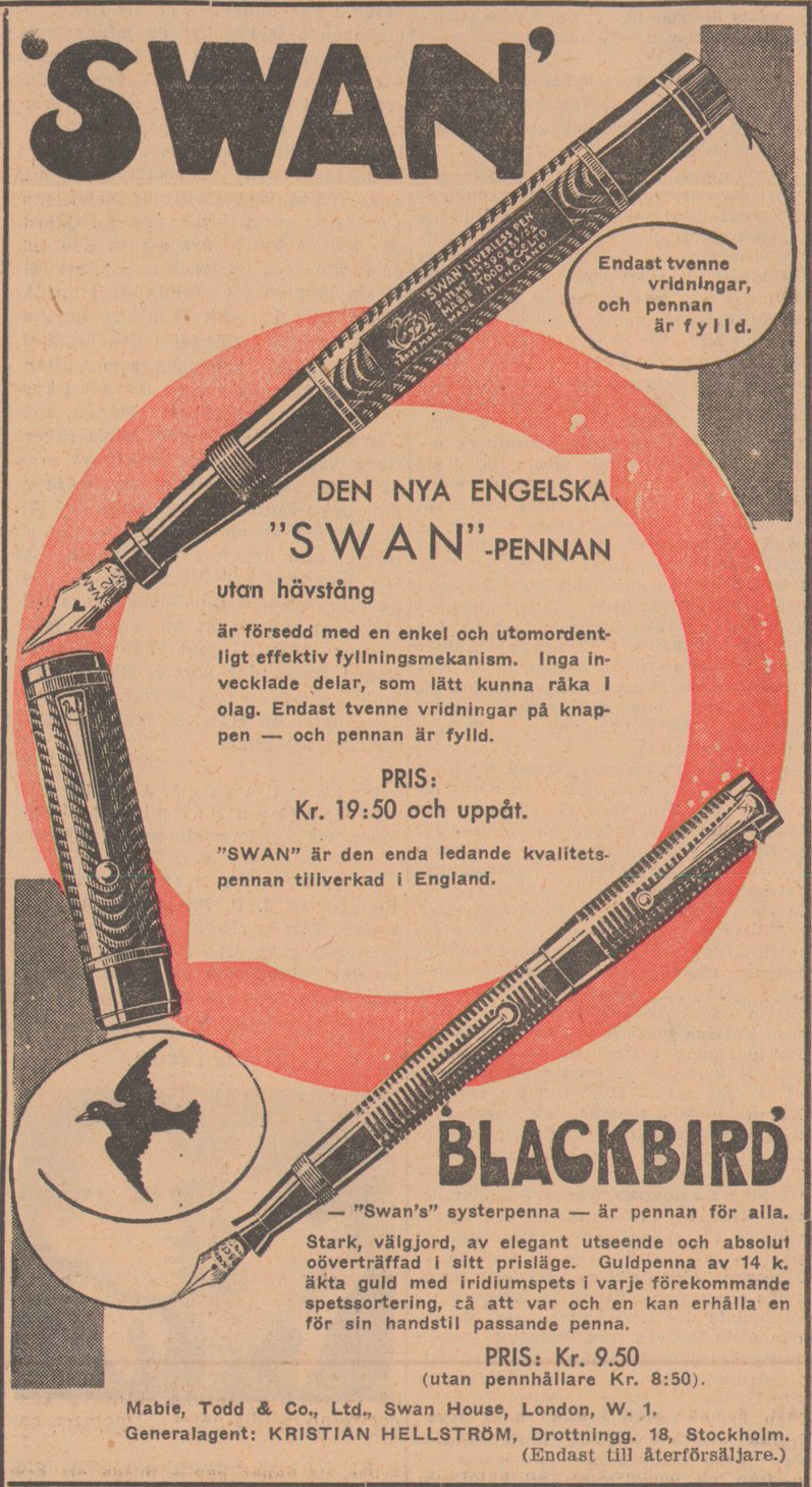Åven om Mabie, Todd & Co var framgångsrika som tillverkare var de inga större tekniska innovatörer utan hängde snarare med »tåget». Deras första modell med hävstångsfyllare – Swan Self Filling Pen – kom 1918 och celluloid-pennor började man tillverka 1927, men 1932 presenterade man en »vridfyllare» som på sitt sätt var lite innovativ.