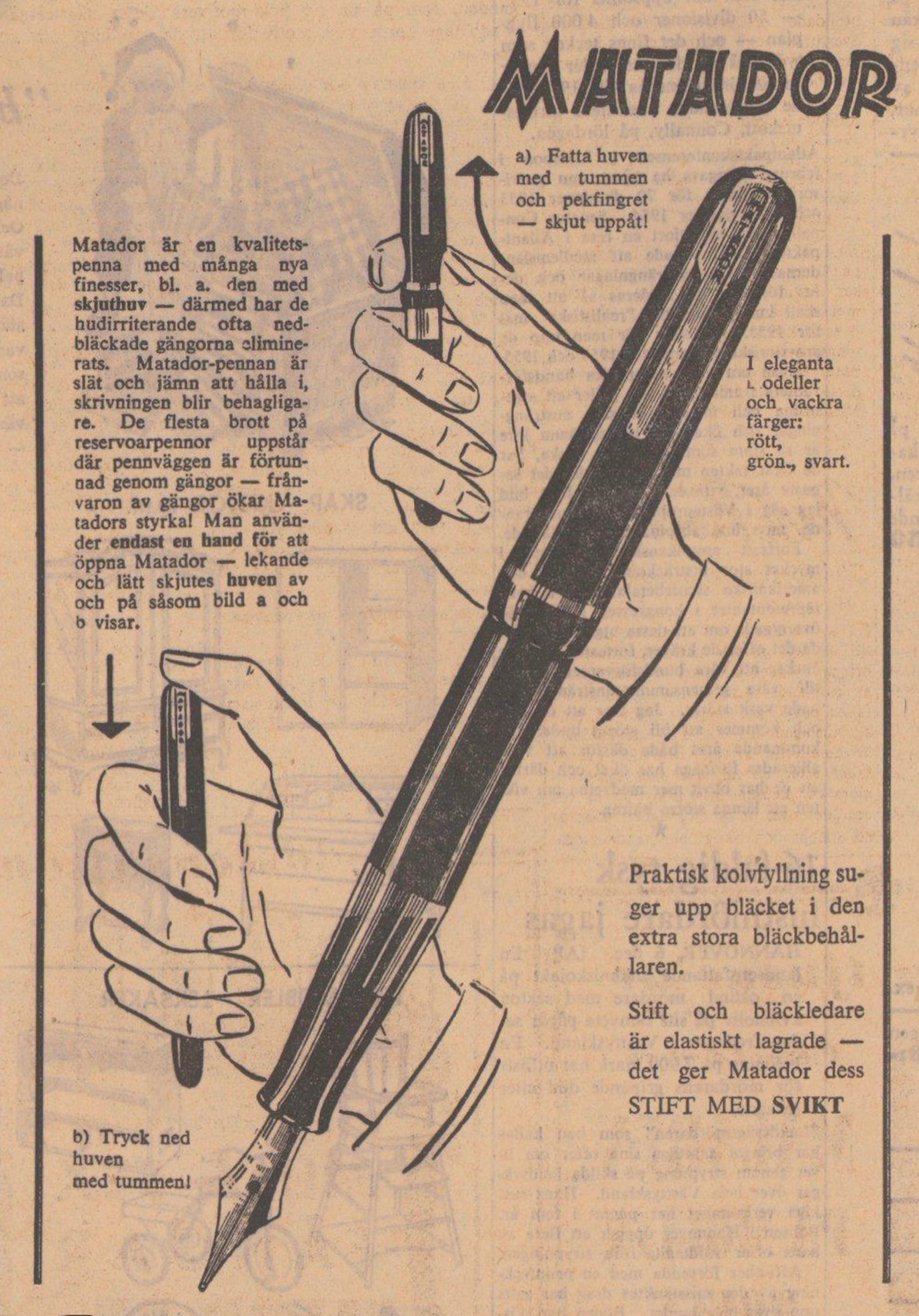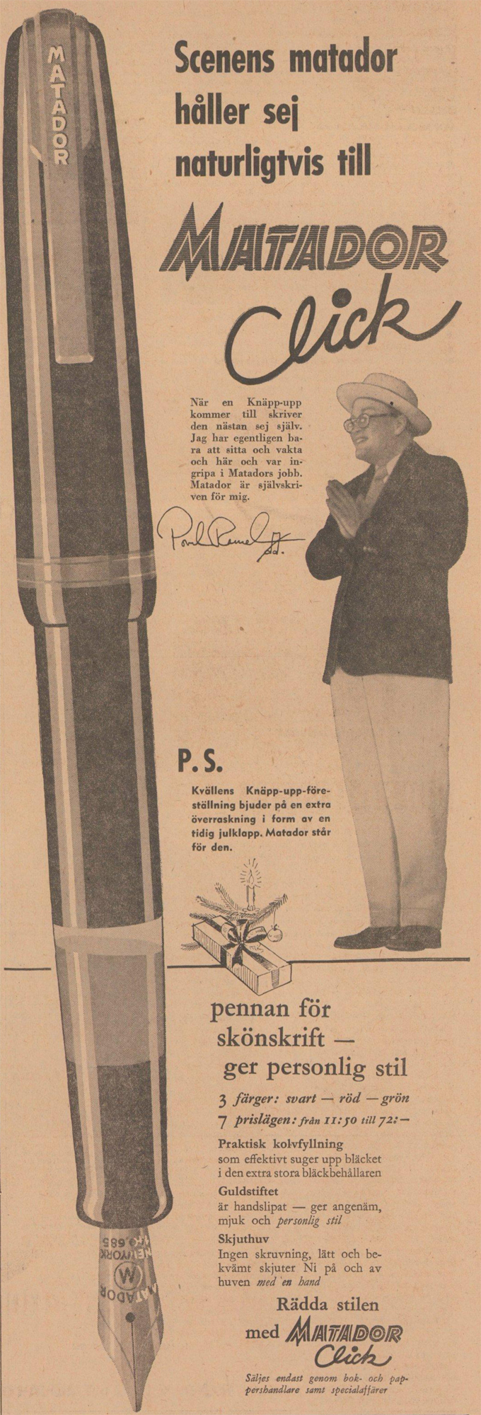 Någonstans runt 1949 lanserade Matador den första pennan med en huv som inte behövde skruvas på utan slöt tätt tack vare förslutning inne i huven. När huven trycks ner och sitter fast hörs ett »klick» och följaktligen gav man pennan det onomatopoetiska namnet »Click». Den svenska generalagenten - Rosendahls Fabriker AB i Filipstad - kallade huven för en »skjuthuv», och i sina annonskampanjer presenterade man huven som »en bekväm nyhet. Ingen skruvning, lätt och bekvämt skjuter Ni på och av huven». Dessutom, underströks det i annonserna, så slapp man »störande gängor vilka samlar bläck och irriterar vid skrivningen».