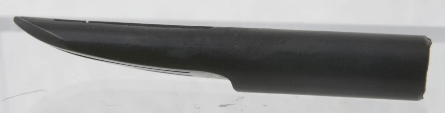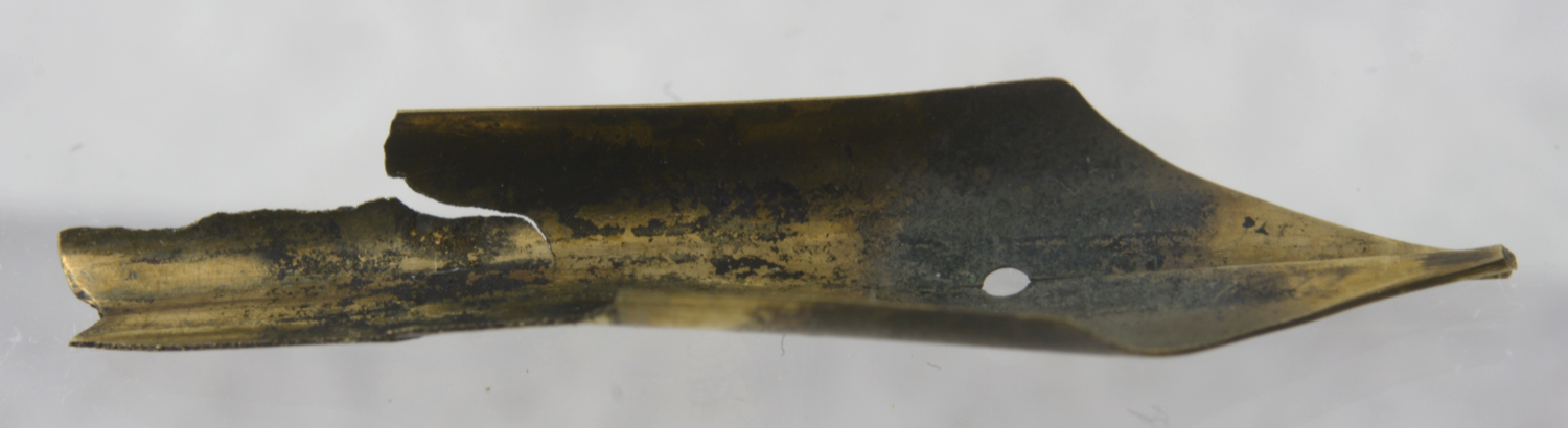 Kommentar #3: pennan har några tydliga, yttre skador: a) en liten grop på förstycket, samt b) en liten ytskada vid pennans ingraverade namn.