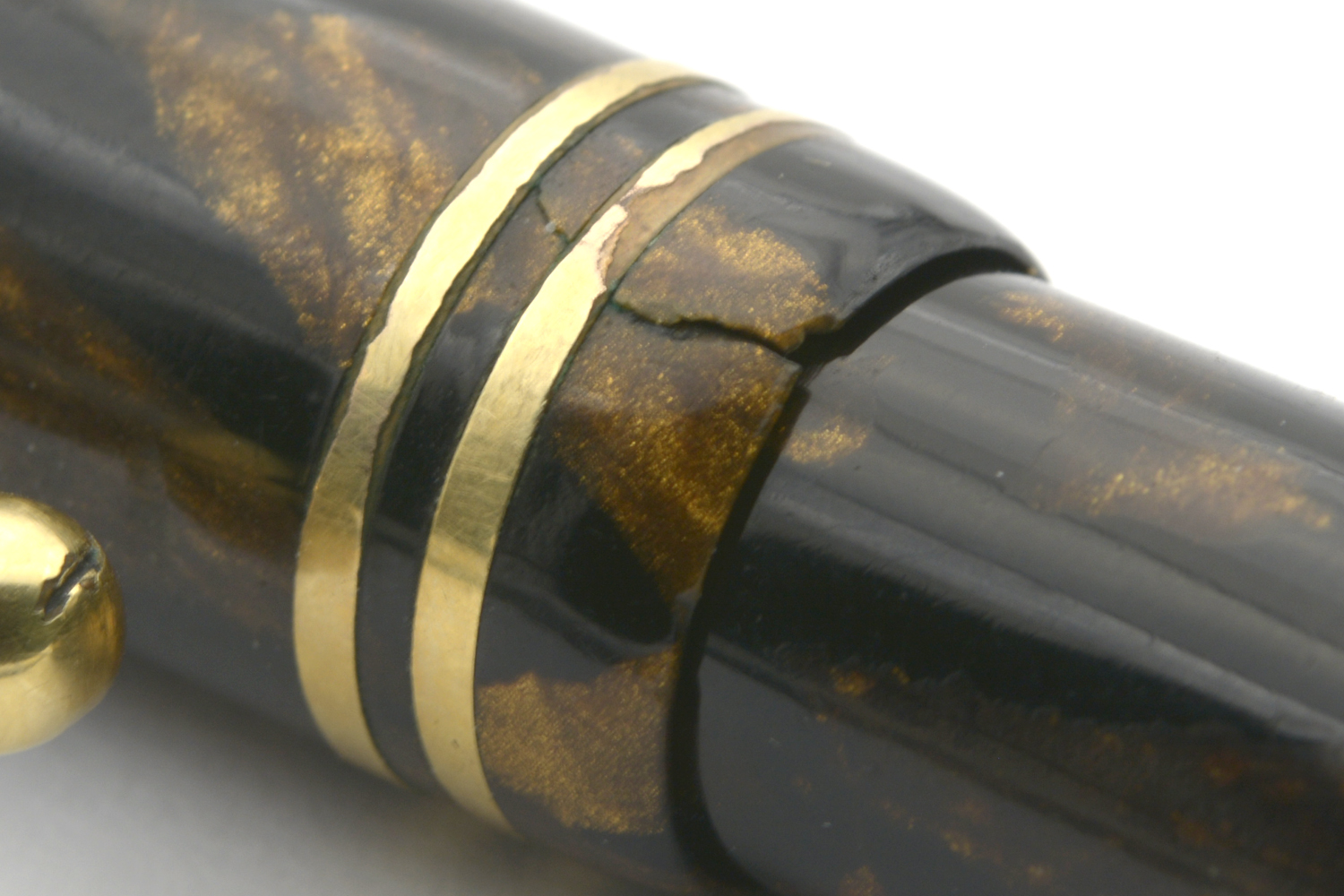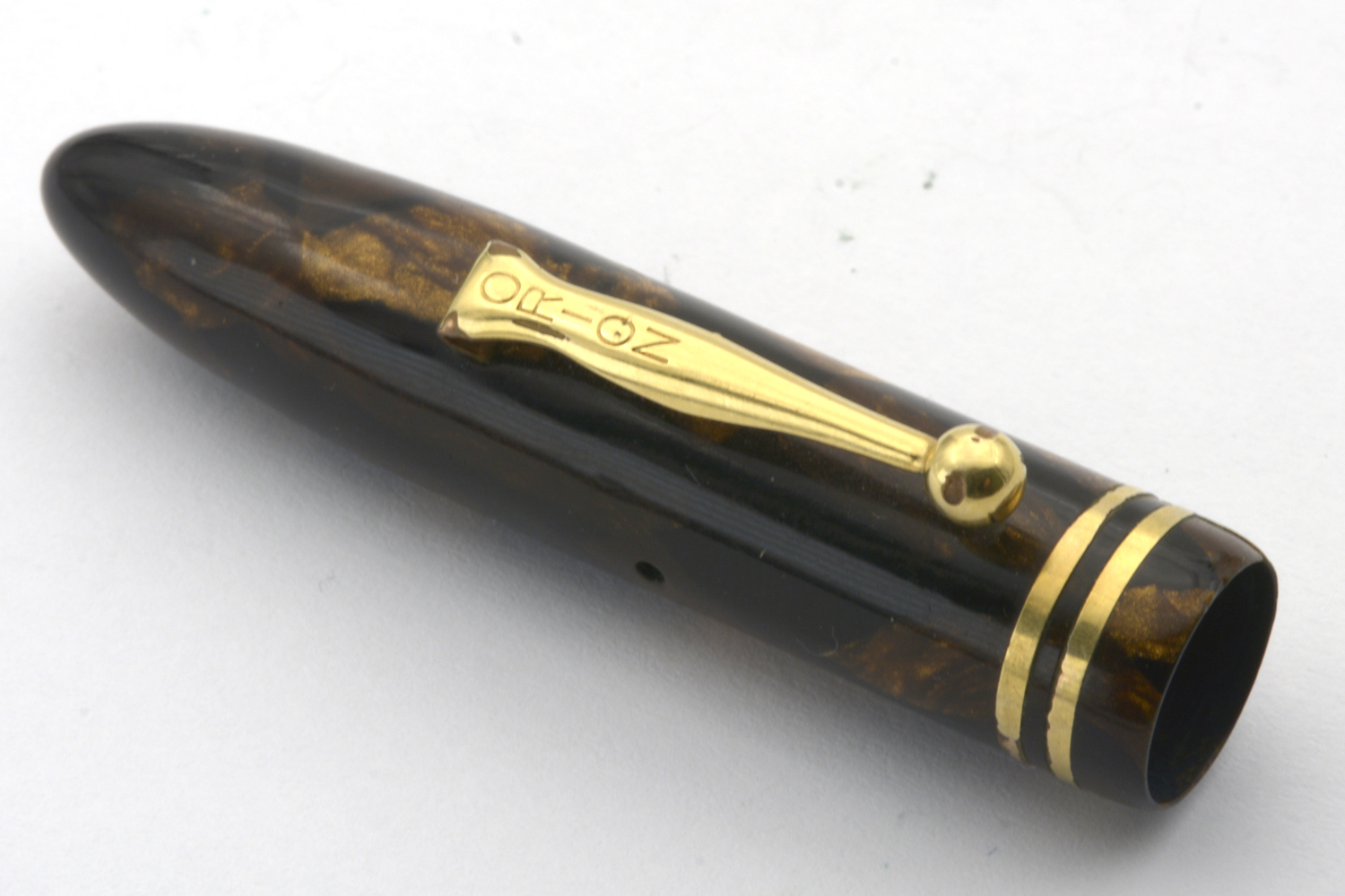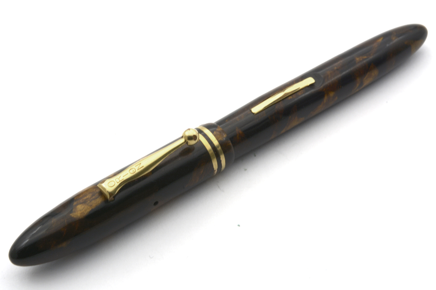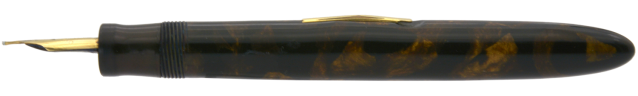 Pennan är en hävstångsfyllare vars brunmarmorerade färg har en fantastisk lyster som tyvärr inte alls kommer fram i mina bilder. Dess huv har en spricka och förgyllningen har små skador, men med tanke på pennans ålder är den i ett bra exteriört skick. Dess originalstift har F/M-bredd med en flex som förefaller vara enorm. Jag uppskattar maxbredden till BBB, men jag har inte testat det med bläck. Stiftet har en svag fellinjering, men verkar vara så mjukt och följsamt att jag misstänker att detta inte märks när man skriver med pennan. Noterbart är den lilla »inbuktning» som finns på stiftets ovansida strax invid spetsen. Vad den fyller för funktion vet jag i dagsläget inte.