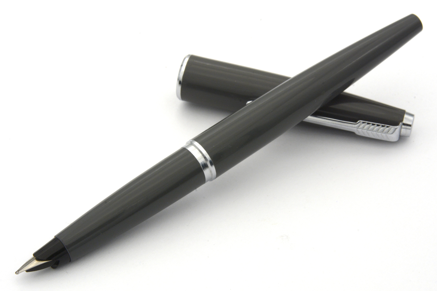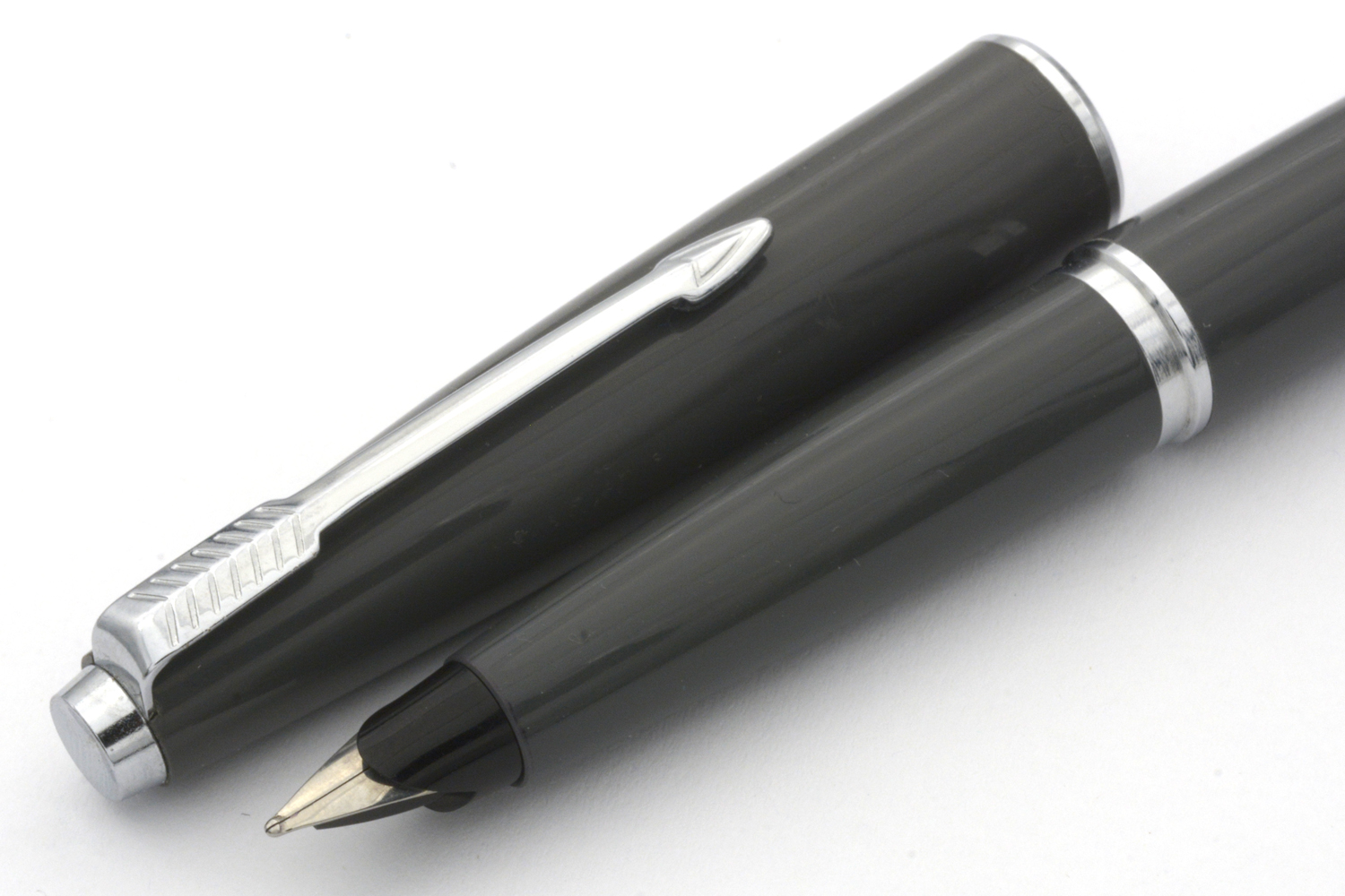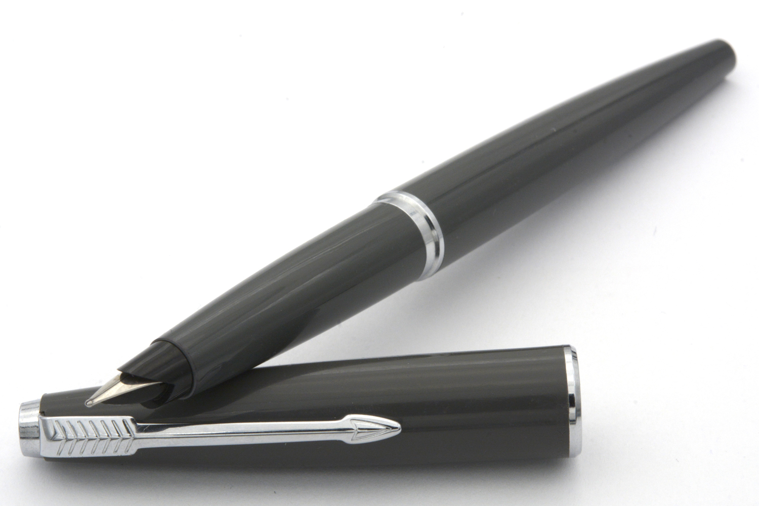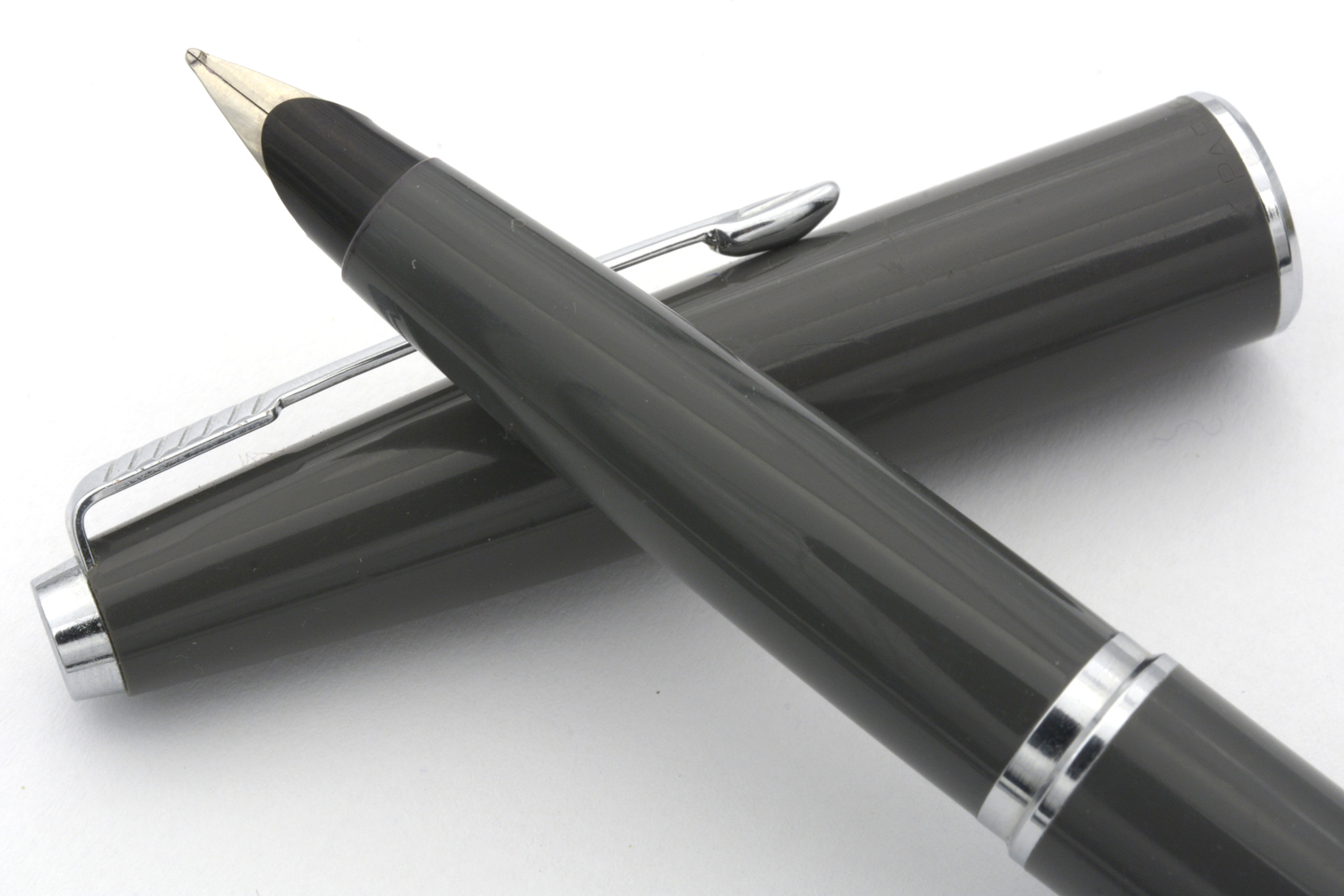 Parker 45 Arrow – senare också benämnd CT – introducerades 1962 som ett mer kostnadseffektivt alternativ till Classic-modellen, vilket dels skedde genom nya maskiner och dels genom att metallhuven ersattes med en huv i plast. Denna penna är tillverkad före 1970 då huvens clip-skruv fick ett annat utseende, varför jag tentativt daterar den till 1965.