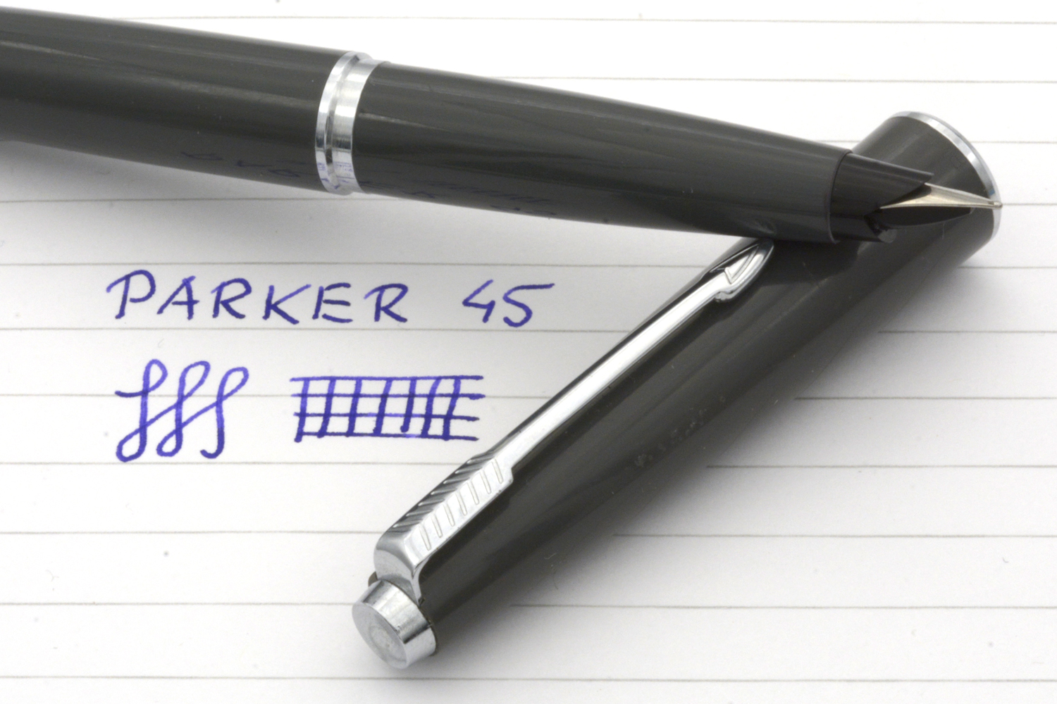 Parker 45 är härliga pennor att skriva med, och denna penna är inget undantag. Utöver några mindre märken på huven från tidigare ägare är den i bra bruksskick. Dess stålstift skriver mjukt och följsamt med F/M-bredd vid lätt spetstryck, och trots att pennan är lätt ligger den skönt balanserad i handen. På stiftet anges att det är M-bredd, men jag upplever den vara närmare F-bredd.