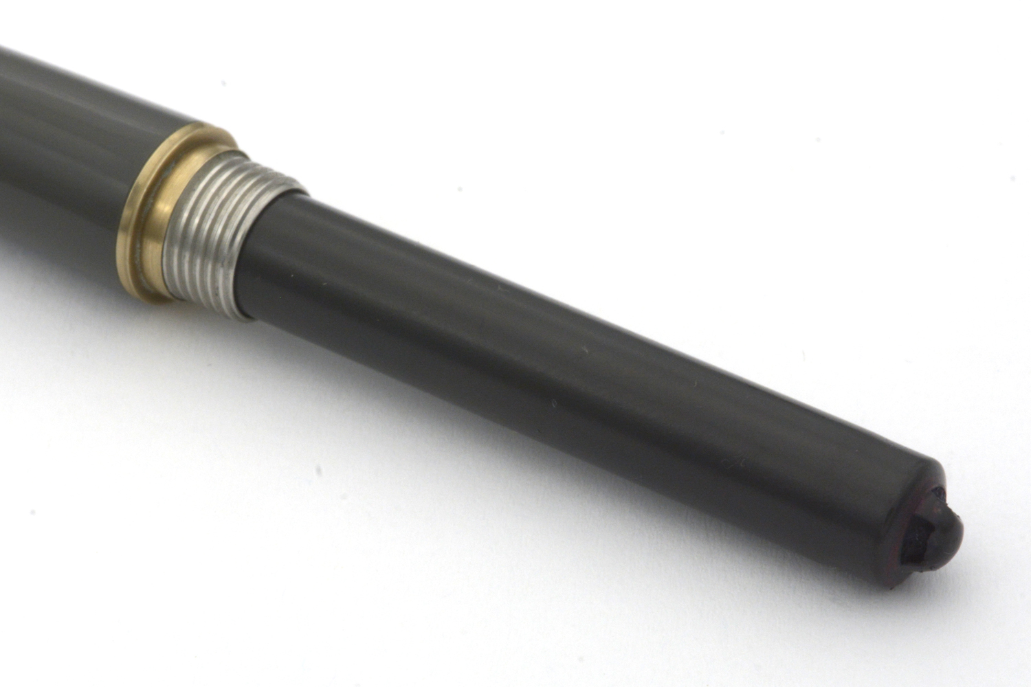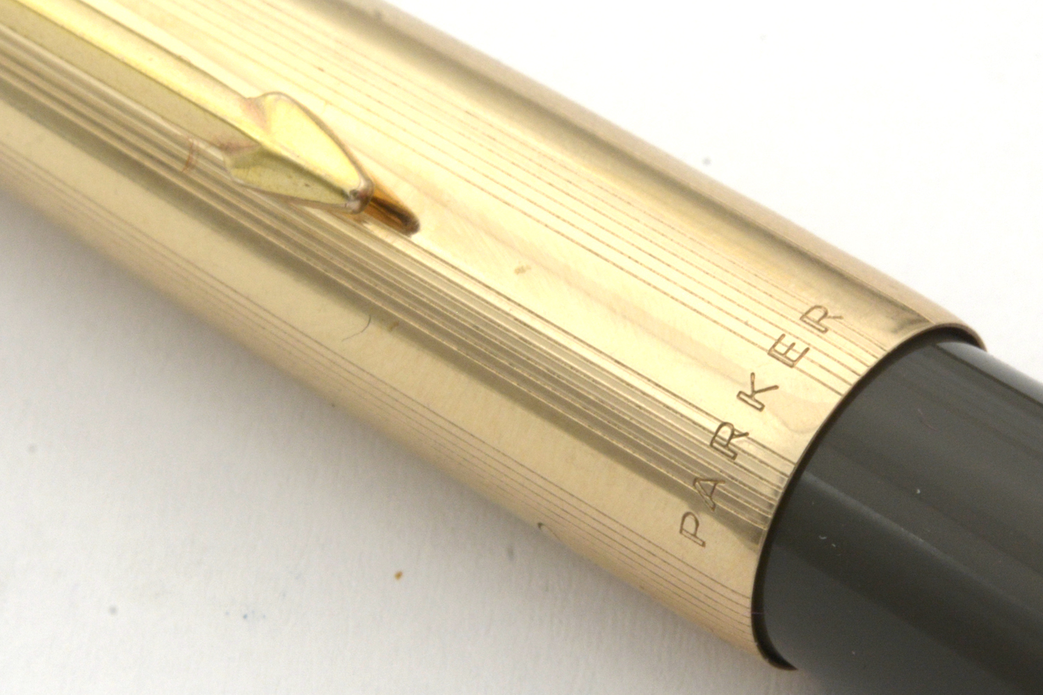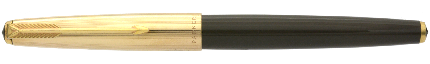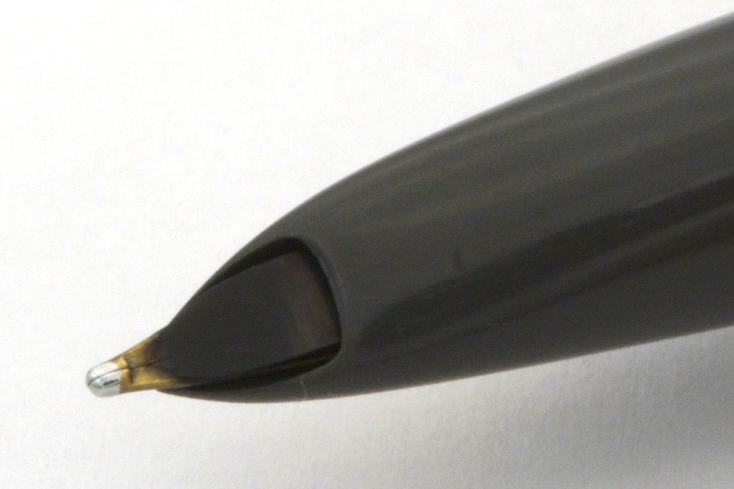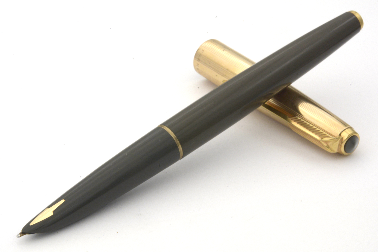 Denna väl fungerande, grå Parker 61 med guldhuv i fint skick är tillverkad i England omkring 1965 och försedd med den självfyllande kapillärfyllning som Parker lanserade under 1950-talet. Ligger bra balanserad i handen både med och utan huven postad, och dess guldstift skriver mjukt och följsamt med F-bredd vid lätt spetstryck. Pennans längd: 134 mm. Vikt: 19,3 gram.