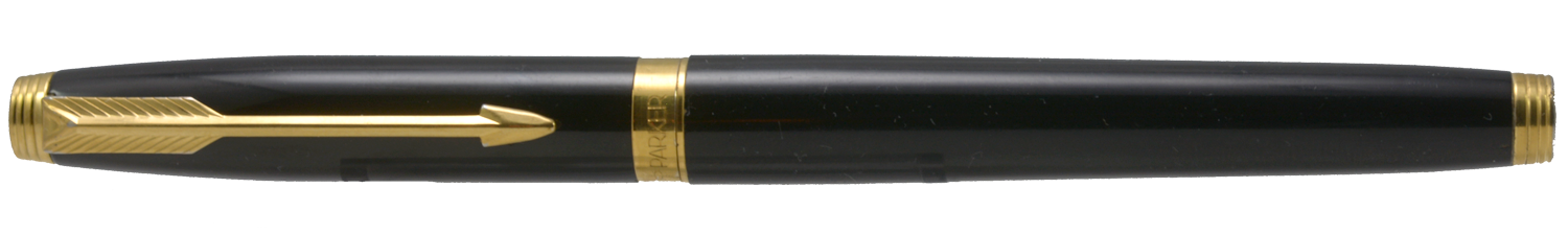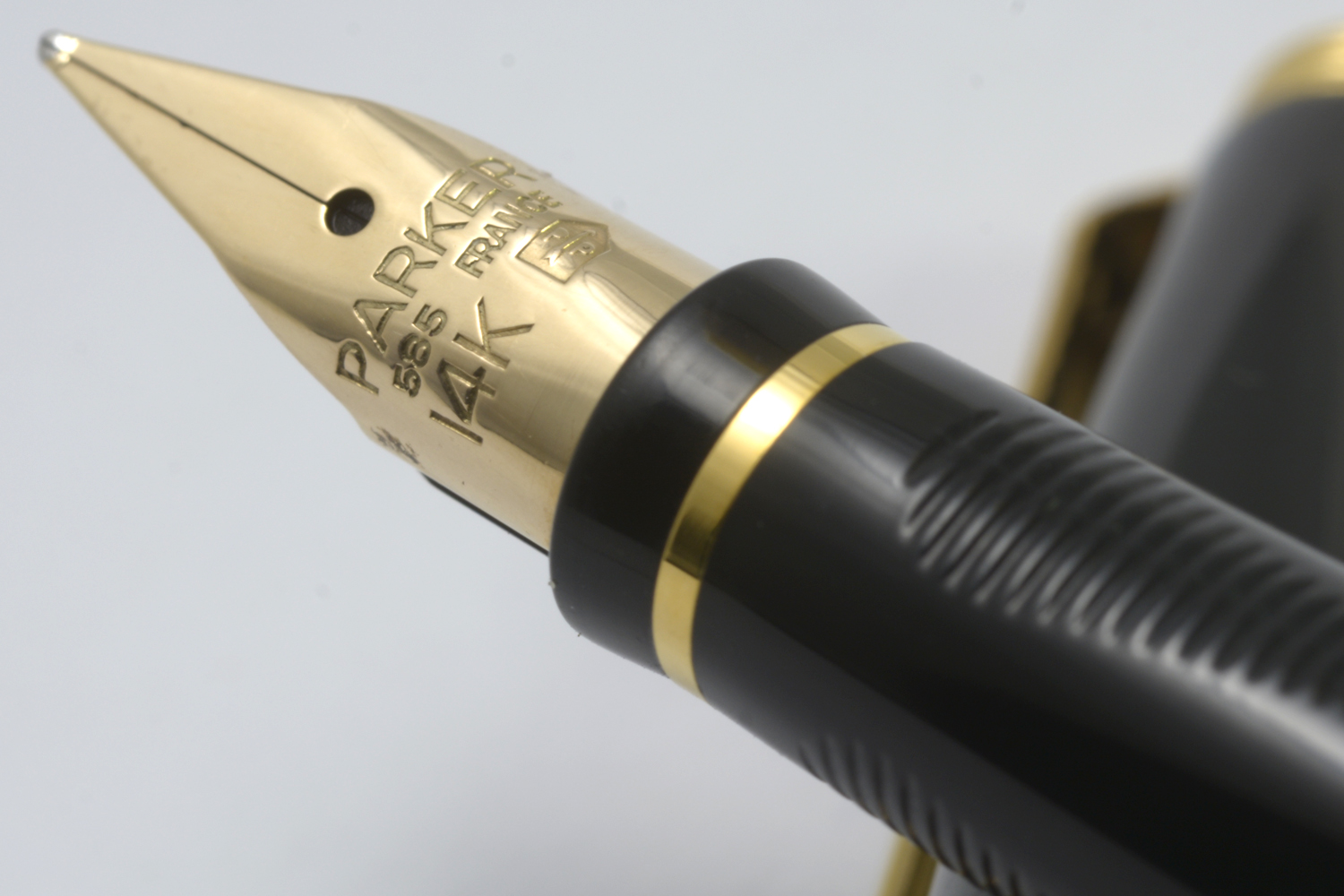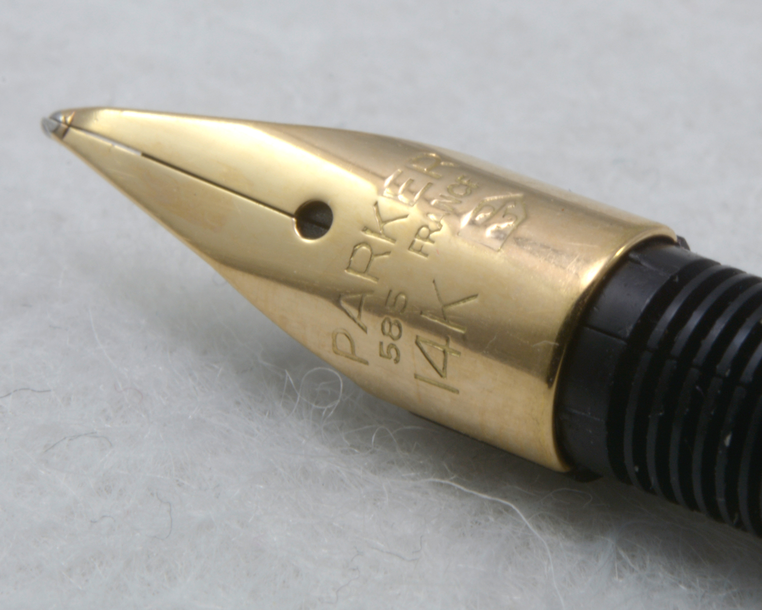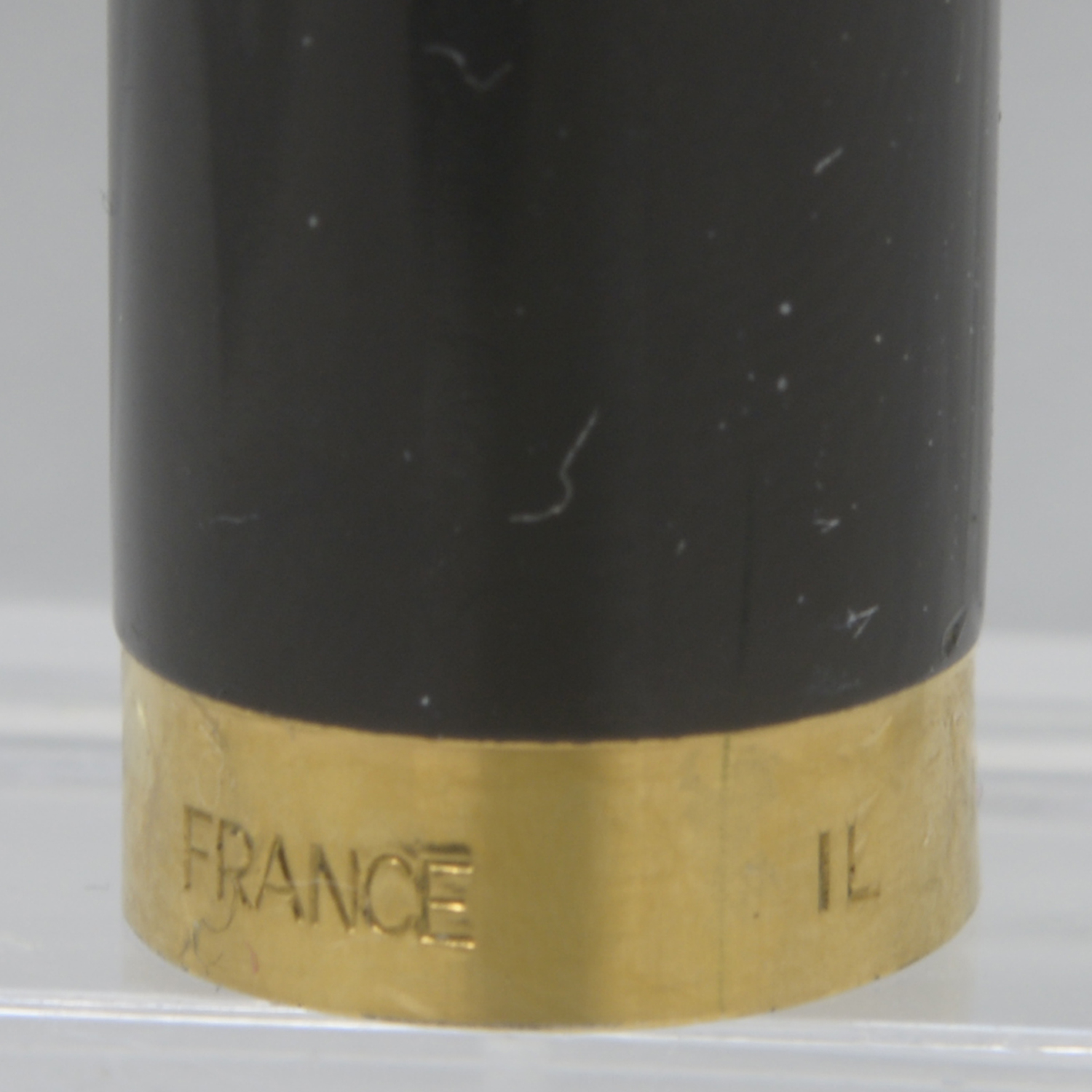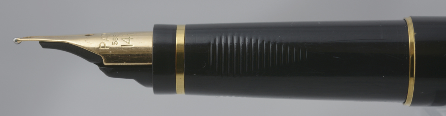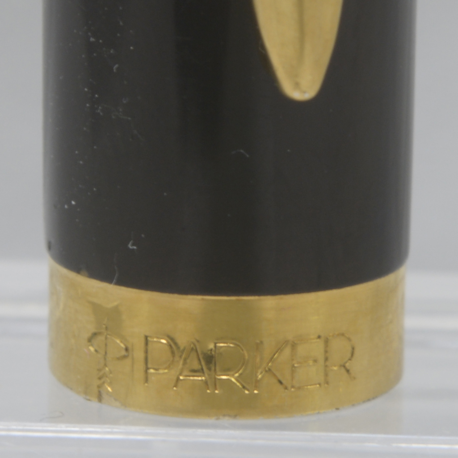 Nederst på huven finns en förgylld, 3,6 mm bred ring med präglad text: [logotyp] PARKER | FRANCE | IL