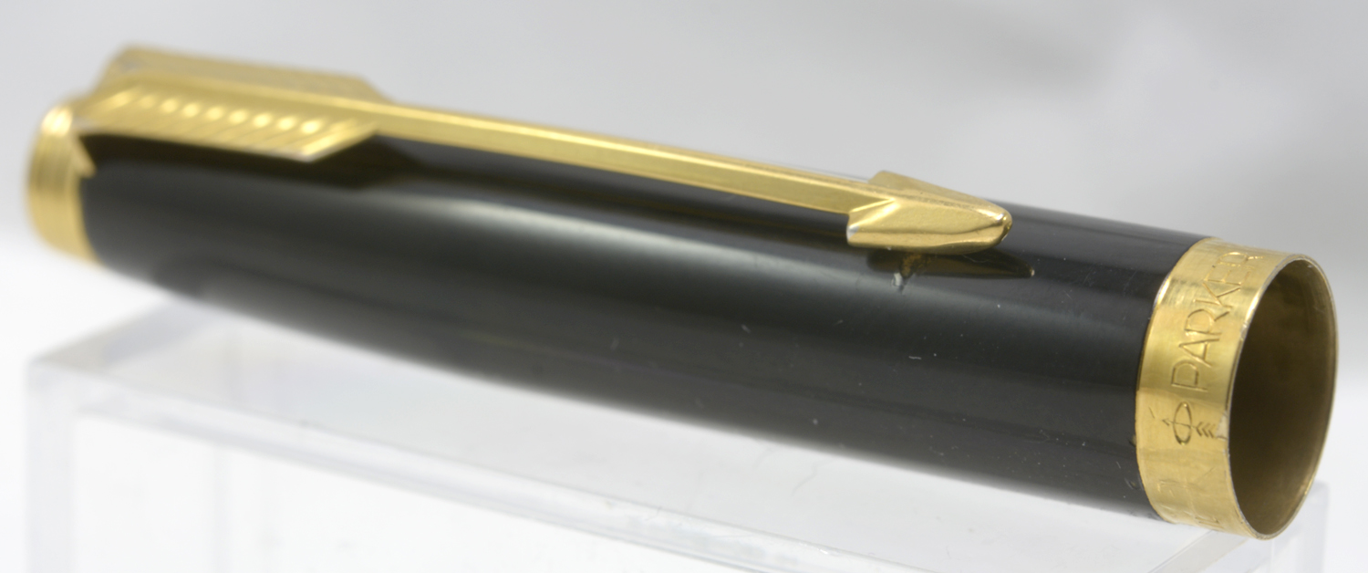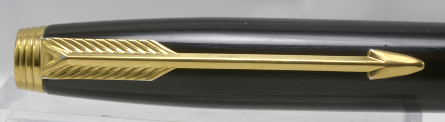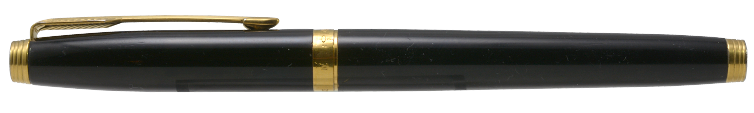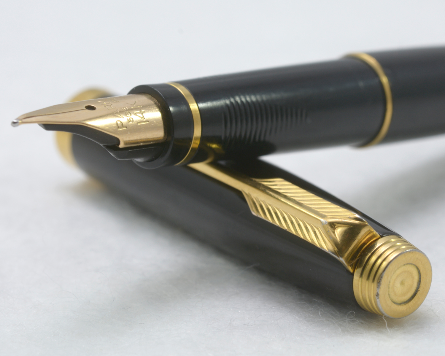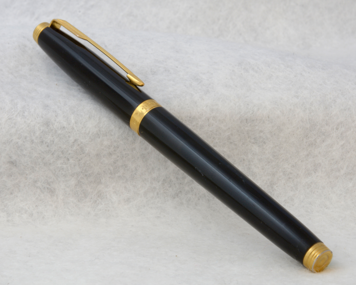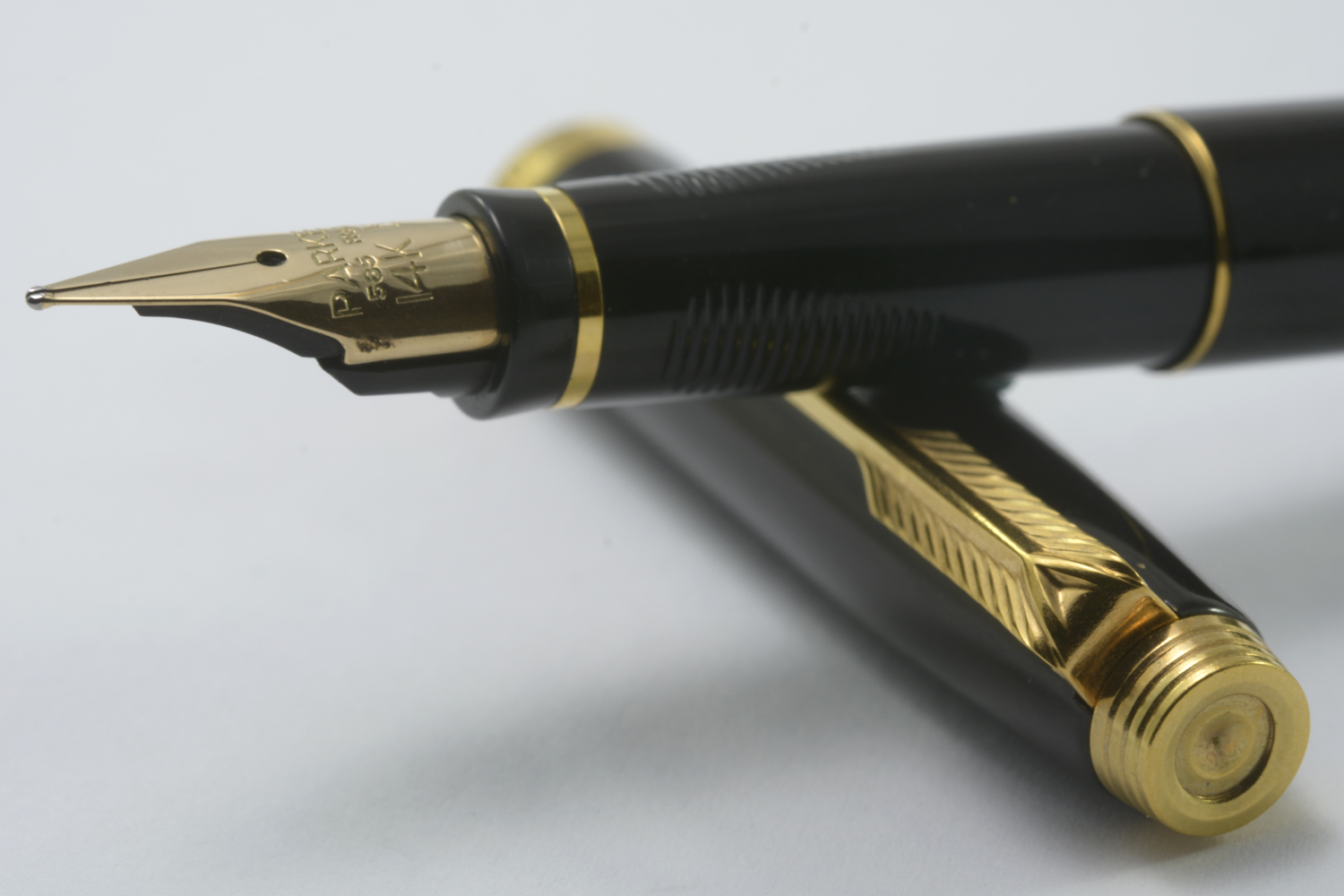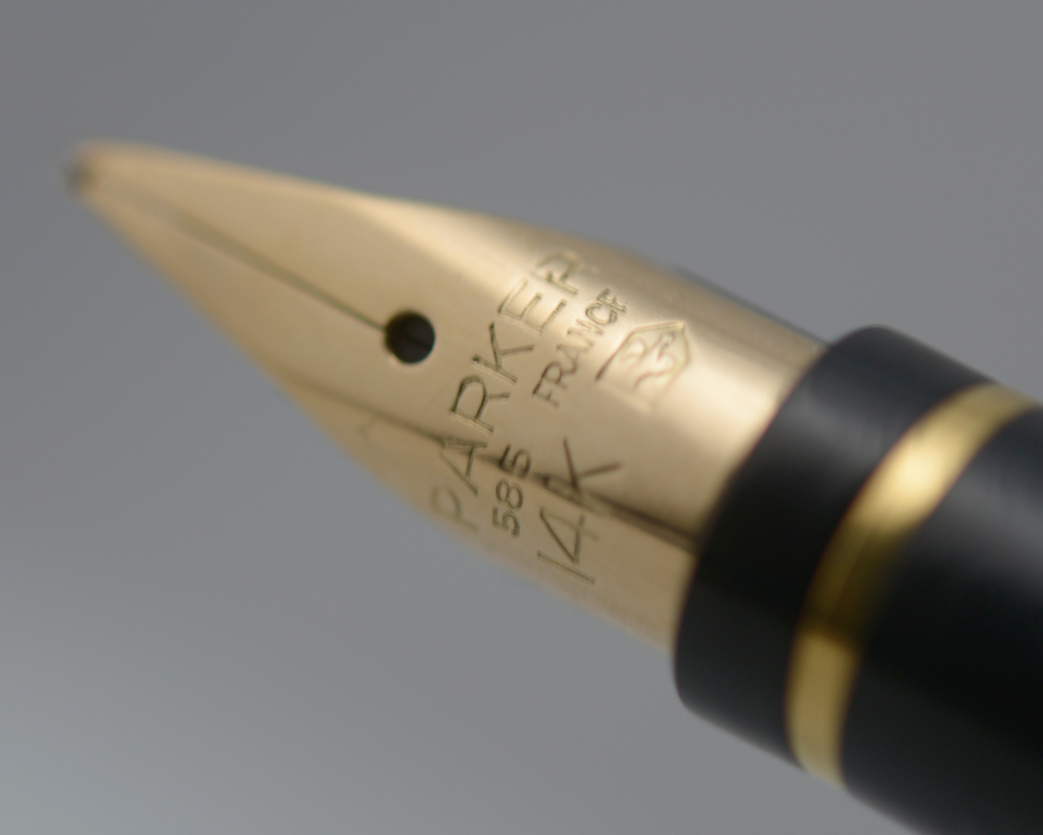 Nederst på huven finns en förgylld, 3,6 mm bred ring med präglad text: [logotyp] PARKER | FRANCE | IL