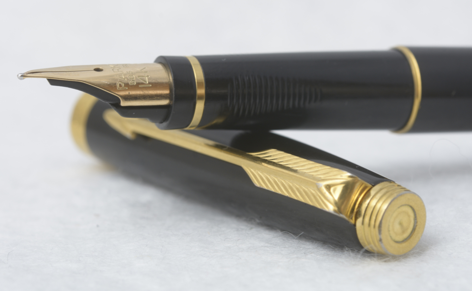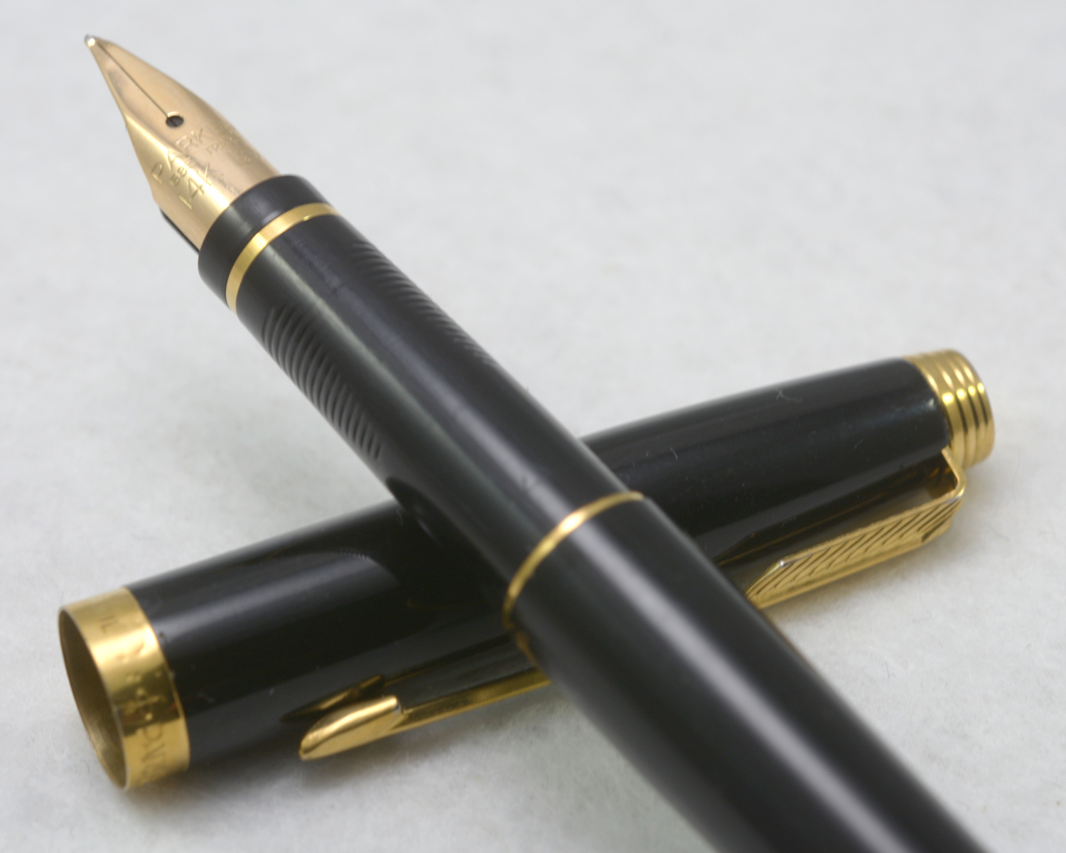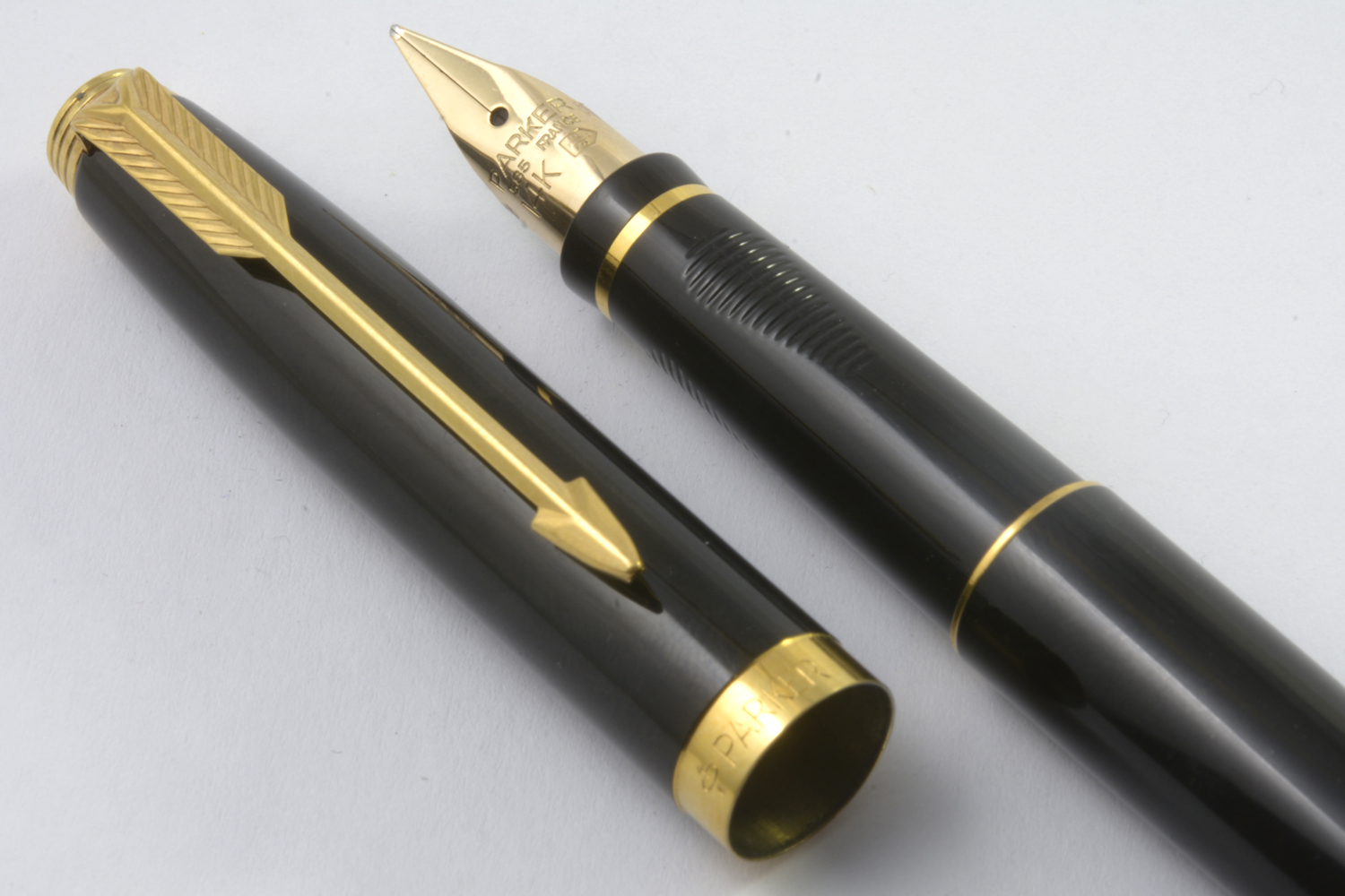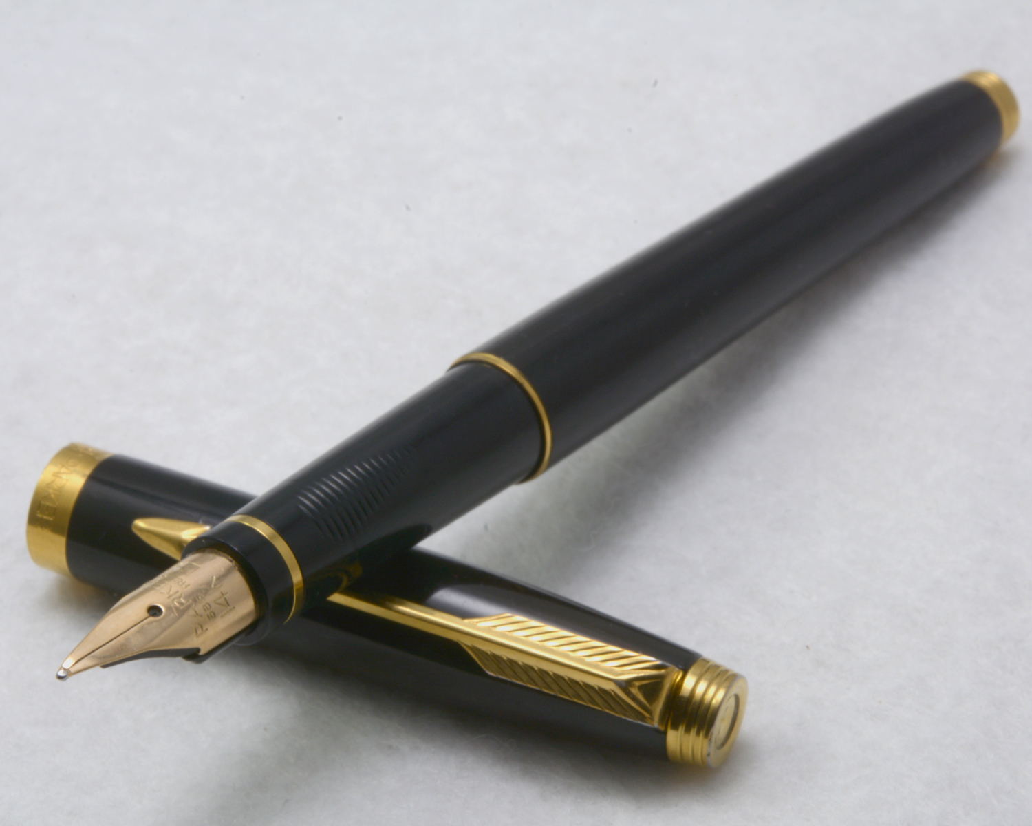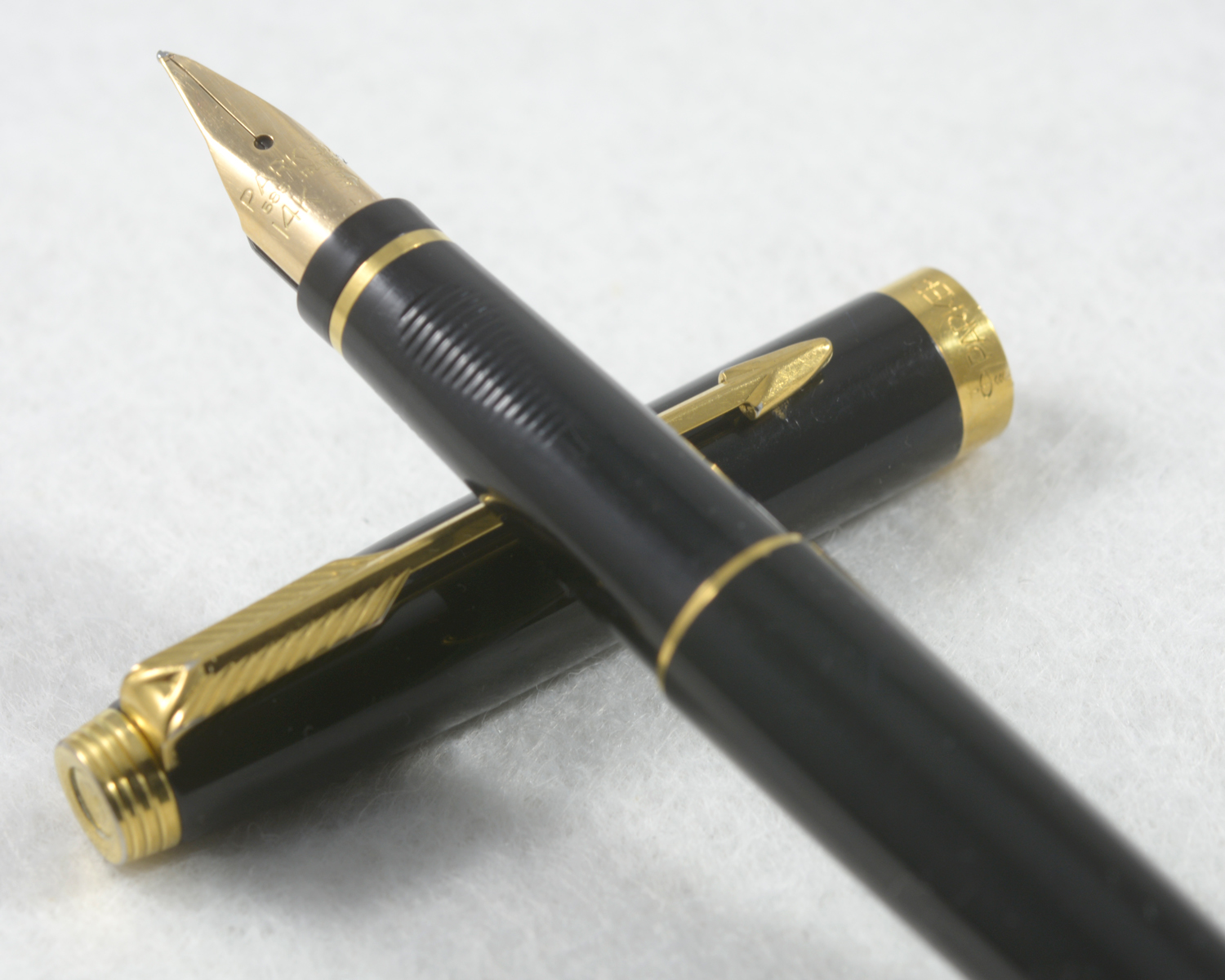 Nederst på huven finns en förgylld, 3,6 mm bred ring med präglad text: [logotyp] PARKER | FRANCE | IL