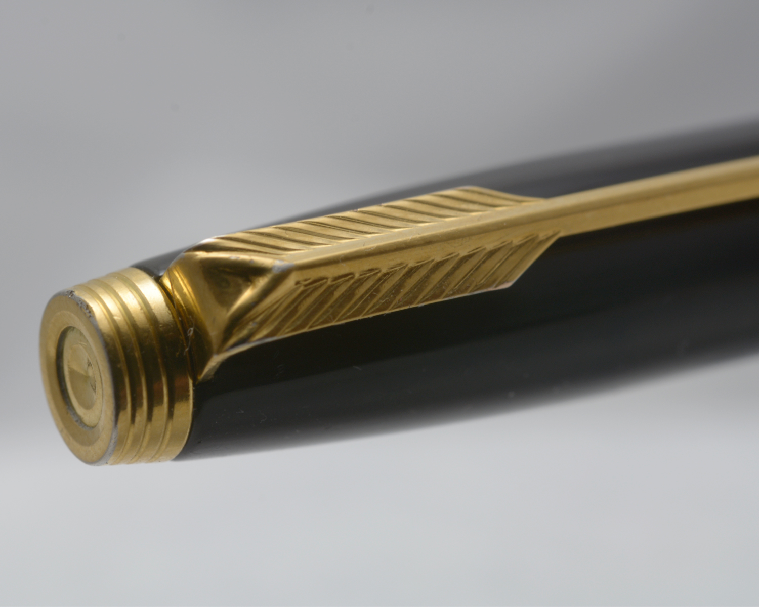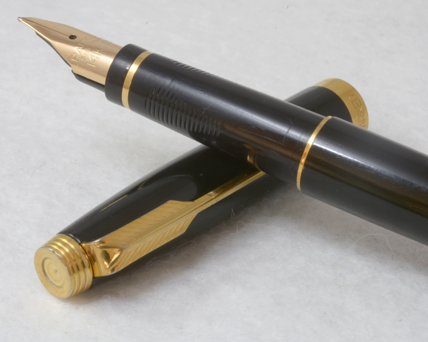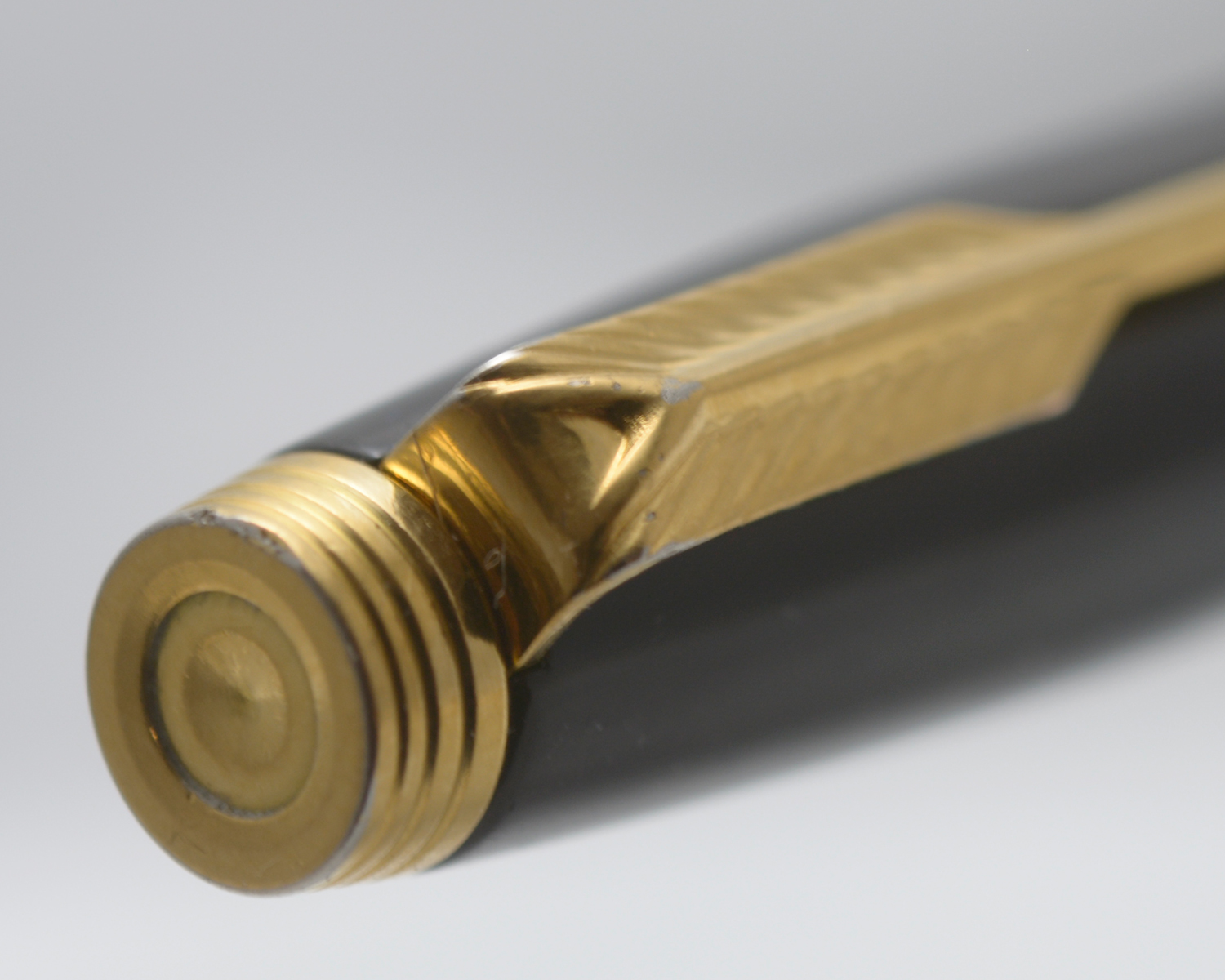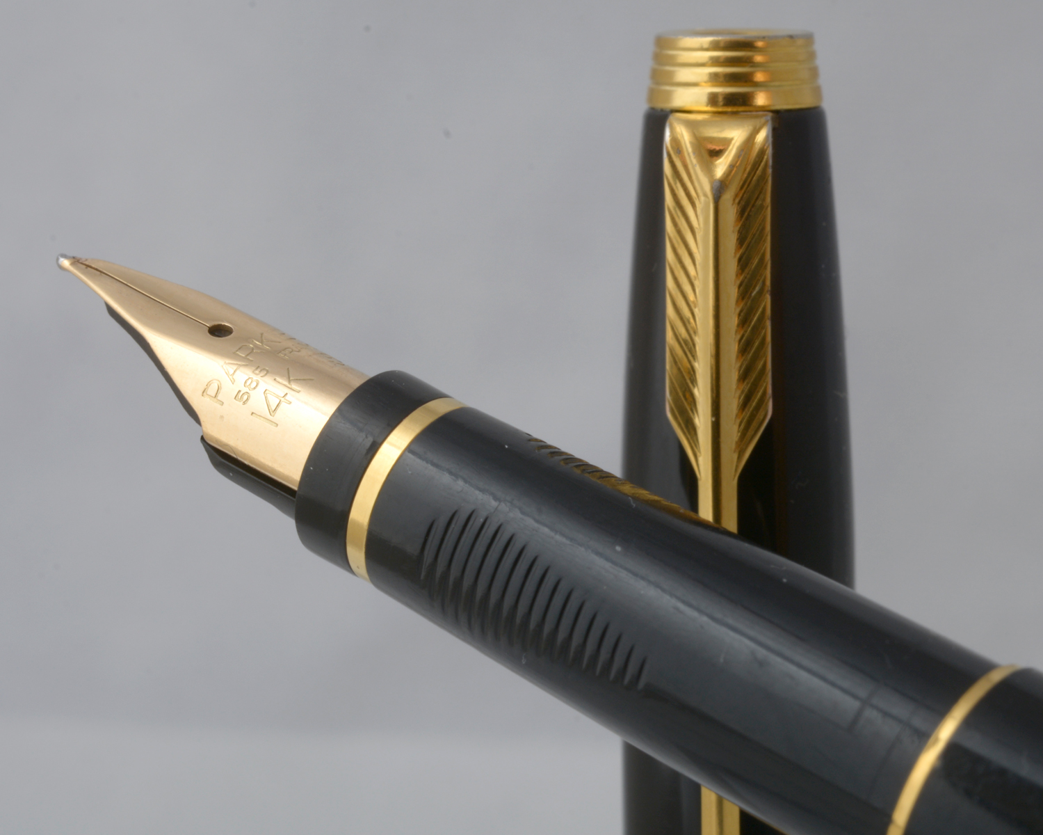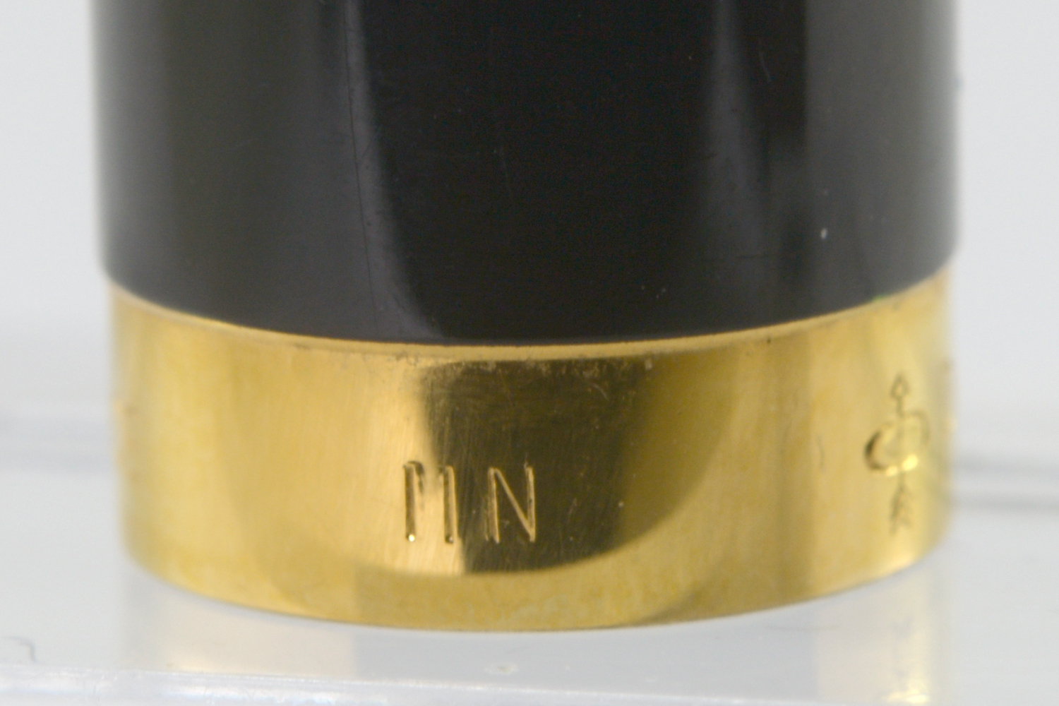 Nederst på huven finns en förgylld, 3,6 mm bred ring med präglad text: [logotyp] PARKER | FRANCE | IL