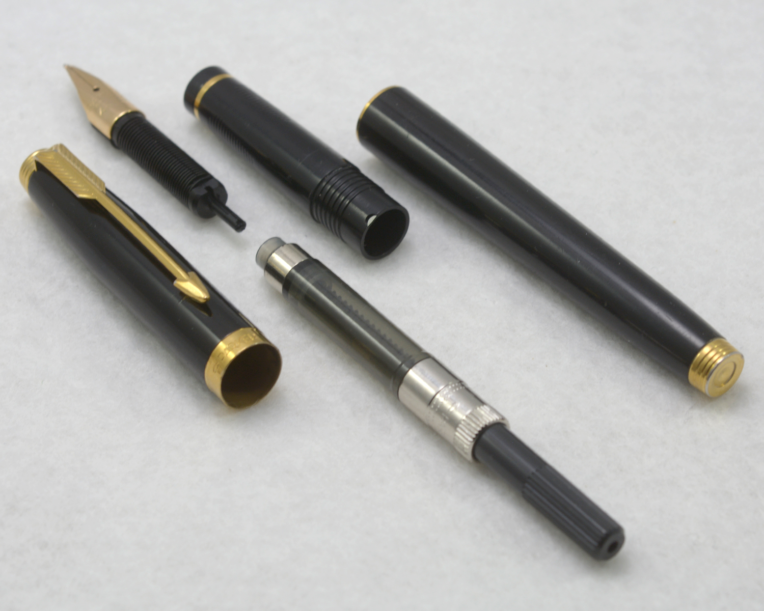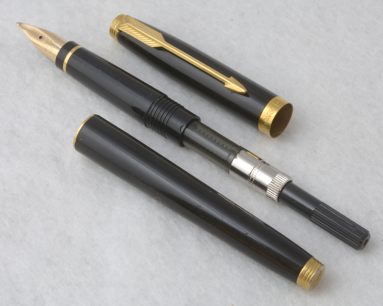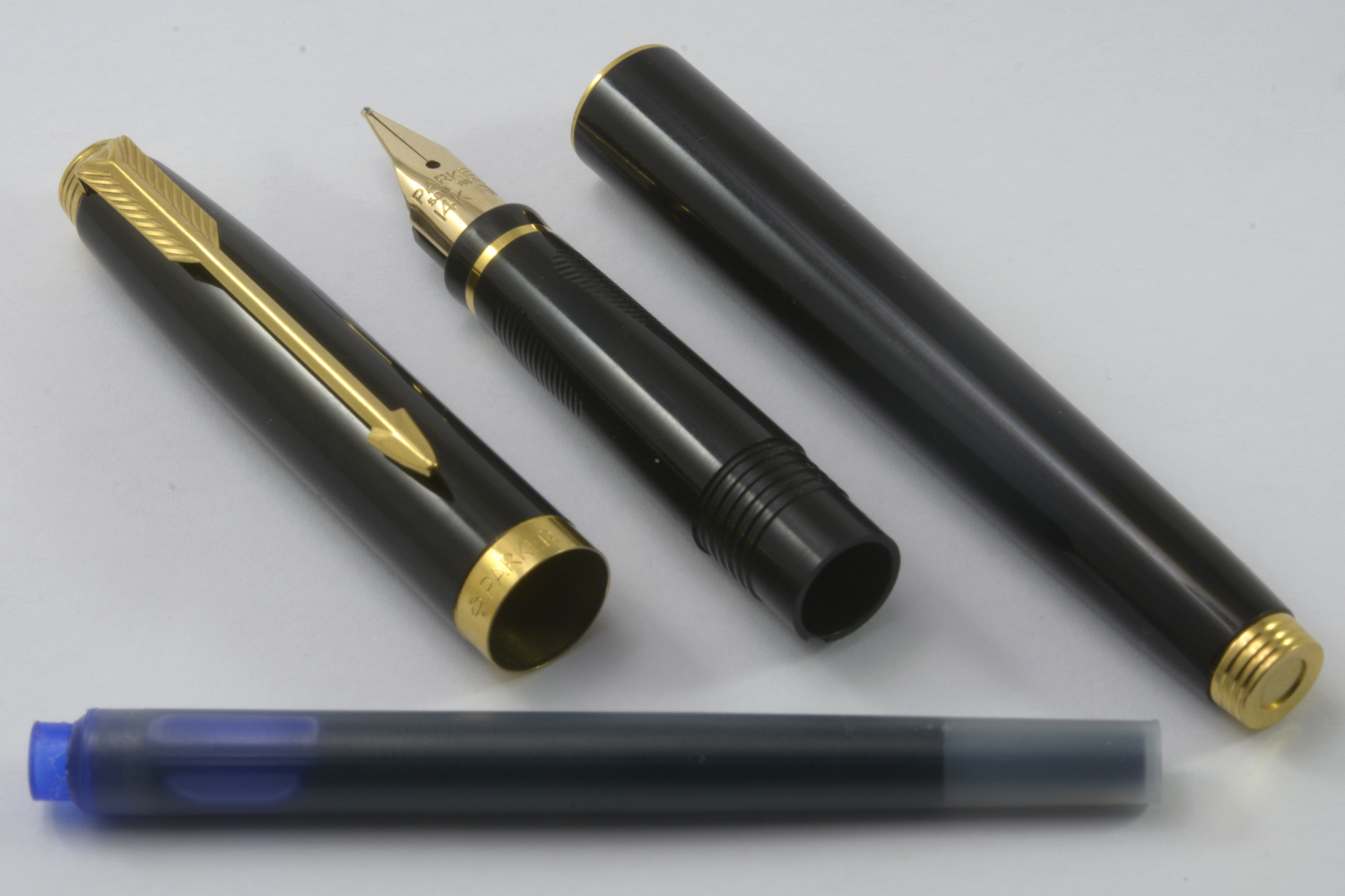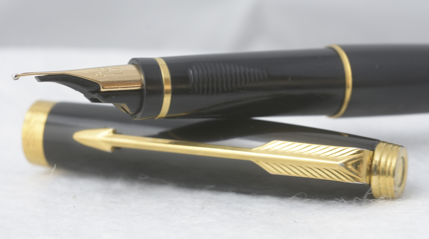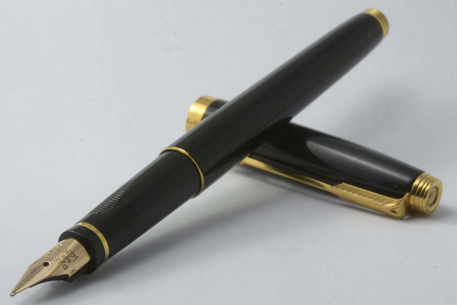 Nederst på huven finns en förgylld, 3,6 mm bred ring med präglad text: [logotyp] PARKER | FRANCE | IL