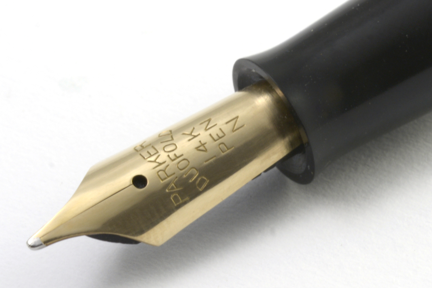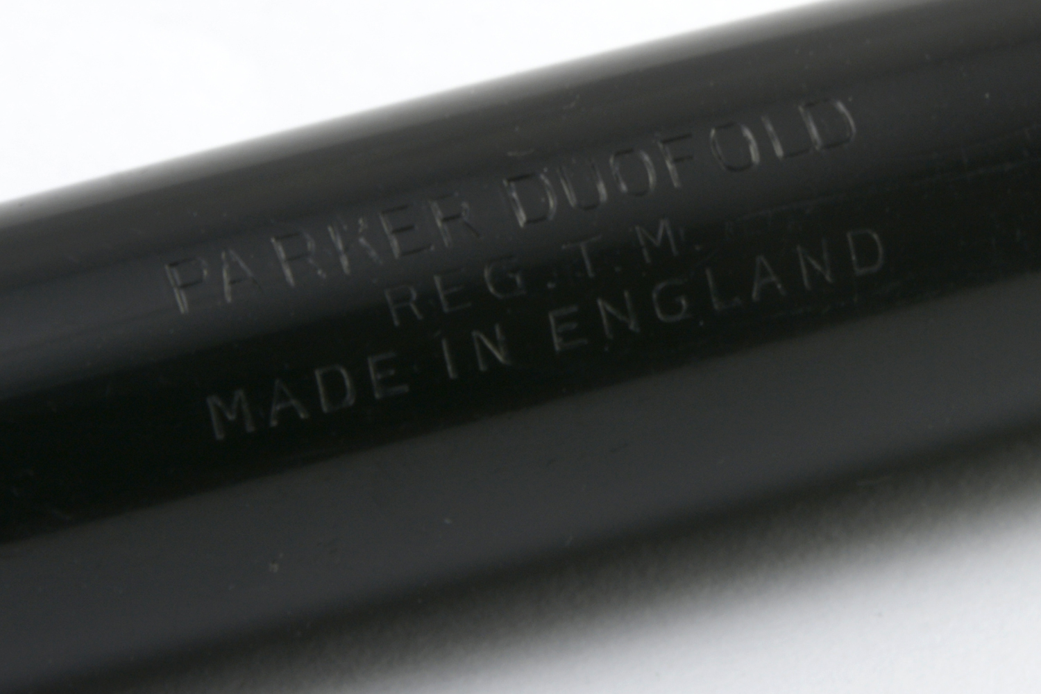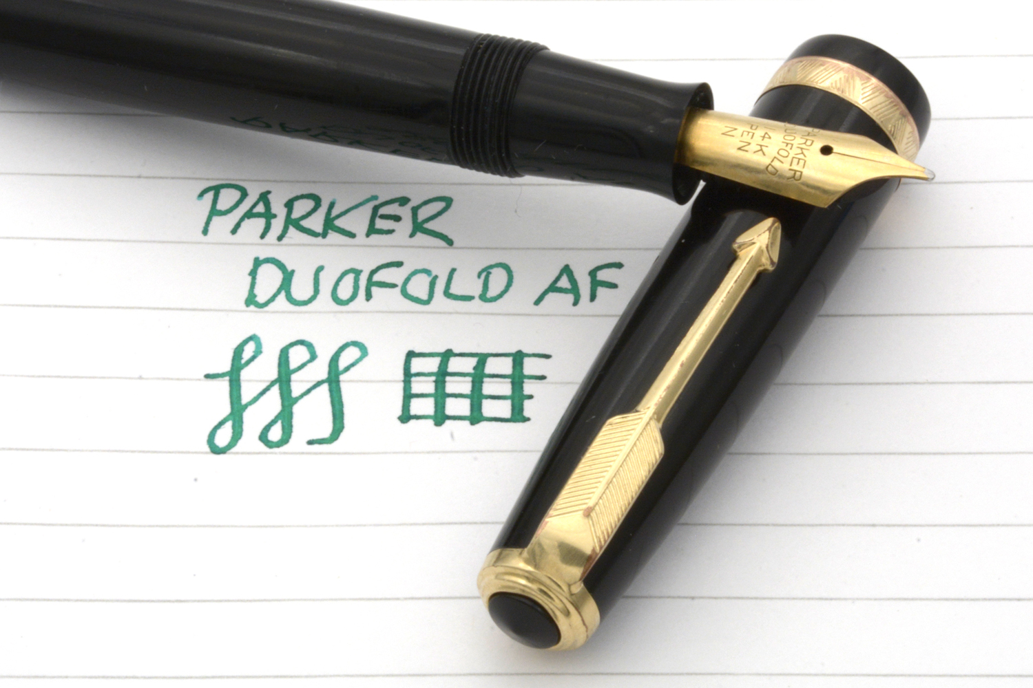 Denna renoverade och fullt fungerande svarta Parker Duofold AF är tillverkad i England omkring 1950. Pennan är en välbalanserad och skön pumptryckare i bra bruksskick med en lite sliten förgyllning på clips och huvring, något som dock endast syns med lupp. Det är en välbalanserad och skön skrivare med ett lite styvare originalguldstift som vid lätt spetstryck skriver mjukt och följsamt med M-bredd. Noterbart är att denna penna har en gulfärgad »pumpknapp». Pennans längd: 130,5 mm. Vikt: 17,0 gram.