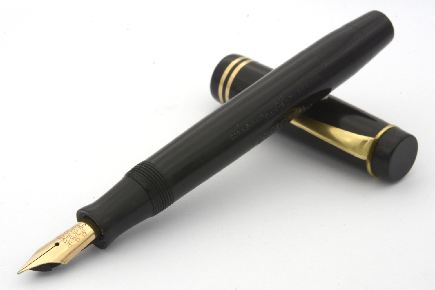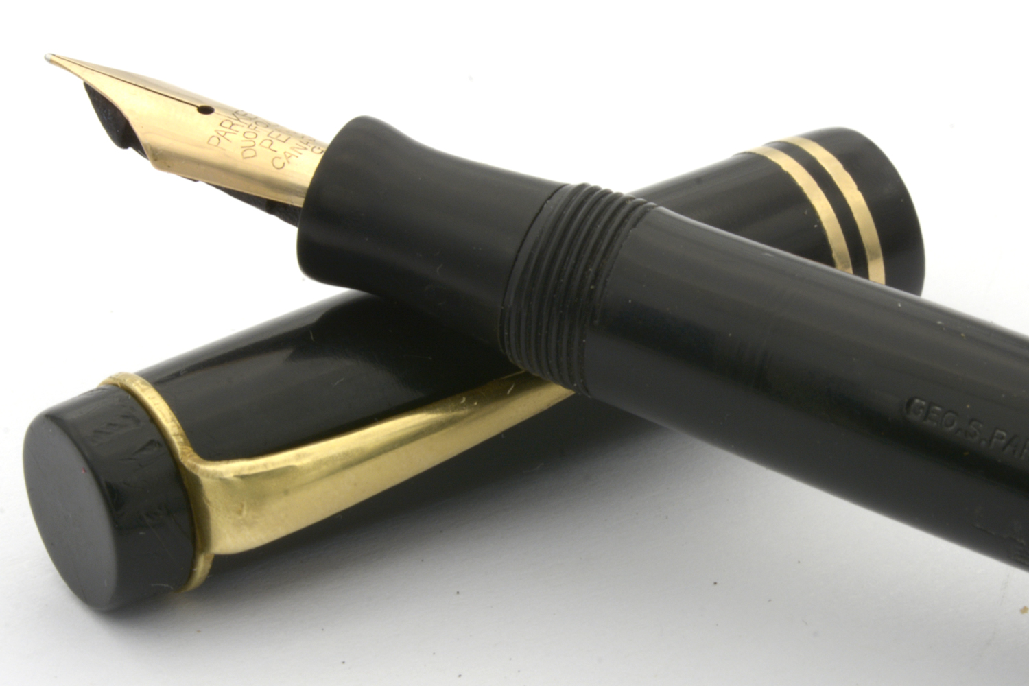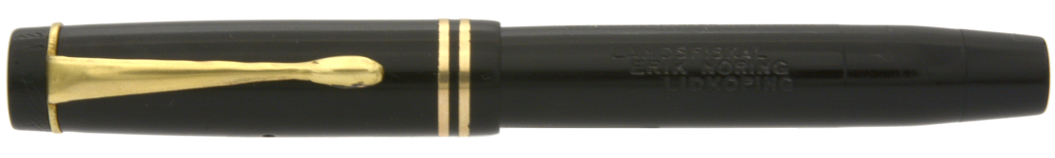 Denna renoverade och fullt fungerande svarta Parker Duofold Junior är en så kallad »Streamlined Long», den längre av Duofold Junior-modellerna, tillverkad under tidigt 1930-tal och inhandlad av dåvarande landsfiskalen i Lidköping, Erik Noring.