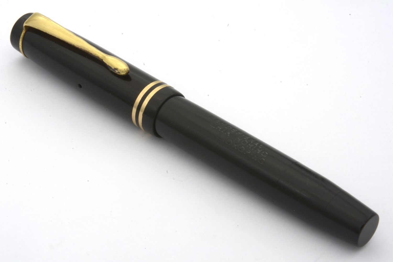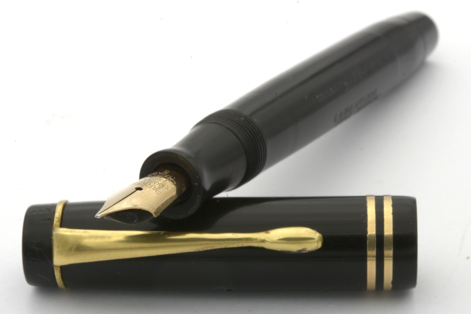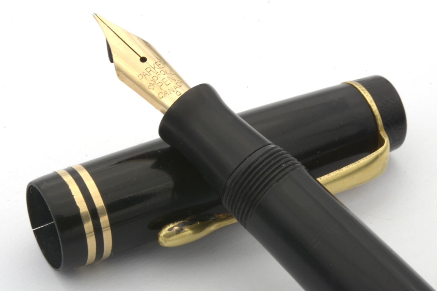 Denna renoverade och fullt fungerande svarta Parker Duofold Junior är en så kallad »Streamlined Long», den längre av Duofold Junior-modellerna, tillverkad under tidigt 1930-tal och inhandlad av dåvarande landsfiskalen i Lidköping, Erik Noring.