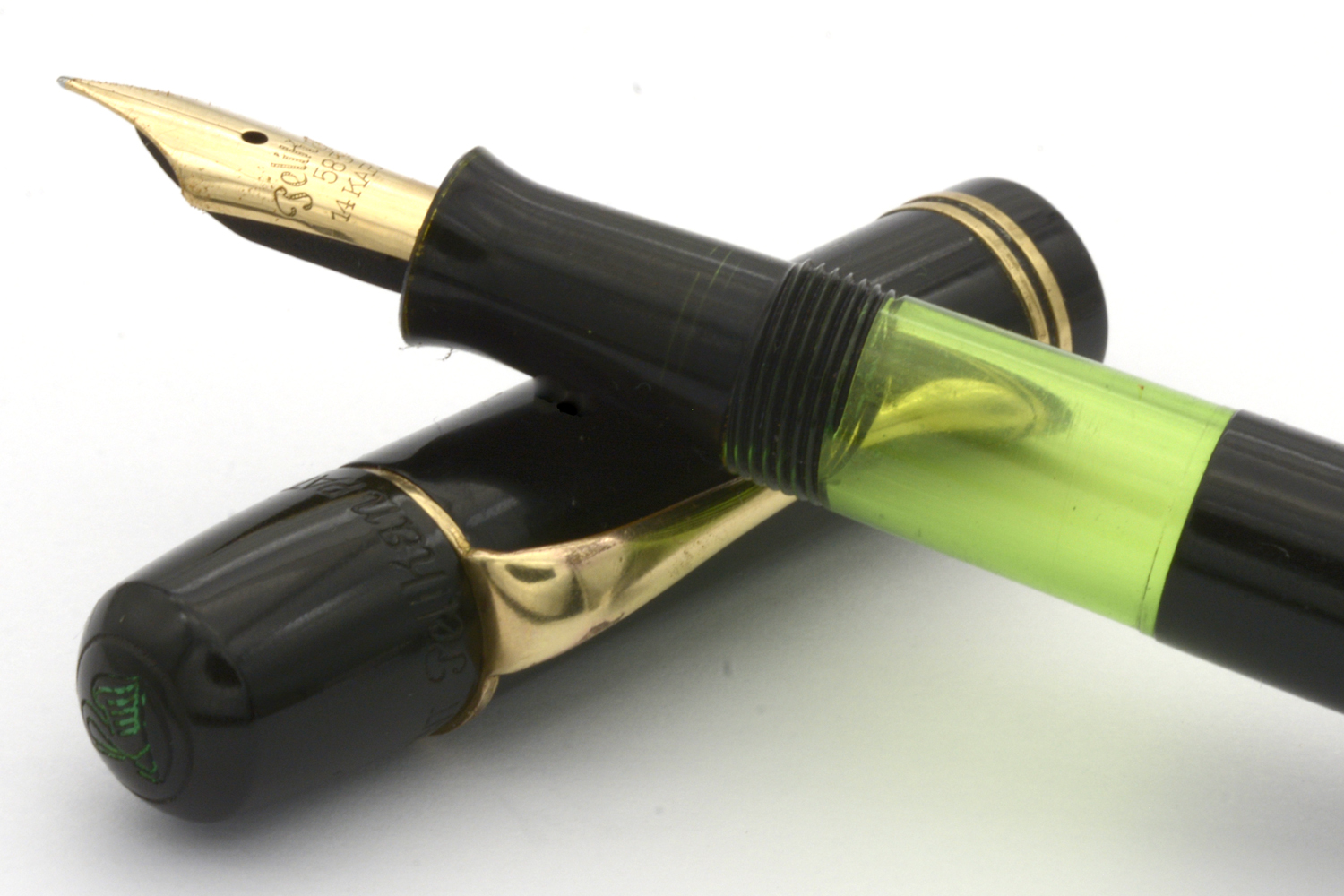 Denna (personifierade) Pelikan är tillverkad mellan 1937-1940, något jag baserar på att a) stiftets text »585» och b) toppskruvens pelikan-logotyp lanserades 1937 samt att pistongmekanismens knopp fortfarande har räfflor. Den senare gavs en len yta 1940. Senare än 1942 är pennan inte tillverkad eftersom Pelikan då ersatte pistongmekanismens kork med plast.