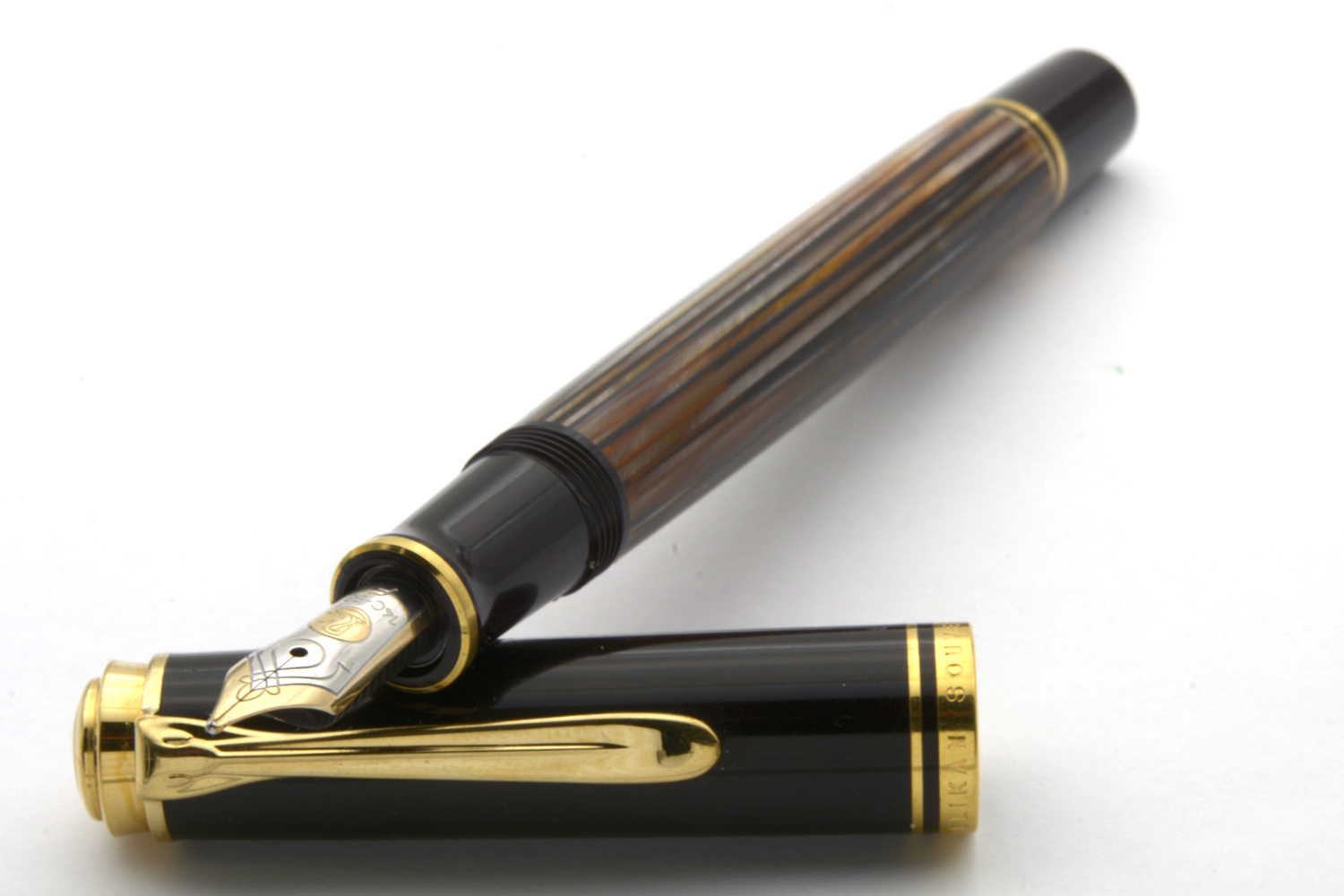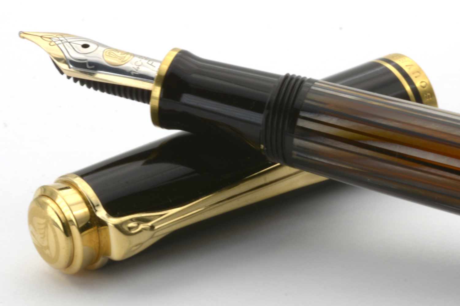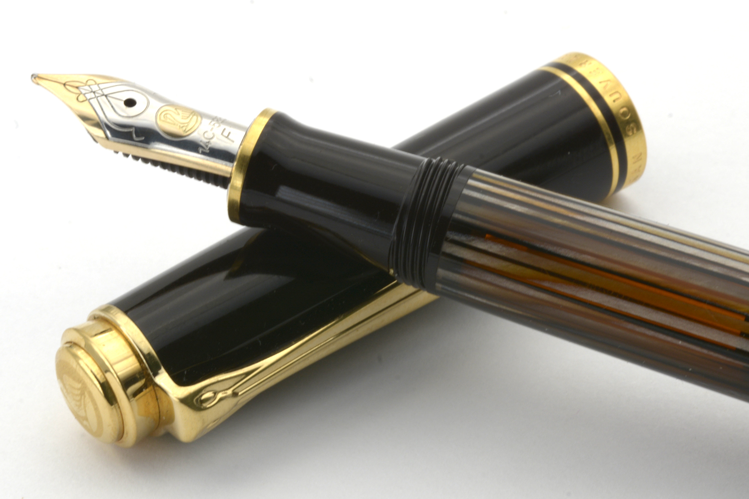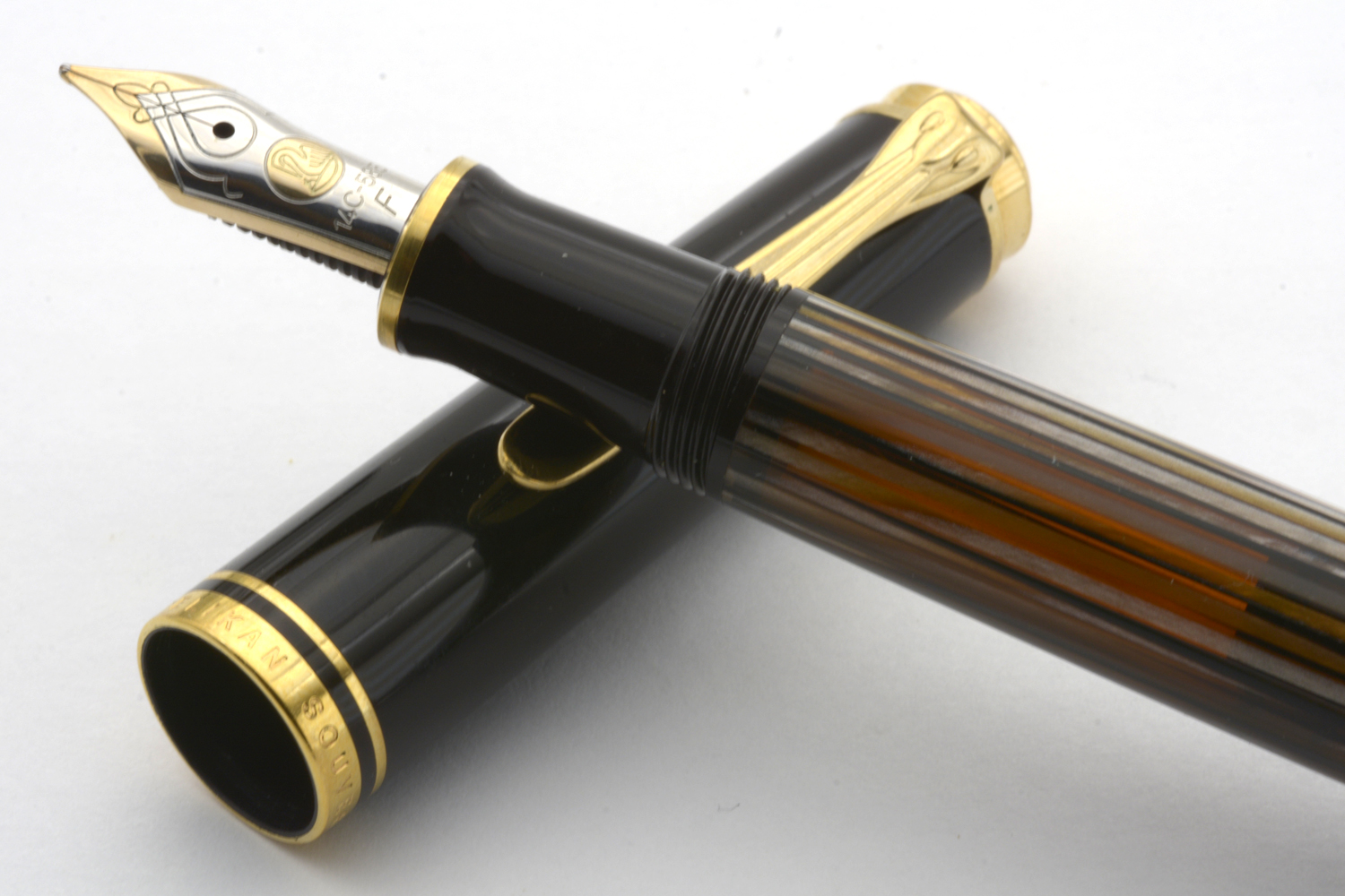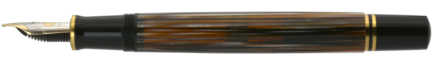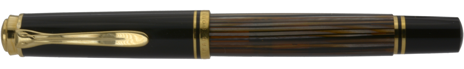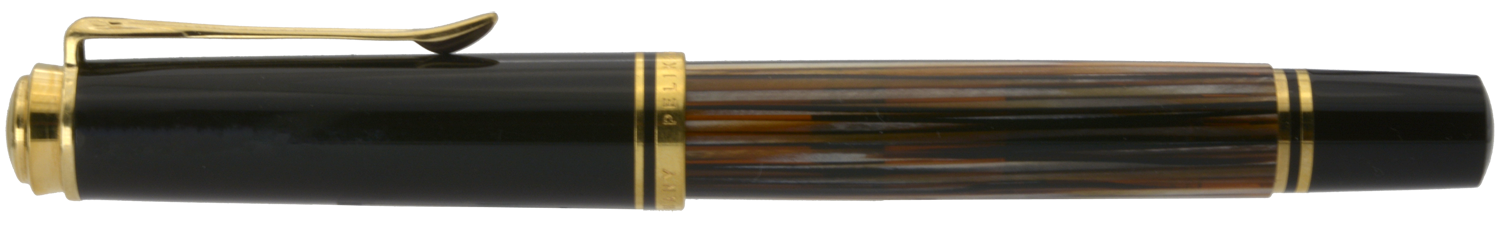Denna Souverän M400 Tortoiseshell-Brown släpptes i en specialutgåva i september 2016 och såldes därefter under en begränsad tid med ett rekommenderat försäljningspris på 340 euro. Pennan har den ikoniska brunrandiga behållaren med orange ränder av cellulosaacetat och är försedd med clips och ringar pläterade med 24 karats guld och ett tvåfärgat guldstift.