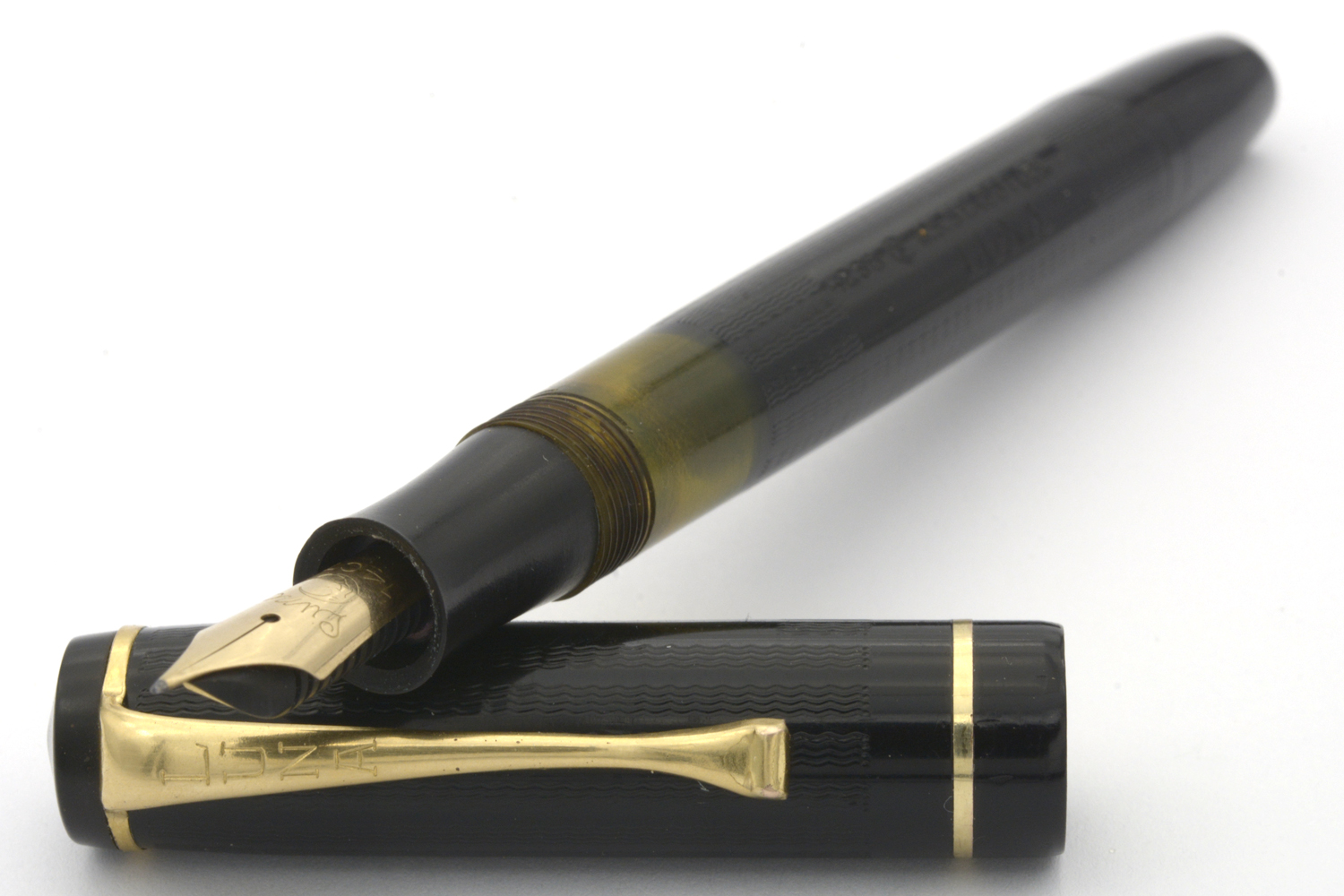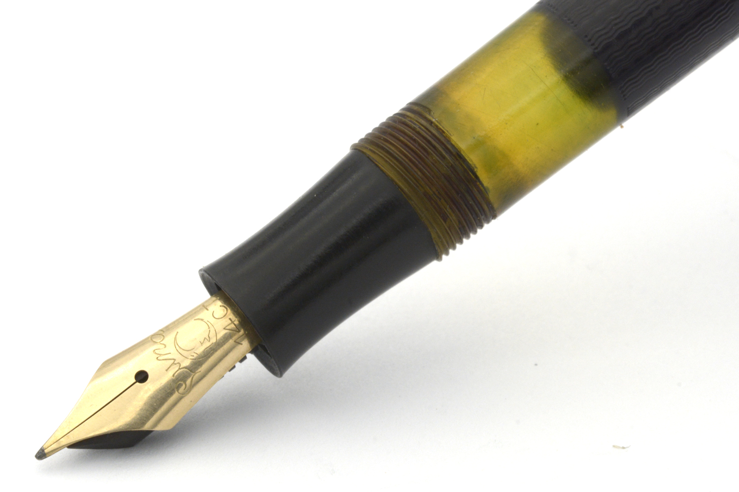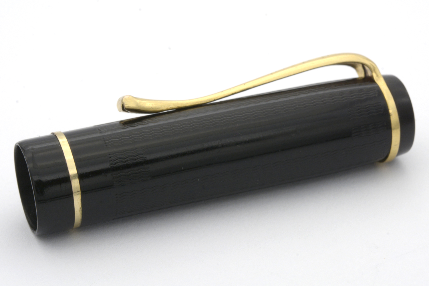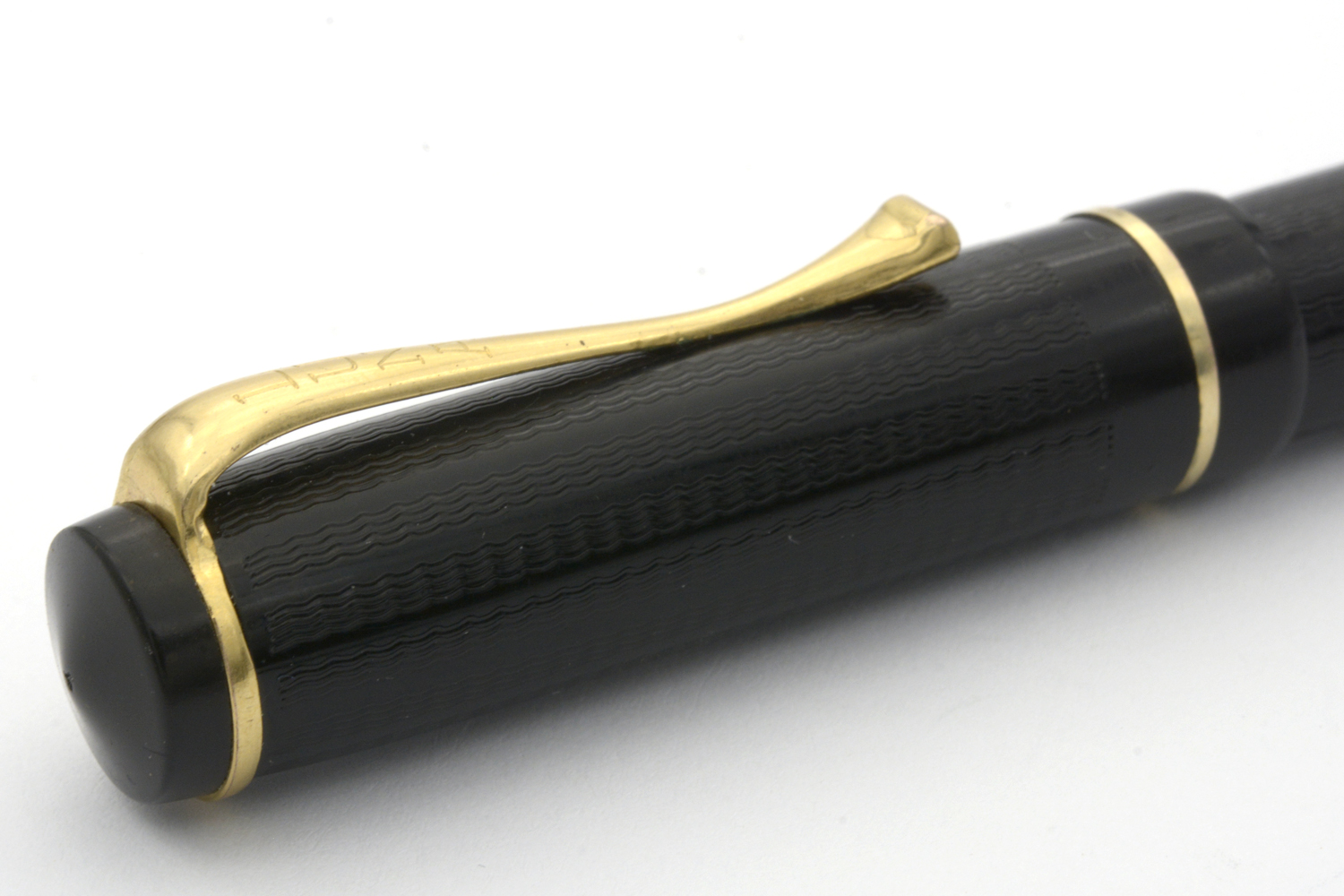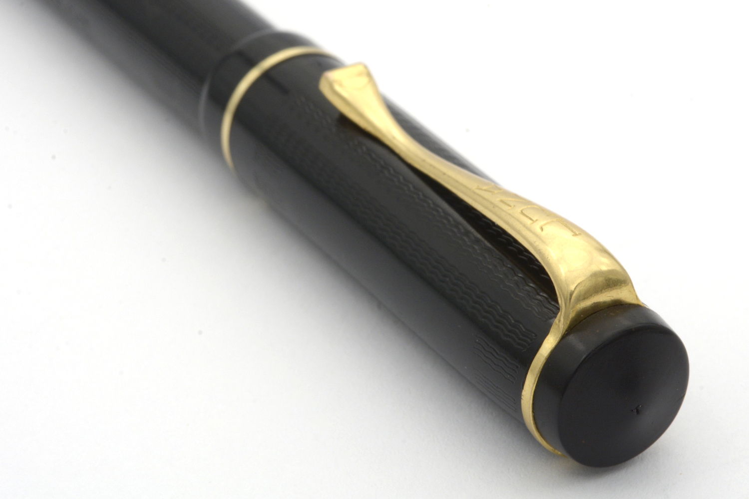 Pennans bläckfönster bär spår av gammalt bläck som jag inte lyckats få bort, men i övrigt är pennan exteriört sett i riktigt fint skick med en riktigt god förgyllning på clips och huvring och tydlig prägling på behållaren. Den enda lilla egenhet jag hittat på pennan är att det samlas en liten droppe bläck på stiftets vänstra »vinge» när pennan legat ett tag, något som eventuellt kan kommer från bläck som samlats inne i huven. Huruvida dessa droppar kvarstod efter att huven rengjorts vet jag inte eftersom pennan då lånades ut.